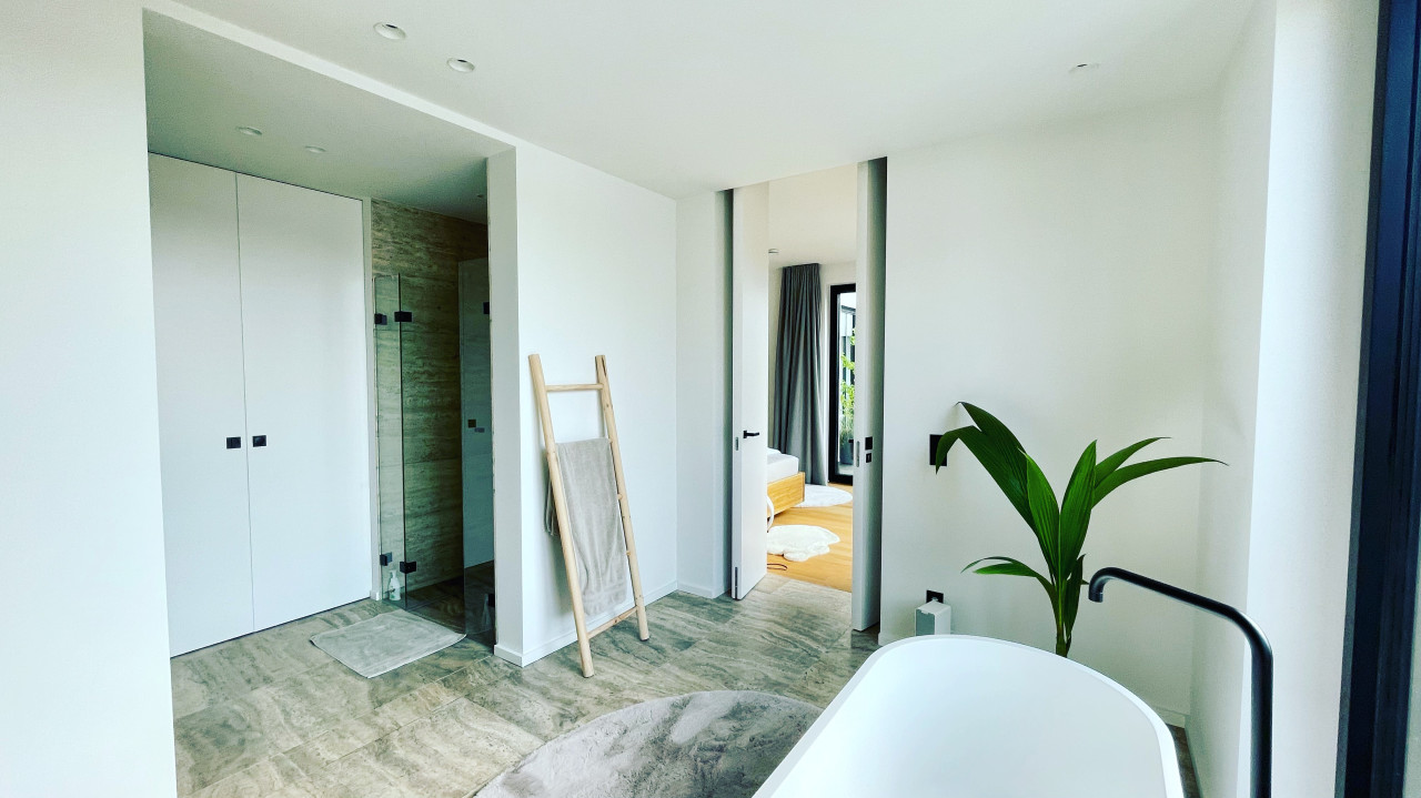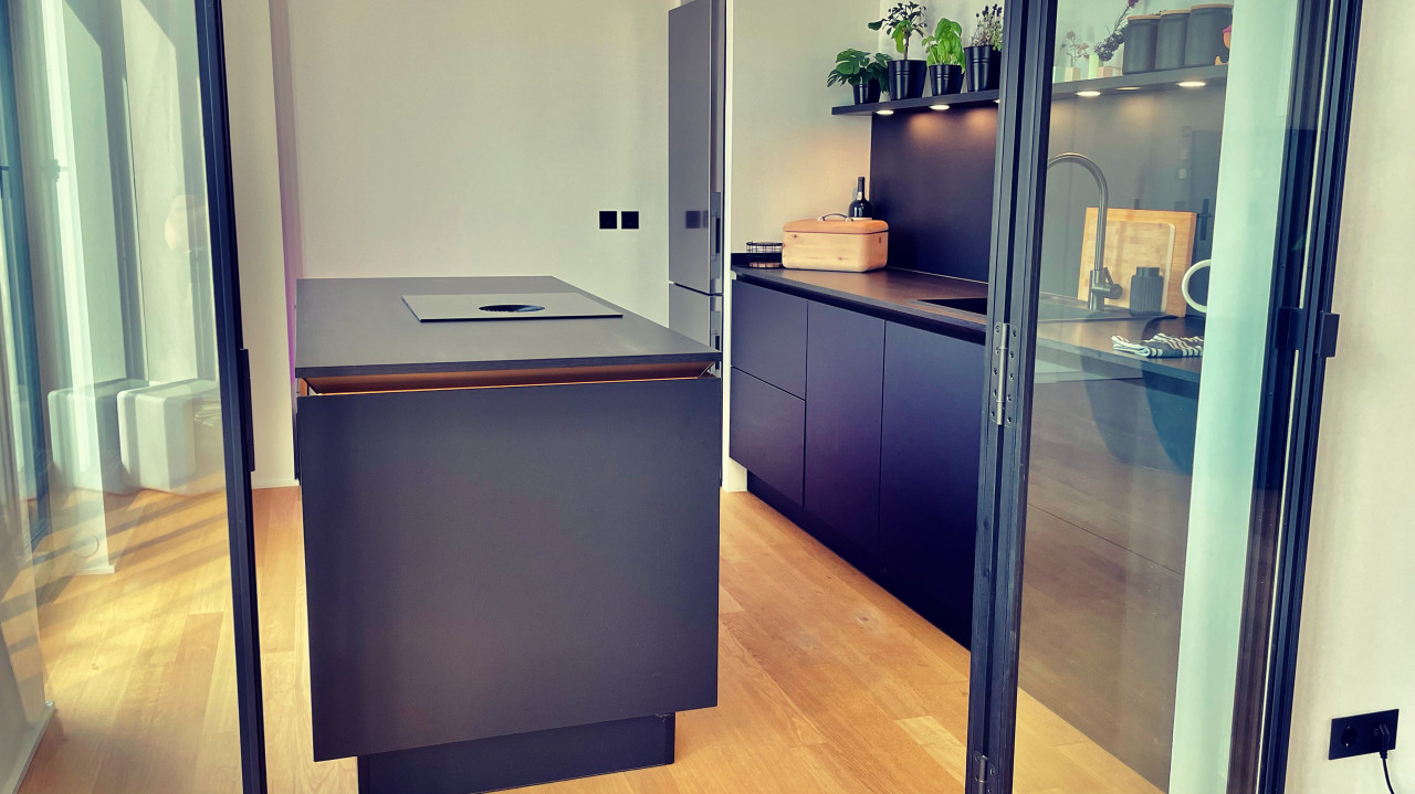 Charming elements like the custom-made slender steel profiles of the floor-to-ceiling doors and the hand-stained oak floors create a distinctive look: warm and elegant, delicate yet reminiscent of industrial styles. A carefully curated selection of durable materials enhances the unique features of the spacious interiors.