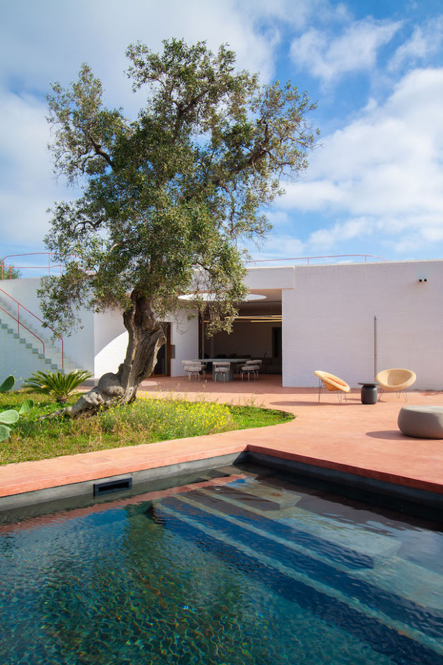 Outside, the ambiance shifts to a more dramatic, yet equally inviting atmosphere with a luxurious poolside accented by lush vegetation, lounge chairs, and green cacti framing the striking blue waters of the swimming pool. A rooftop gathering area, complete with a white table, cylindrical stools, and a chess set, offers a perfect venue for enjoying breathtaking sunsets and panoramic landscape views. Whether it's relaxing by the pooling, engaging in a sunset chess game, or enjoying a cup of tea in the serene kitchen, this property ensures every moment at home is imbued with luxury, comfort, and beauty.