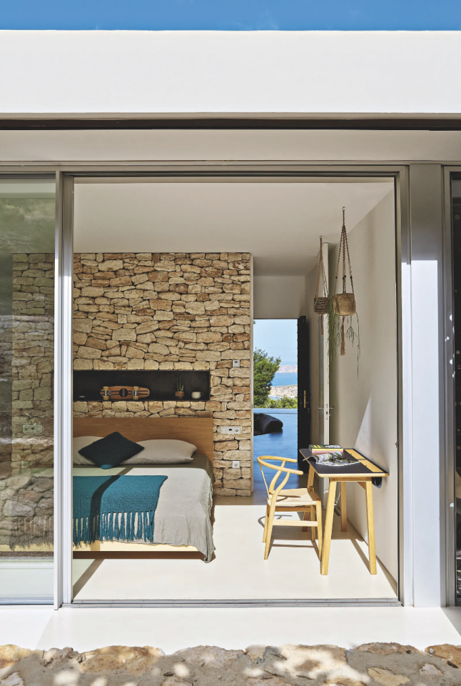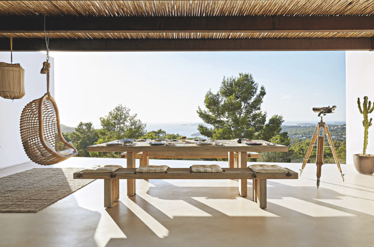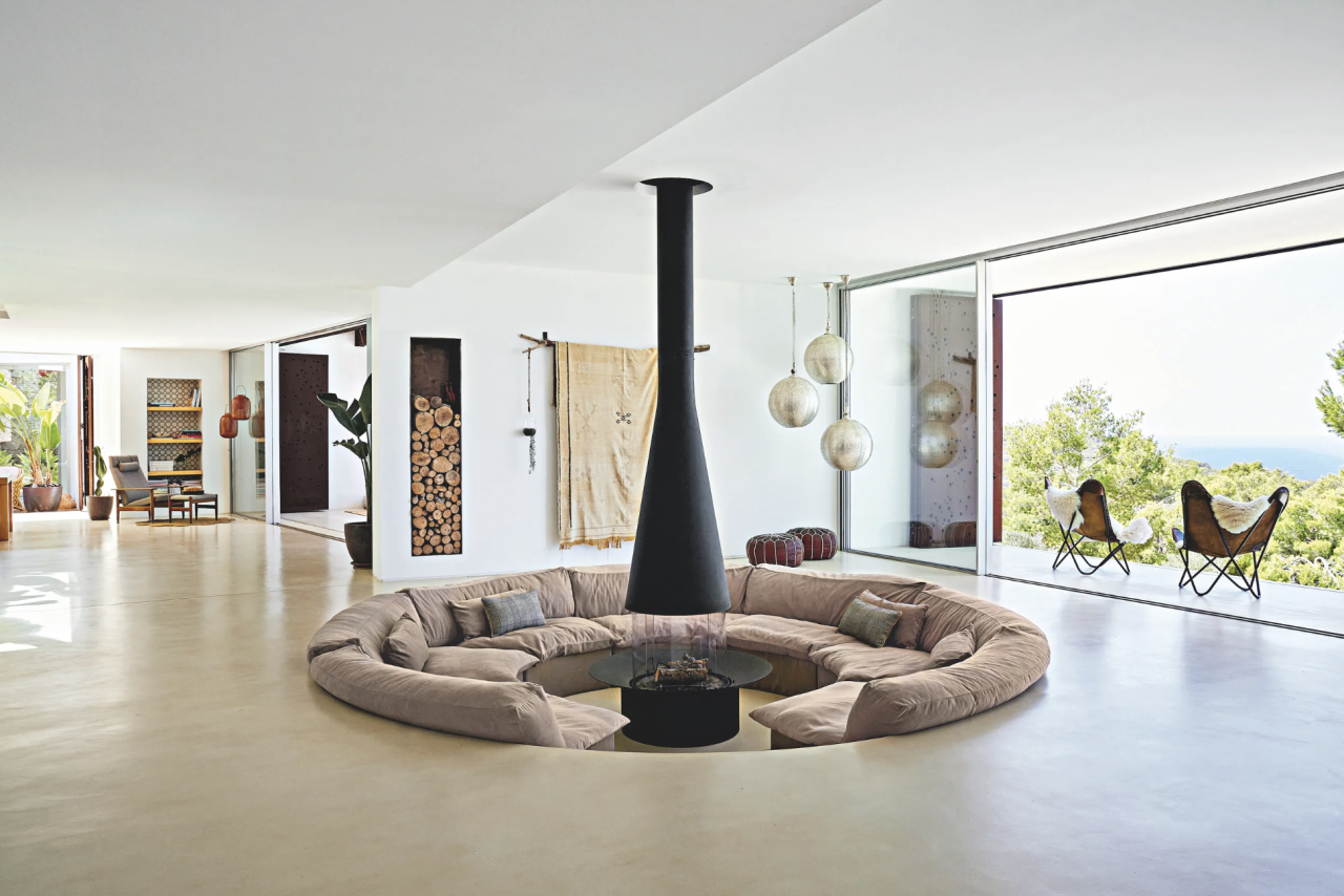 This unique villa is carefully nestled on top of a small hill in southwest coast of the island of Ibiza. The architecture and design of the villa is open and inviting creating a prefect frame to enjoy the breathtaking views. When the sliding glass walls are opened the interior and exteriors blend seamlessly. All the rooms are beautifully decorated and the communal areas are open and diaphanous with a custom made circular sofa surrounding a hanging chimney at its core.