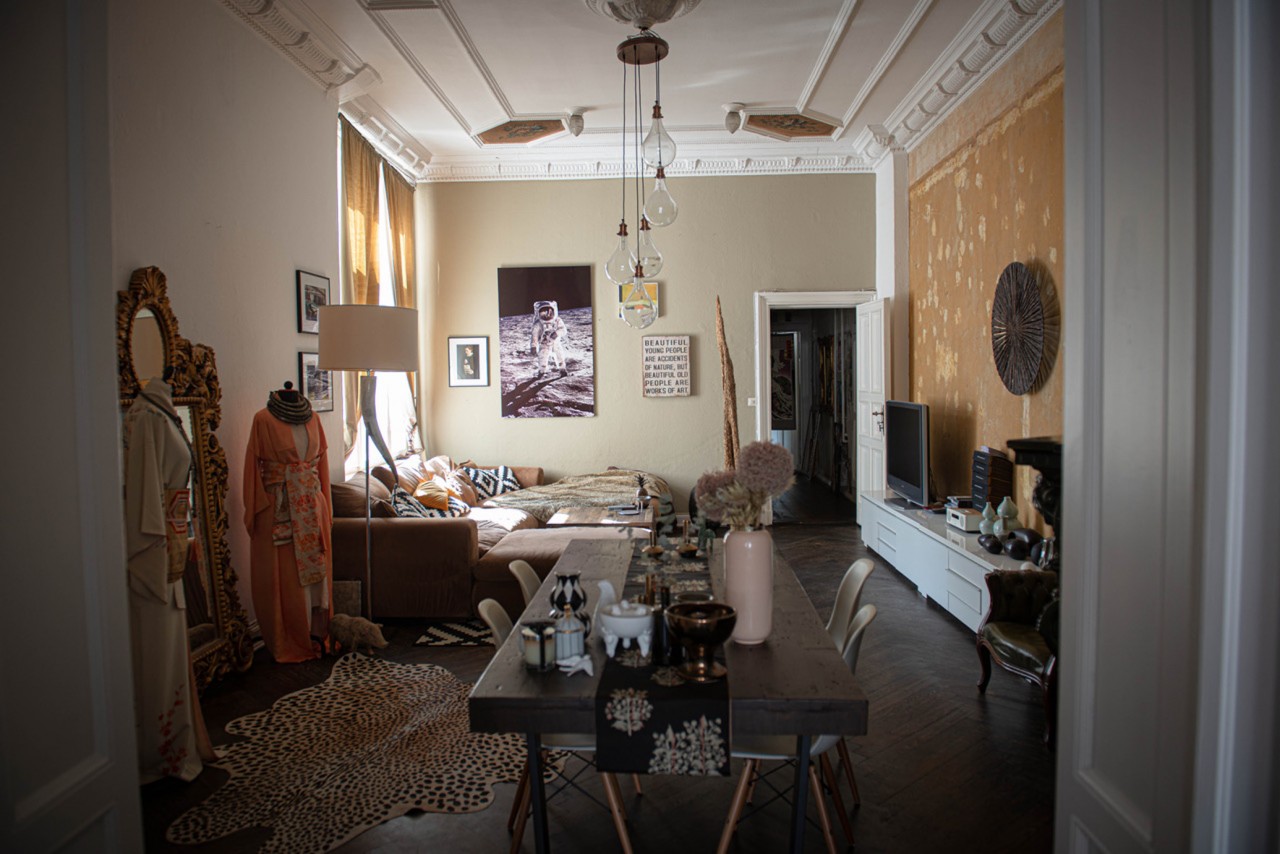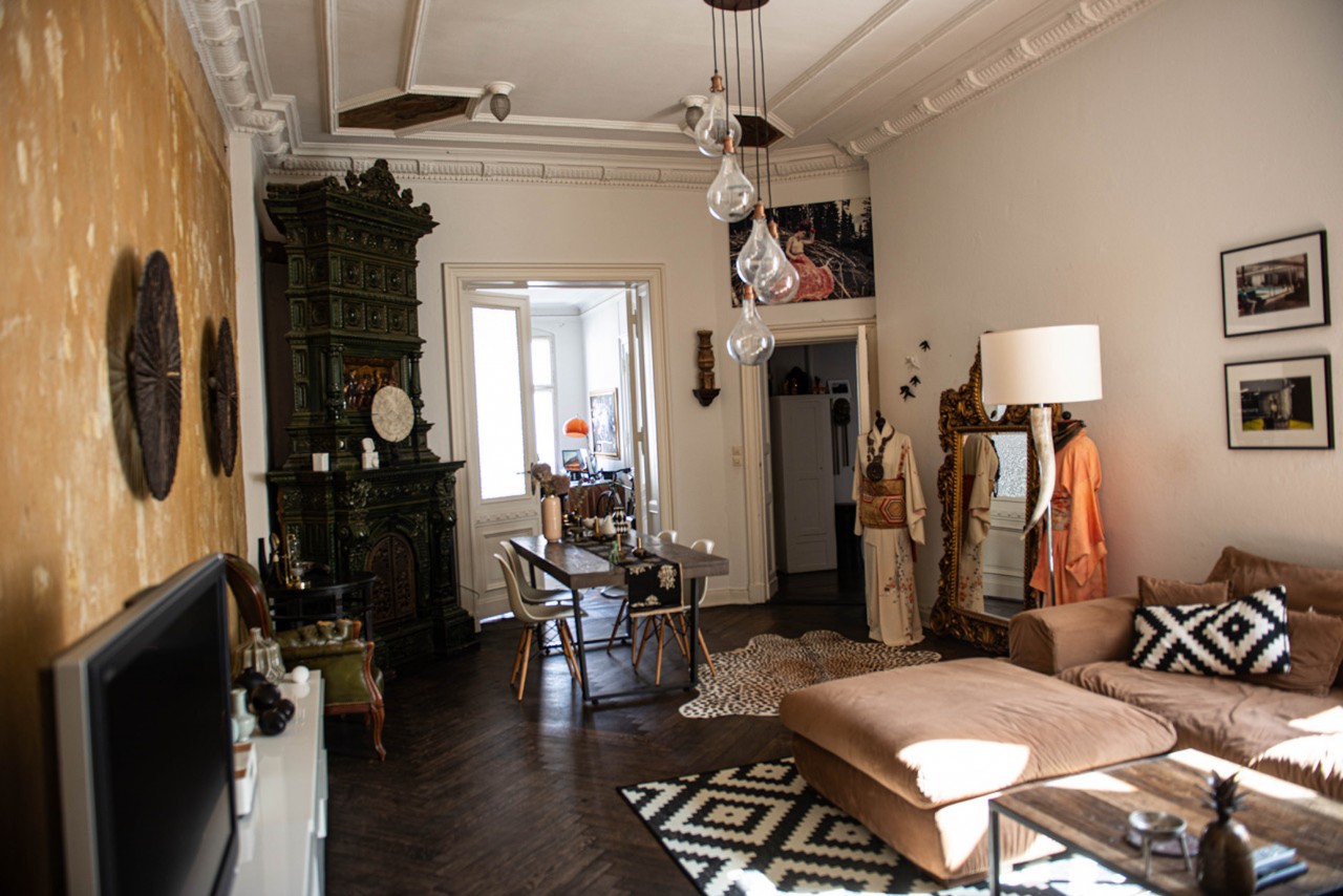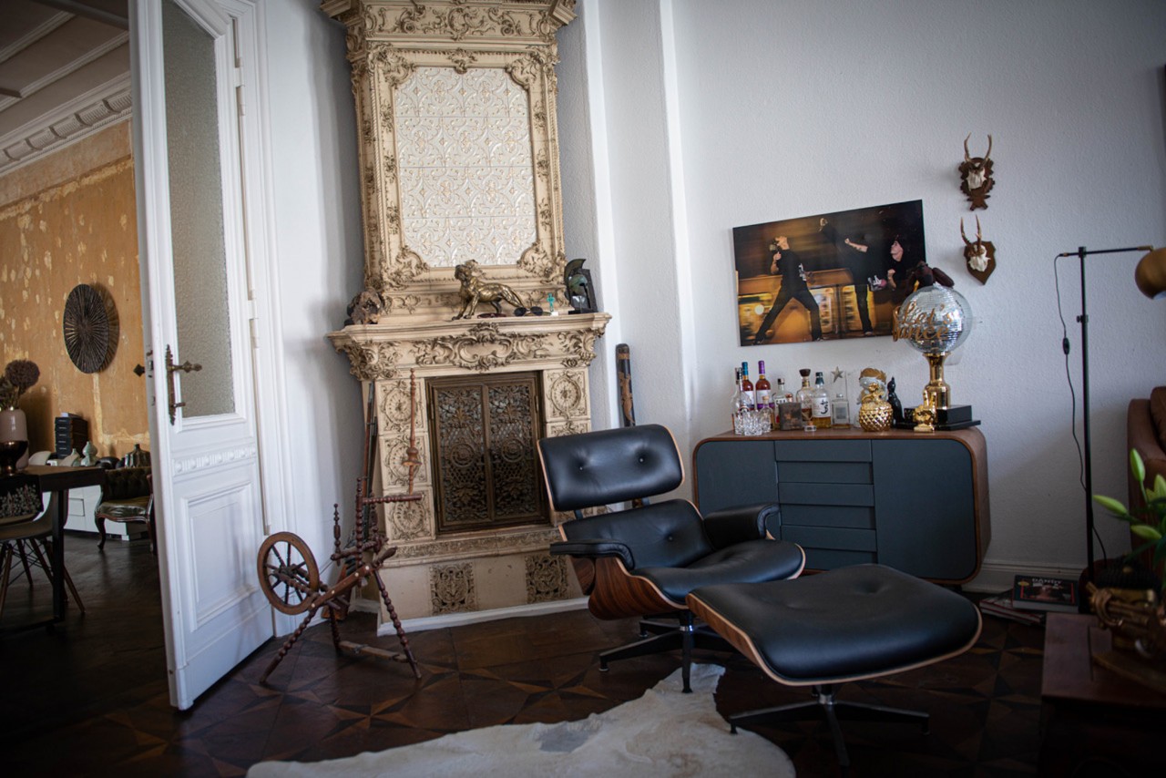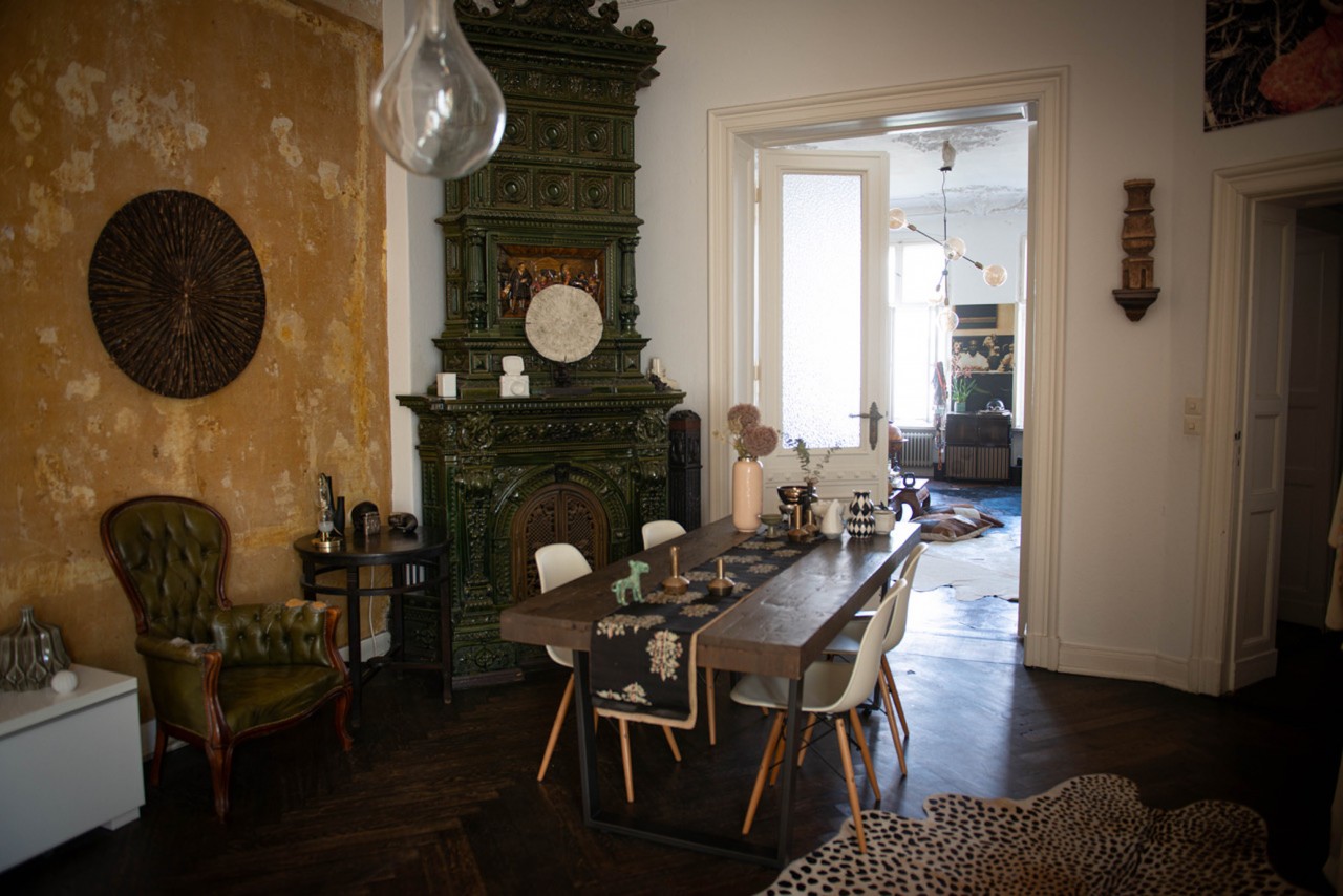 Walking into this classic West Berlin apartment is an adventure of its own: a long hallway connects two large common rooms, a smaller office/library, and two bedrooms, eventually leading around the corner into the dining room. Each room is meticulously decorated, telling a story of its own, and their high ceilings, adorned with dramatic stucco, create a feeling of elegance and grandeur. The historic stoves are complemented by the furniture, consisting of a mix of design classics and some unique pieces from around the world.