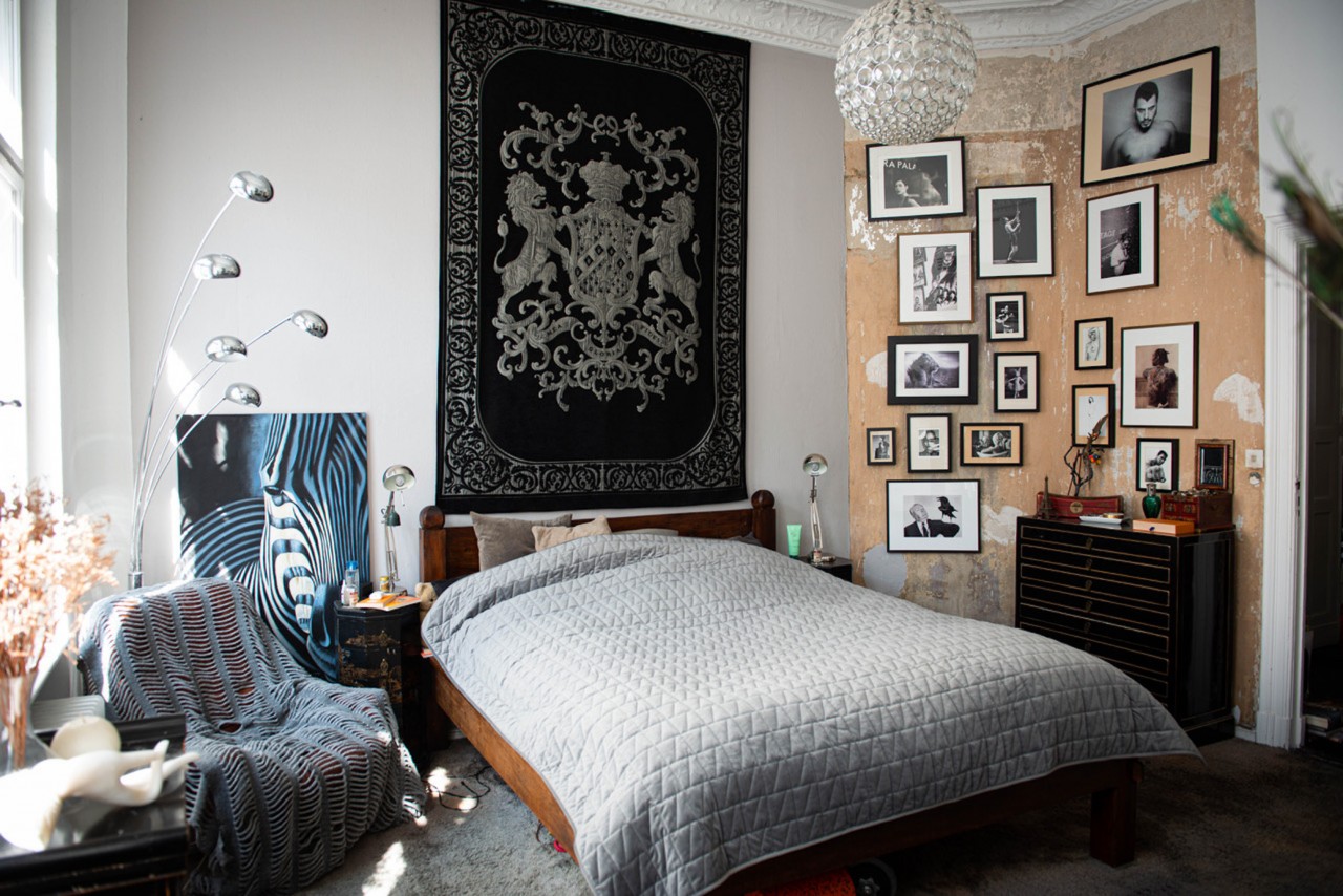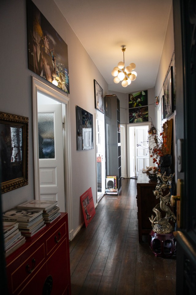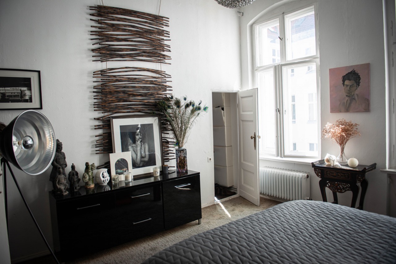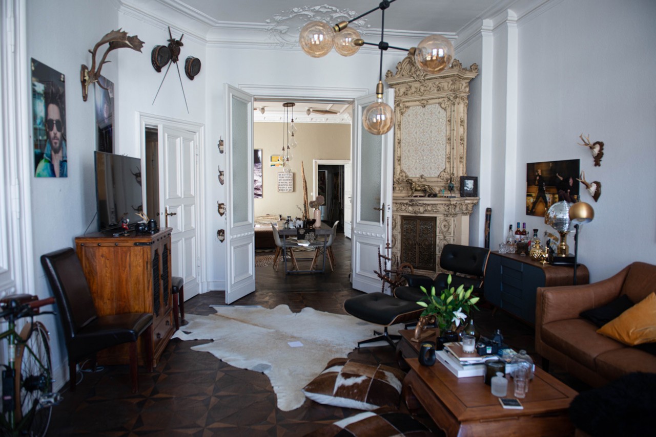 Walking into this classic West Berlin apartment is an adventure of its own: a long hallway connects two large common rooms, a smaller office/library, and two bedrooms, eventually leading around the corner into the dining room. Each room is meticulously decorated, telling a story of its own, and their high ceilings, adorned with dramatic stucco, create a feeling of elegance and grandeur. The historic stoves are complemented by the furniture, consisting of a mix of design classics and some unique pieces from around the world.