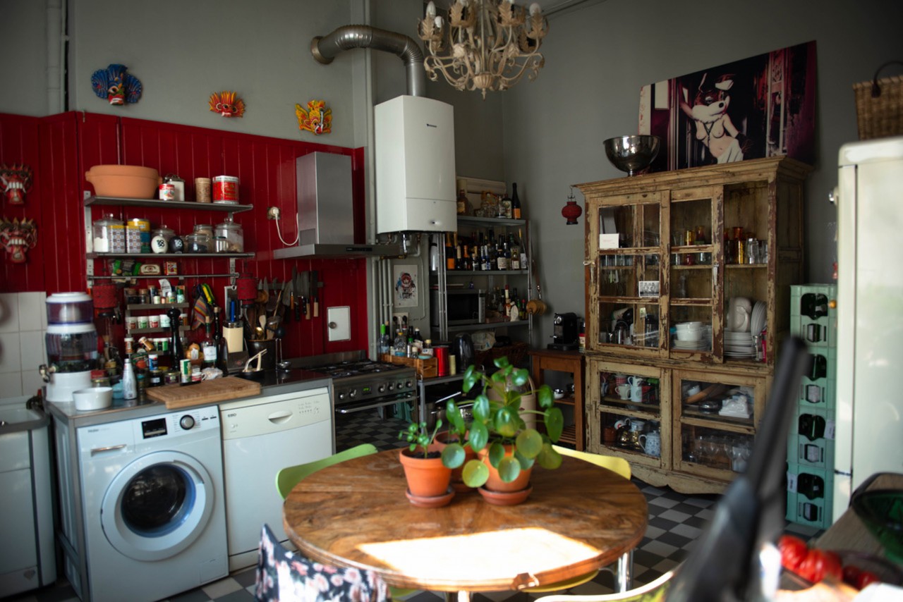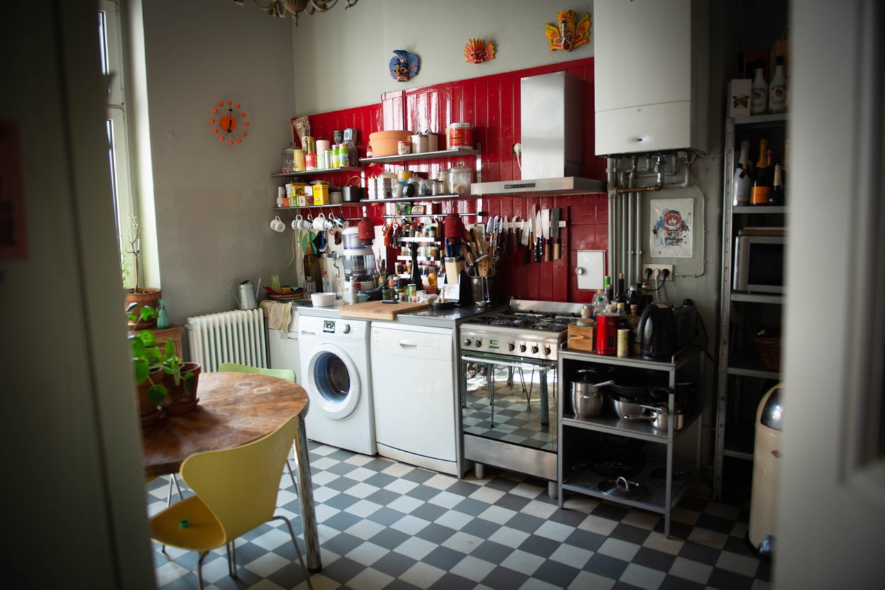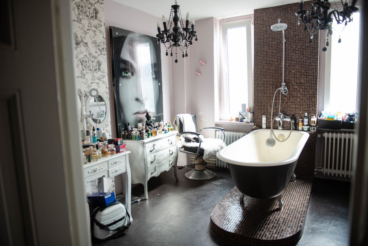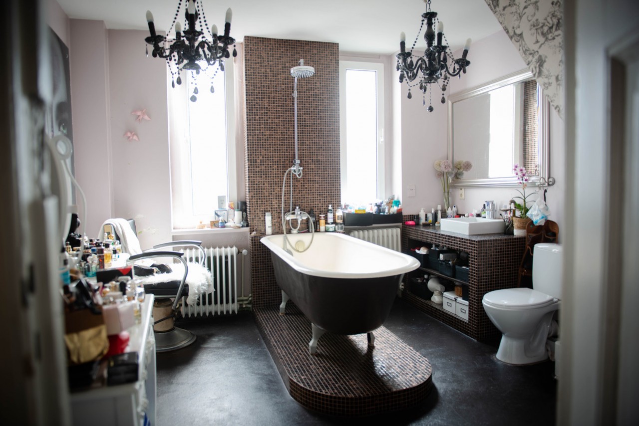 Walking into this classic West Berlin apartment is an adventure of its own: a long hallway connects two large common rooms, a smaller office/library, and two bedrooms, eventually leading around the corner into the dining room. Each room is meticulously decorated, telling a story of its own, and their high ceilings, adorned with dramatic stucco, create a feeling of elegance and grandeur. The historic stoves are complemented by the furniture, consisting of a mix of design classics and some unique pieces from around the world.