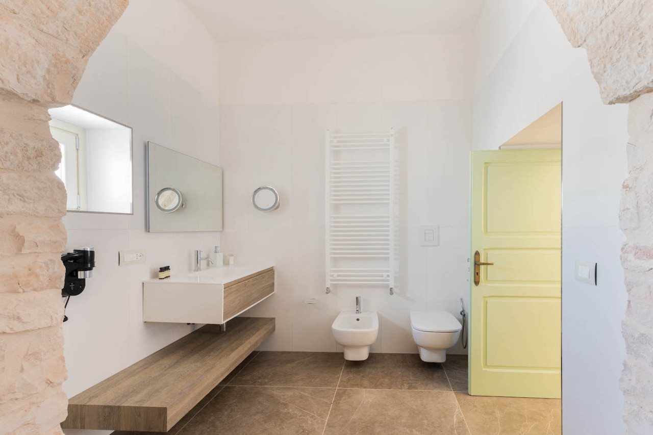 The sleeping area is in the trulli part and includes 4 bedrooms, all with en-suite bathrooms, and a service kitchen very useful for breakfast.