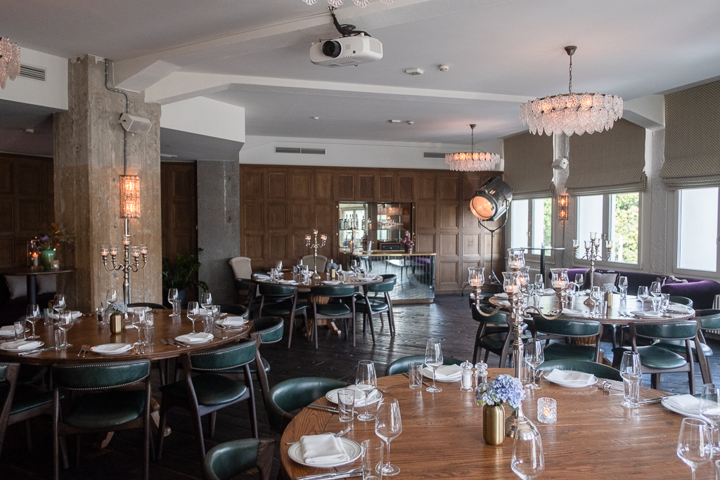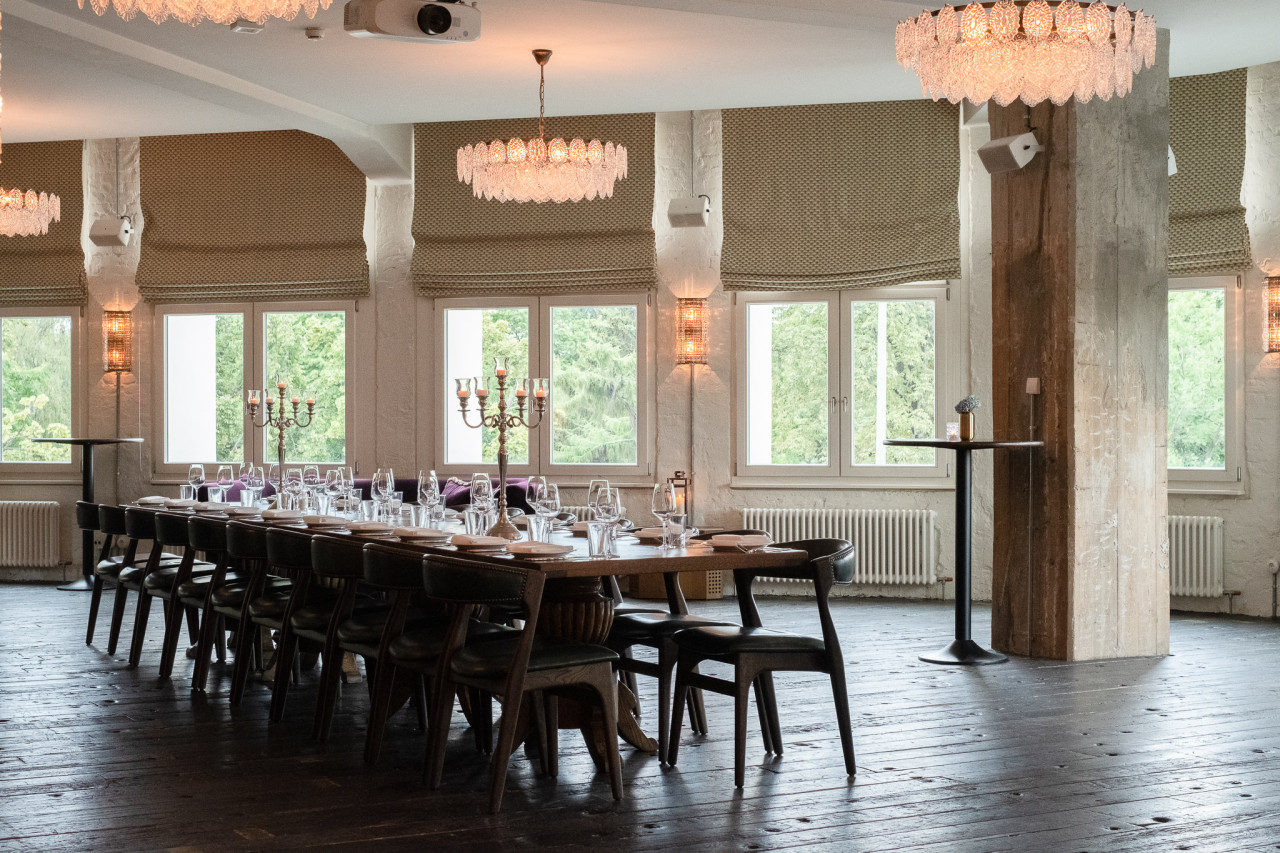 This elegant private venue in Berlin offers a variety of stylish spaces perfect for hosting private dinners, business meetings, cocktail receptions, and creative productions such as film and photo shoots. The interior design blends modern luxury with vintage charm, featuring wood-paneled walls, green velvet chairs, crystal chandeliers, and an abundance of natural light. The bar area exudes a sophisticated speakeasy atmosphere with its polished counter, ambient lighting, and intimate seating—ideal for pre-event cocktails or relaxed networking. Multiple dining rooms accommodate different event styles, with banquet-style tables, round and rectangular setups, and thoughtfully arranged table settings including white linens, candle holders, and fine glassware. Lounge-style areas offer plush armchairs and soft lighting, creating a cozy environment for informal gatherings or breakout discussions. The venue also includes fully equipped meeting and presentation rooms, complete with projectors and versatile seating layouts, making it suitable for workshops, board meetings, and private screenings. With its high-end aesthetics, flexible configurations, and serene atmosphere, this location is also a popular choice for branded content shoots, fashion editorials, and cinematic interviews. Whether for professional or social occasions, the venue provides a refined and memorable setting in the heart of the city.