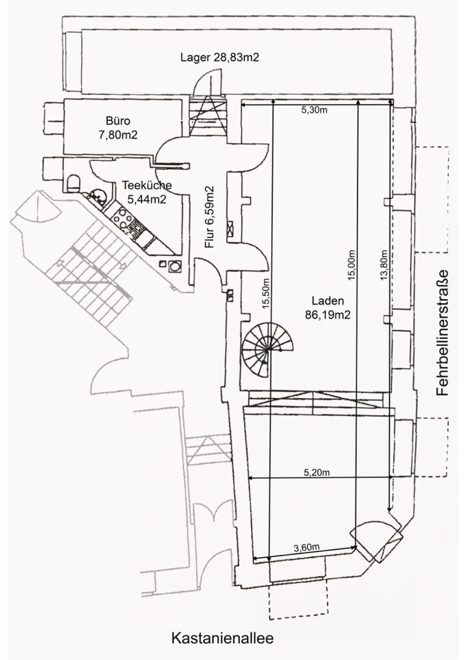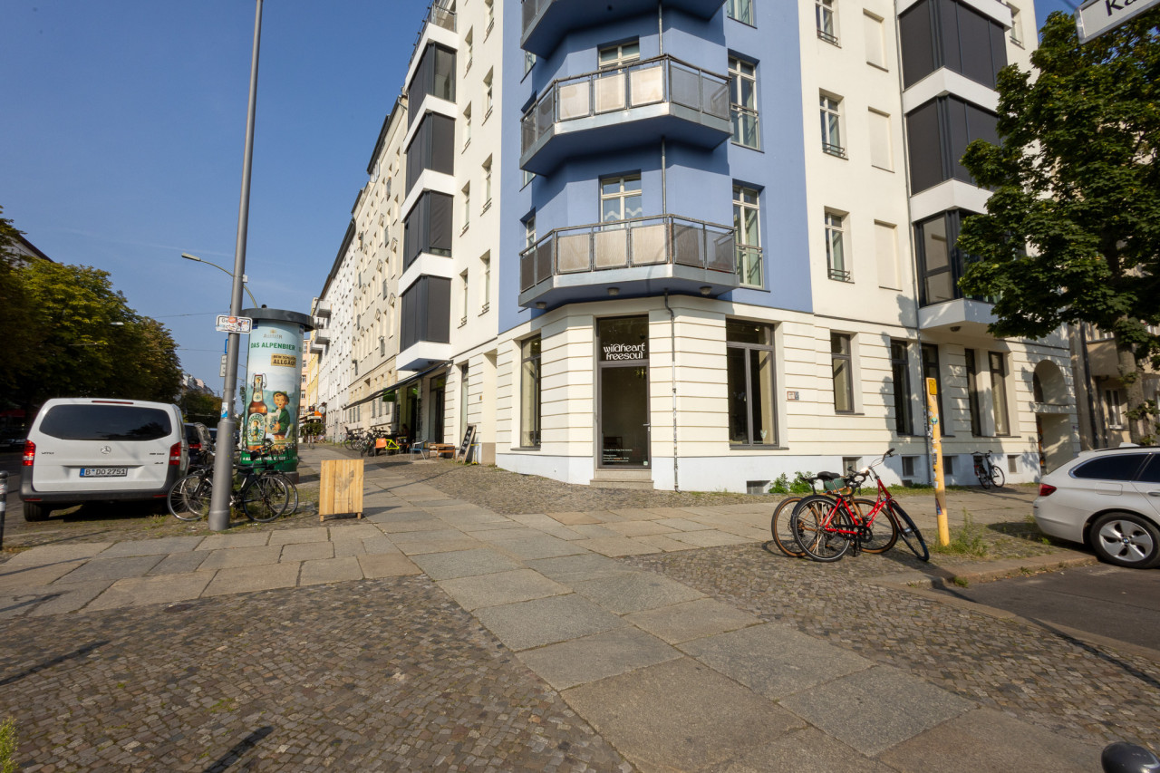 The space features two levels connected by a few steps, allowing you to create distinct areas or combine multiple uses. Floor-to-ceiling windows along Kastanienallee and Fehrbelliner Straße ensure a bright, open, and inviting atmosphere with maximum street exposure.