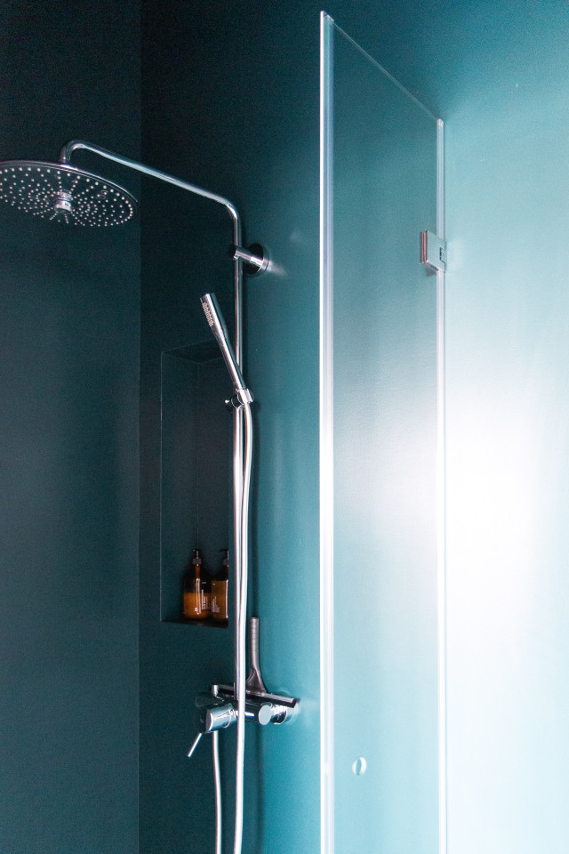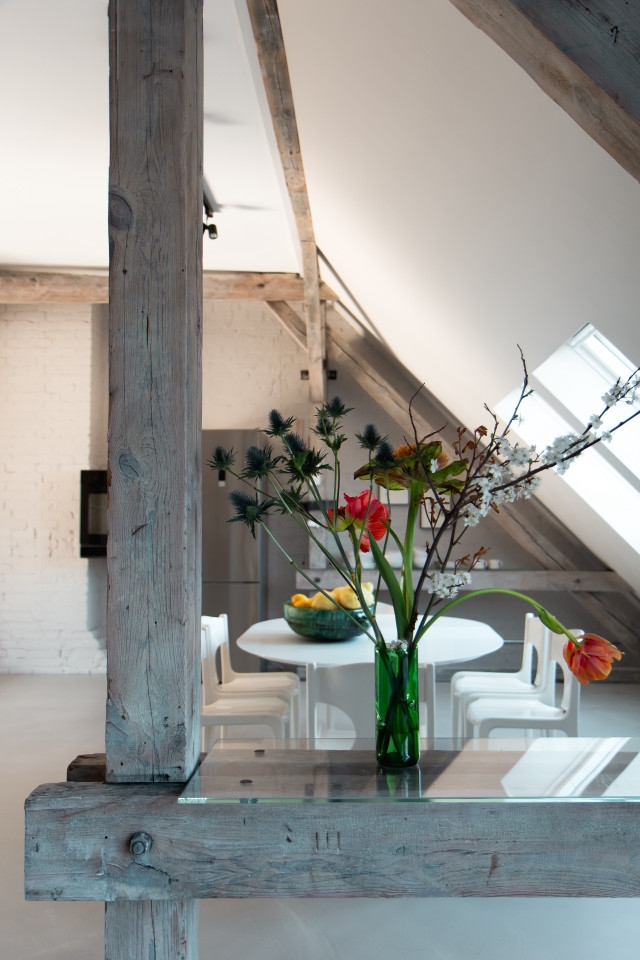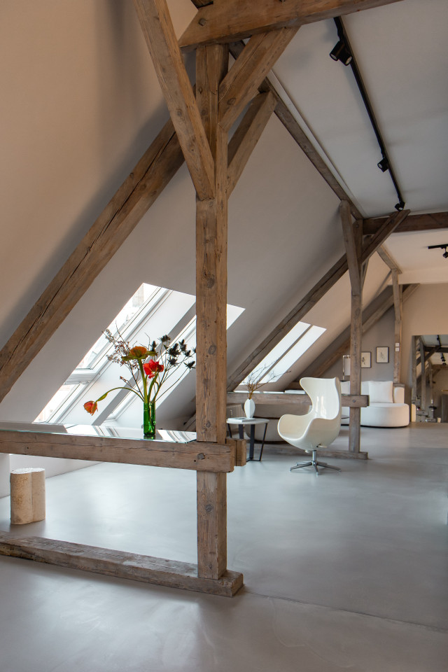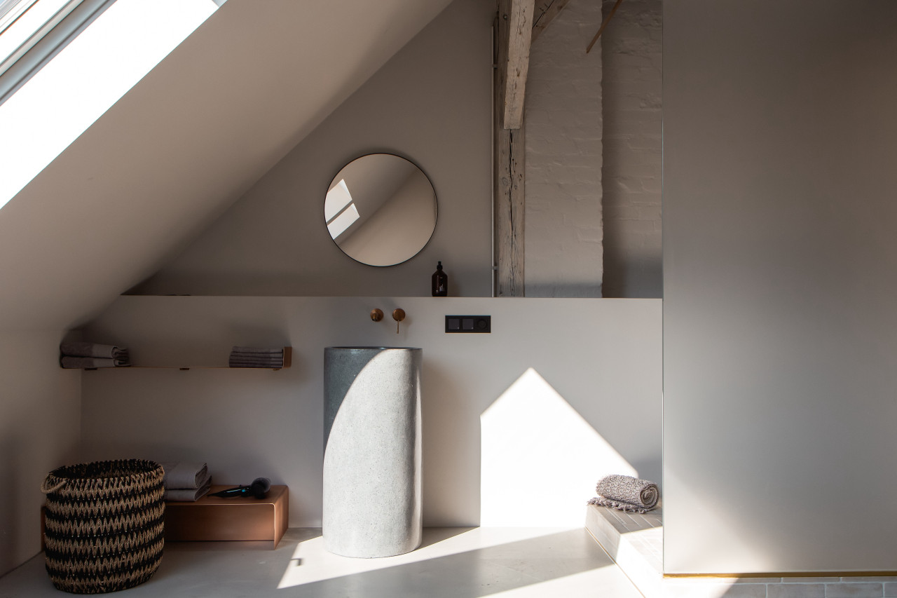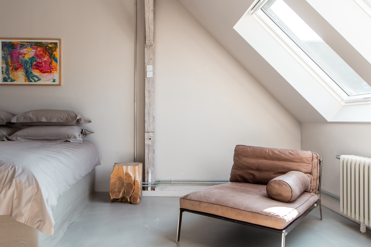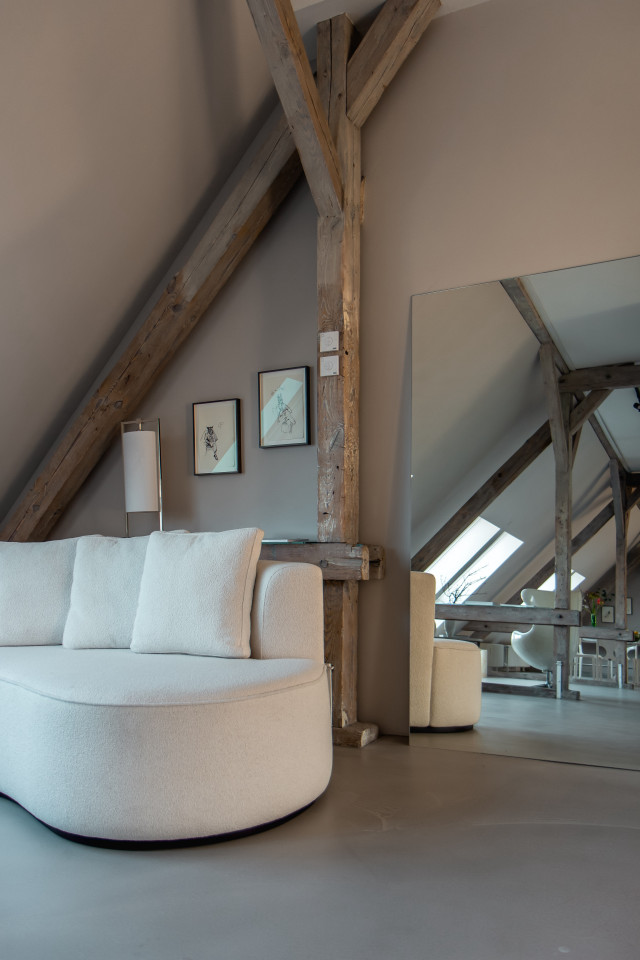 The studio blends historical charm with modern character through its palette of grey white and warm wood tones. Rustic beams contrast with the light-filled rooms and carefully curated artworks lend depth and individuality to each space. The minimalist open bathroom offers relaxation while the living and sleeping areas invite lingering with soft colors and plush furniture.