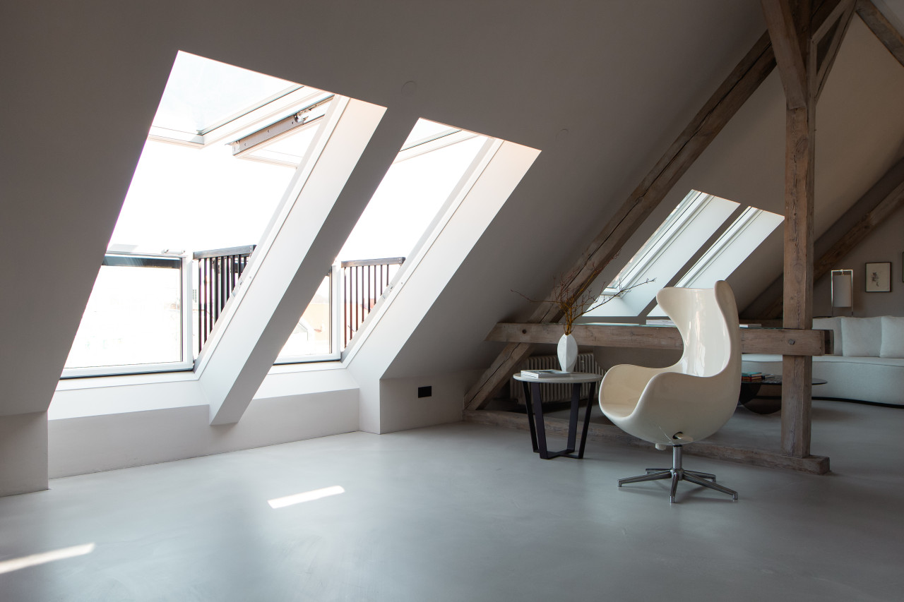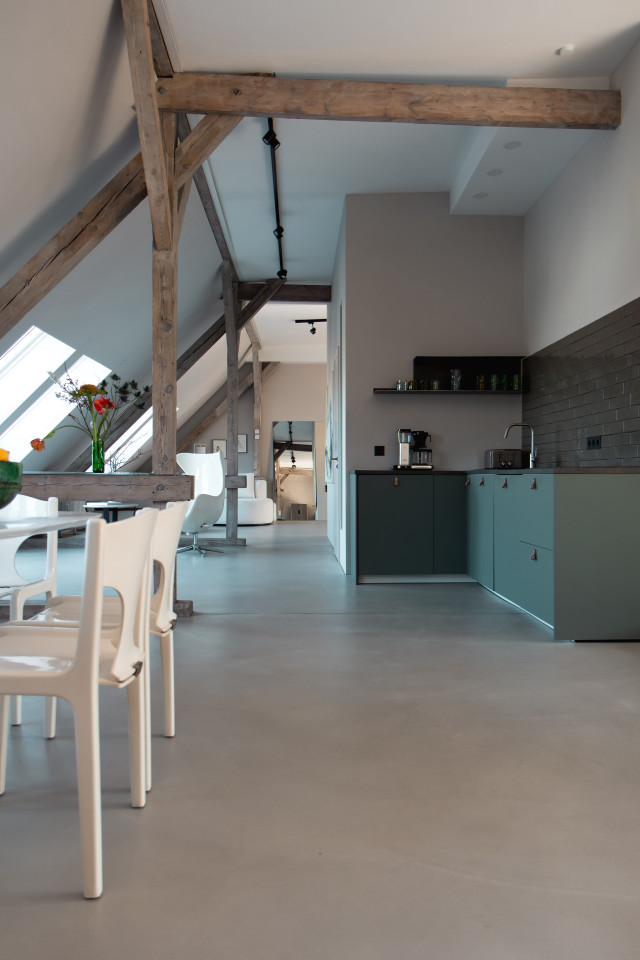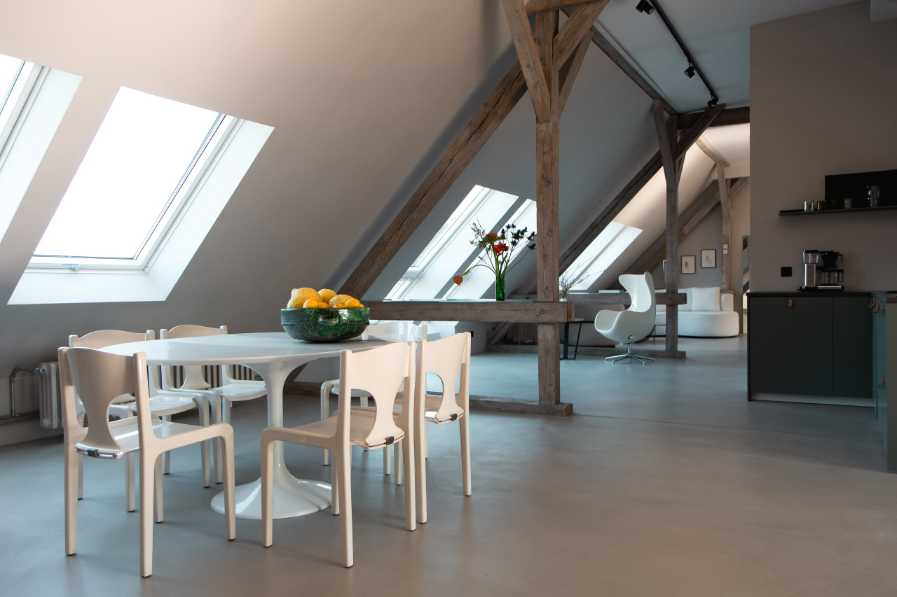 On the fifth floor of a traditional building from 1905 a 138-square-meter home unfolds with the charm of a studio. Historic beams and large skylights flood this sanctuary with daylight offering expansive city views. A spacious living room and lounge area provide tranquility and an invitation to linger while the open kitchen seamlessly integrates into the dining area promising sociable moments. The comfortable main bedroom with an open en-suite bathroom and an open dressing area as well as another bedroom and bathroom complete this studio as a cozy temporary home