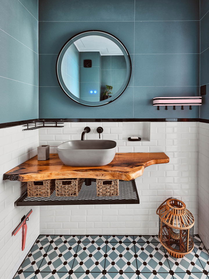The interior combines eclectic colonial design with handcrafted details and high-quality natural materials. The custom-built kitchen, made of polished concrete, stone, and wood.