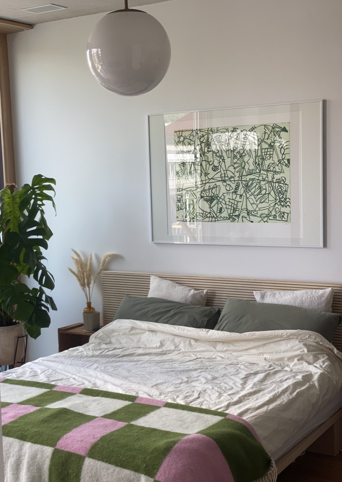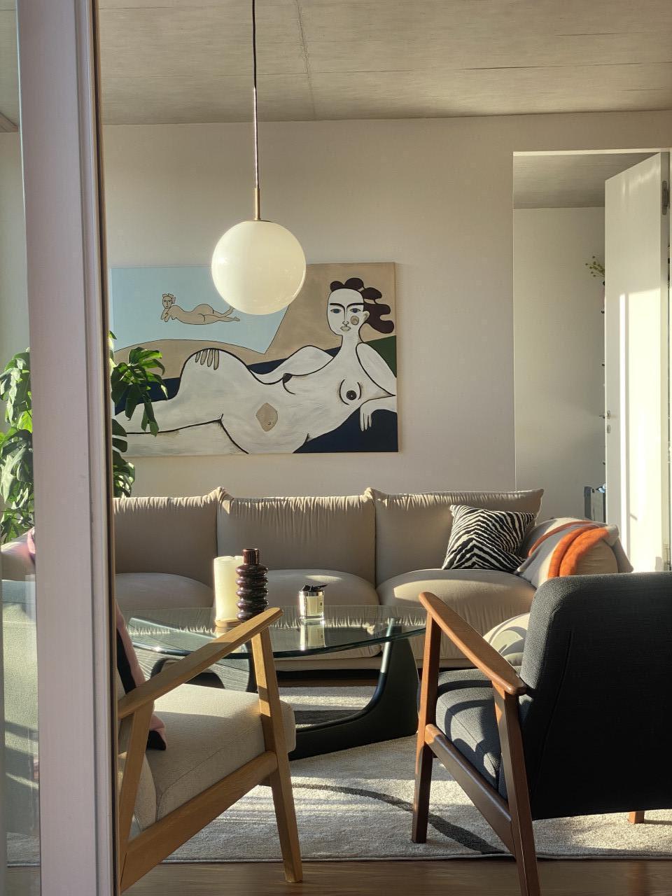 An evocative tableau of form and function, this meticulously composed space invites the eye to linger over every carefully selected detail. The living room sets a serene cinematic tone, defined by a sophisticated palette of beige, gray, and white, punctuated with lush green plant life and the dramatic presence of an arresting, large-scale painting. Sunlight pours through expansive glass windows, illuminating smooth, matte surfaces and soft woven furnishings, with considered accents—a sculptural armchair, polished coffee table, and reflective artful mirrors—each element curated to highlight subtle contrasts in texture, shadow, and gloss. Atmospheric lighting from sculptural floor and pendant lamps provide both drama and a sense of calm, while layered cushions and tactile materials create a mood of understated tranquility, perfectly attuned to editorial photography or concept-driven visual storytelling.