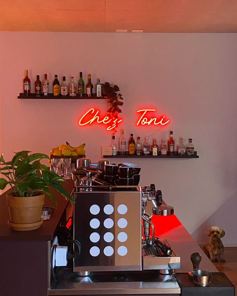 Moving seamlessly from living to dining, the property’s open-plan layout is articulated with a modern sensibility: a dining area centered on a gleaming round table and rattan chairs, set beneath a white pendant lamp and adjacent to a vibrant red cabinet under striking contemporary artwork. The kitchen’s interplay of matte and glossy finishes, punctuated by metallic accents and potted greenery, reads like a modernist still life, ripe for creative exploration. Beyond, a rooftop patio reveals a geometric blue sofa beneath a striped umbrella—a vignette of urban leisure poised for daytime shoots or intimate gatherings. Additional flourishes—a home bar with neon sign and a charming dog, an urban oasis of potted plants and reflective surfaces—complete an environment where every angle offers visual intrigue and layered narrative, making this location a canvas for creative expression across disciplines.