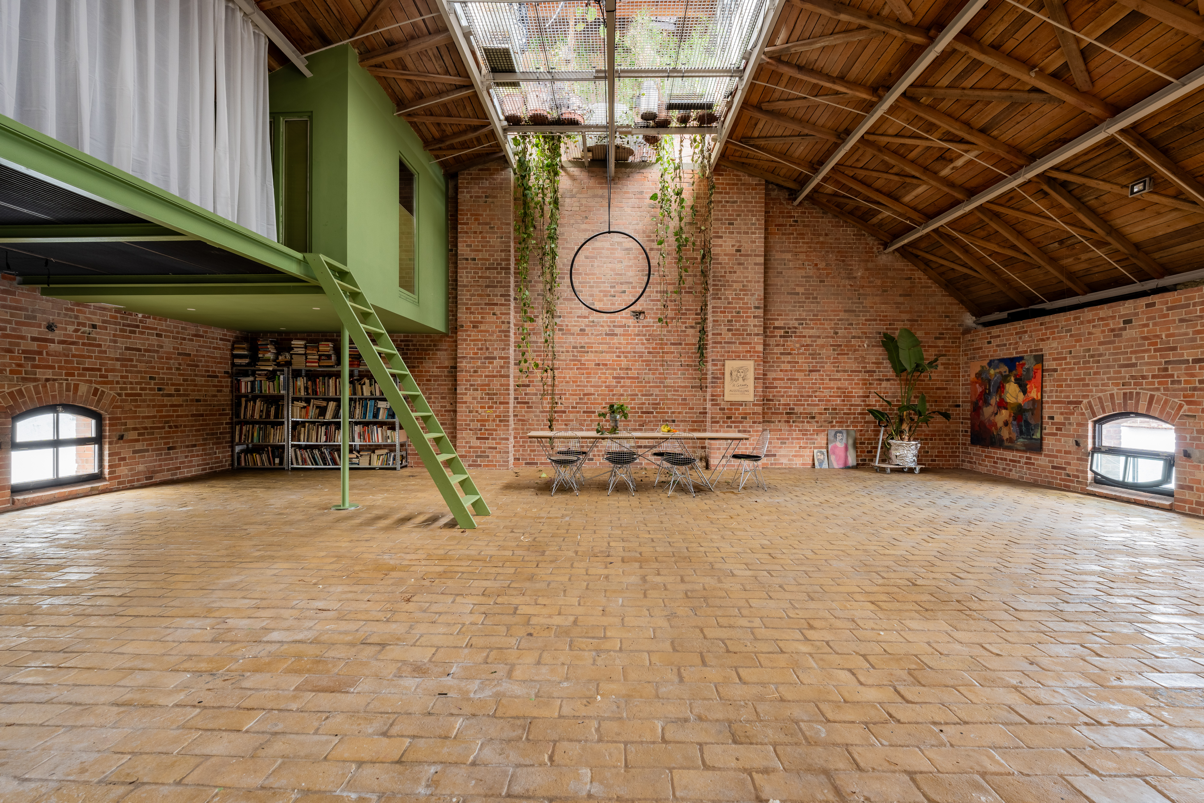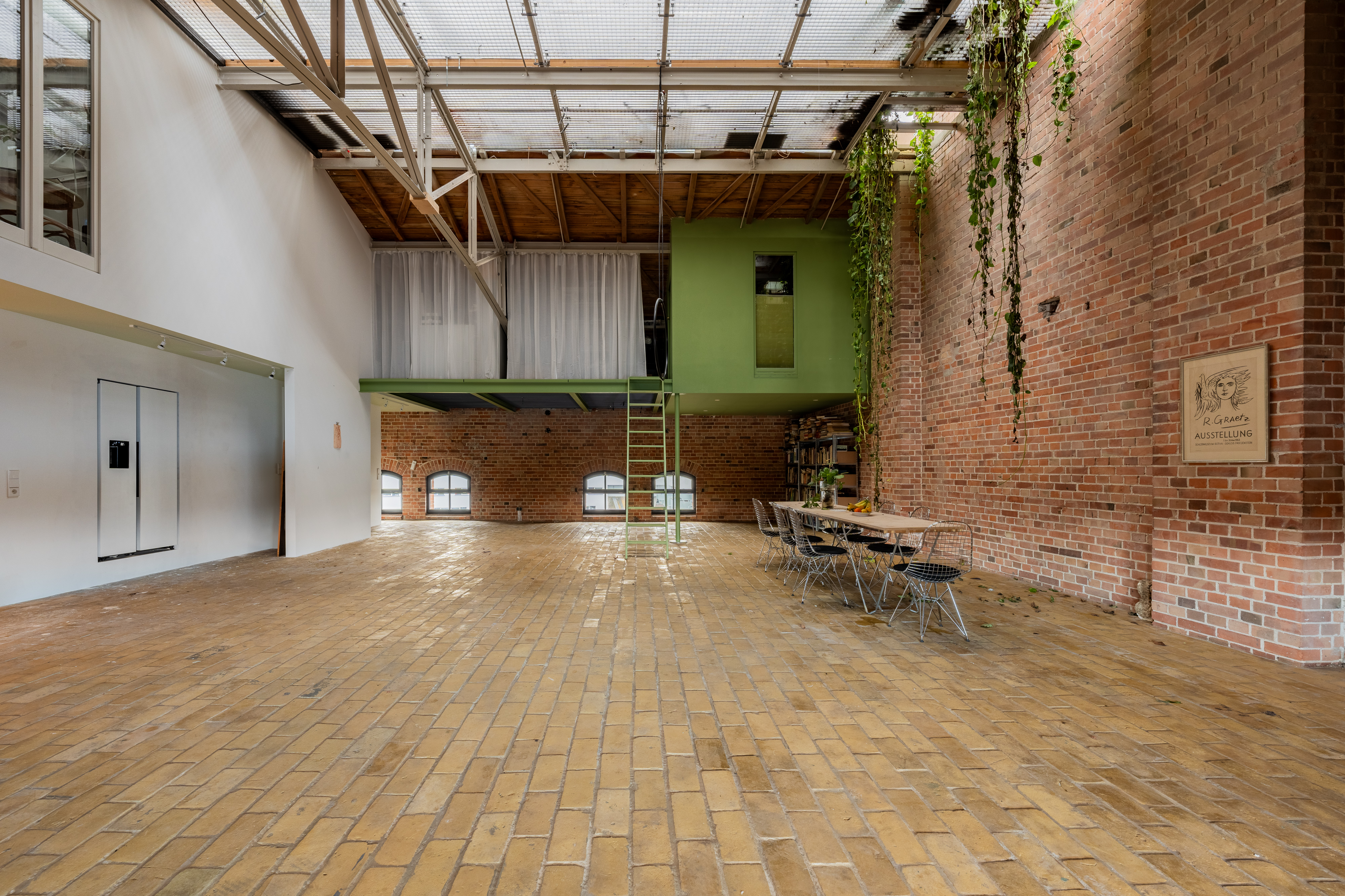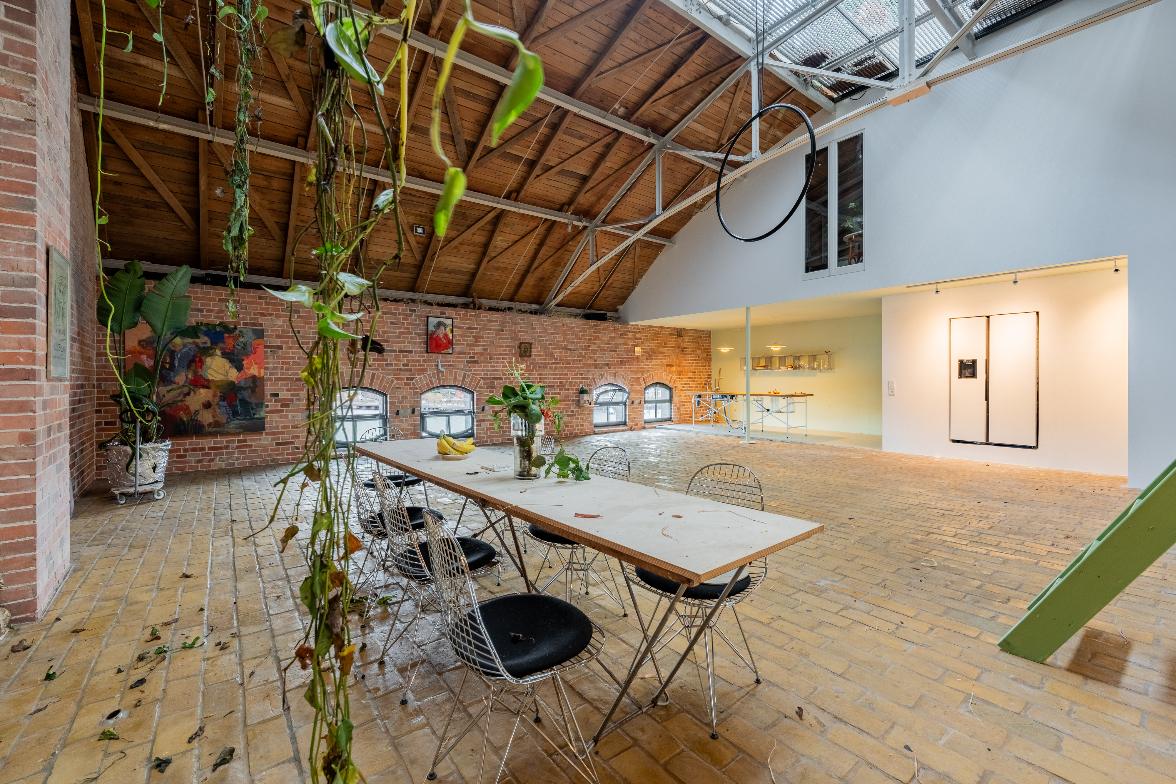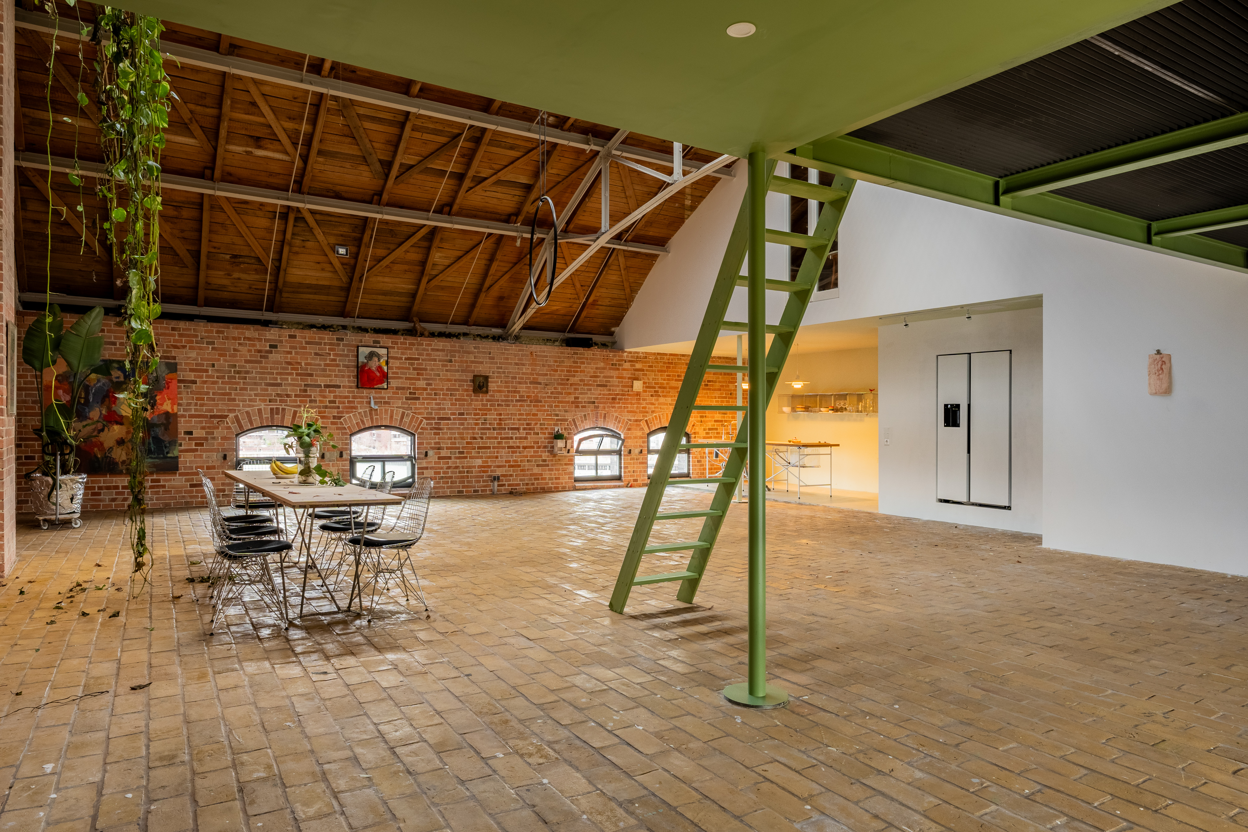 Experience urban living redefined in this spacious industrial loft, perfect for those who cherish both style and comfort. This loft boasts exposed red brick walls paired with modern minimalist interiors, creating a striking contrast that enhances its architectural allure. Large arched windows allow natural light to flood the space, illuminating the artfully decorated interiors and vibrant indoor gardens. The property features a modern kitchen with sleek appliances and brick accents, perfect for culinary enthusiasts.