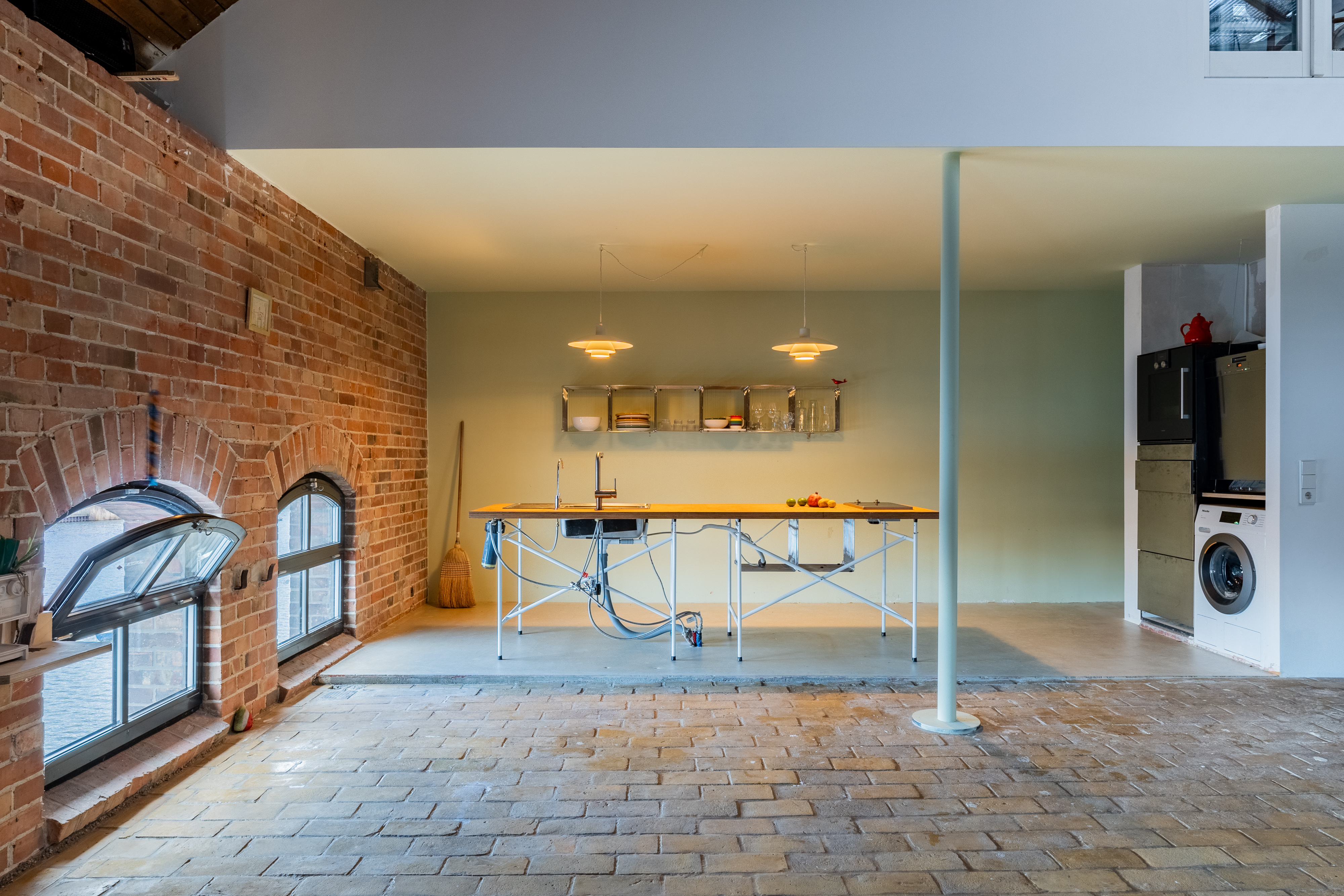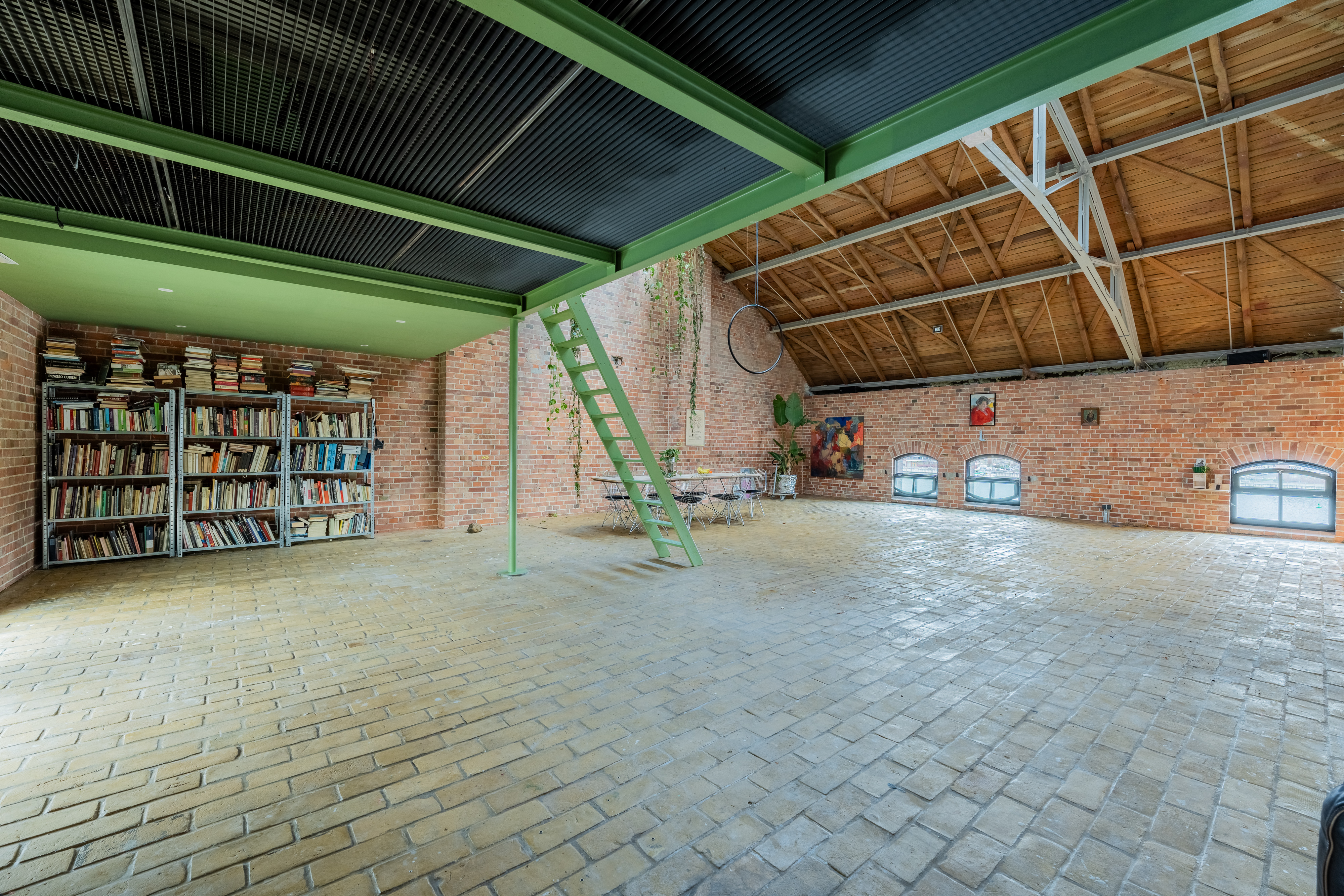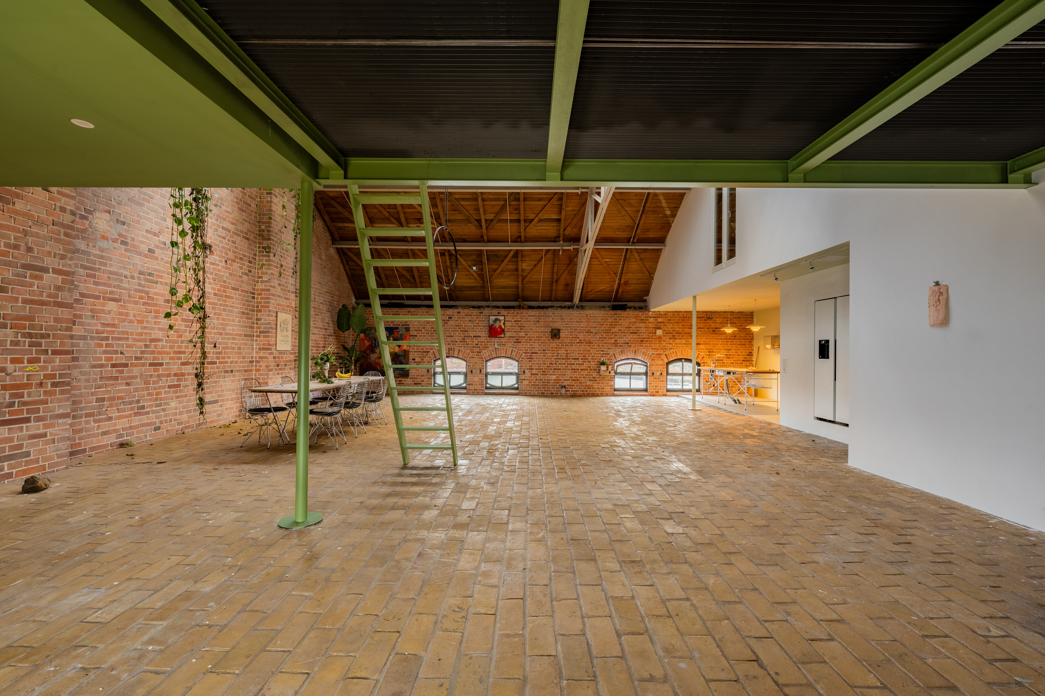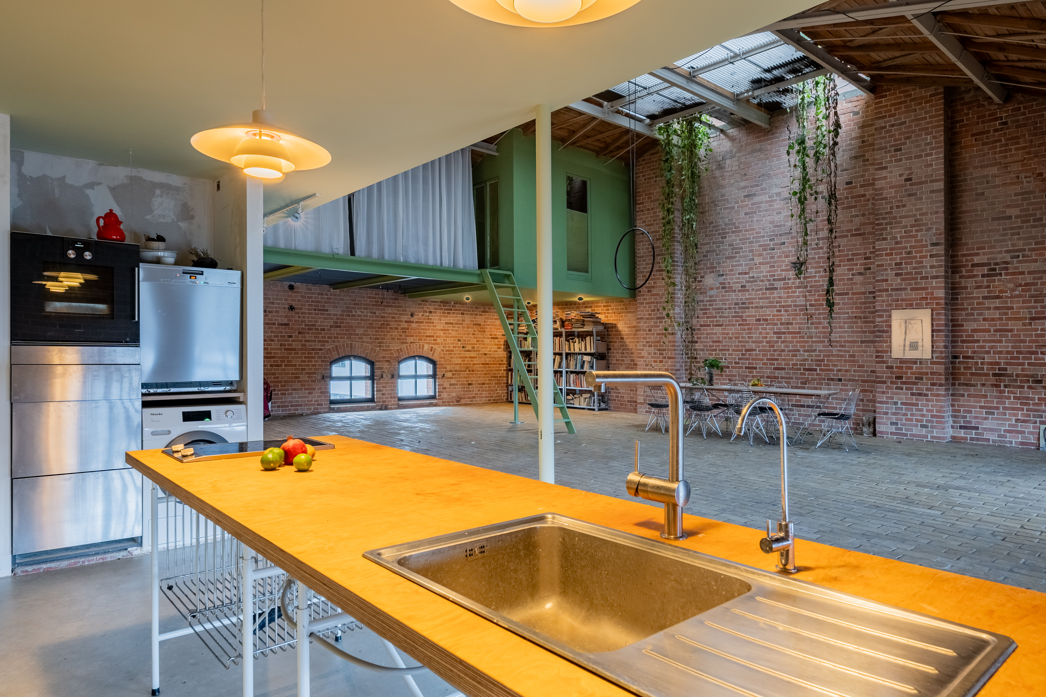 Experience urban living redefined in this spacious industrial loft, perfect for those who cherish both style and comfort. This loft boasts exposed red brick walls paired with modern minimalist interiors, creating a striking contrast that enhances its architectural allure. Large arched windows allow natural light to flood the space, illuminating the artfully decorated interiors and vibrant indoor gardens. The property features a modern kitchen with sleek appliances and brick accents, perfect for culinary enthusiasts.