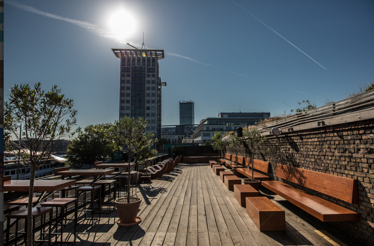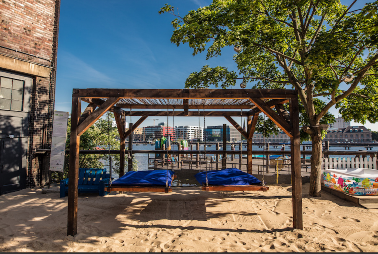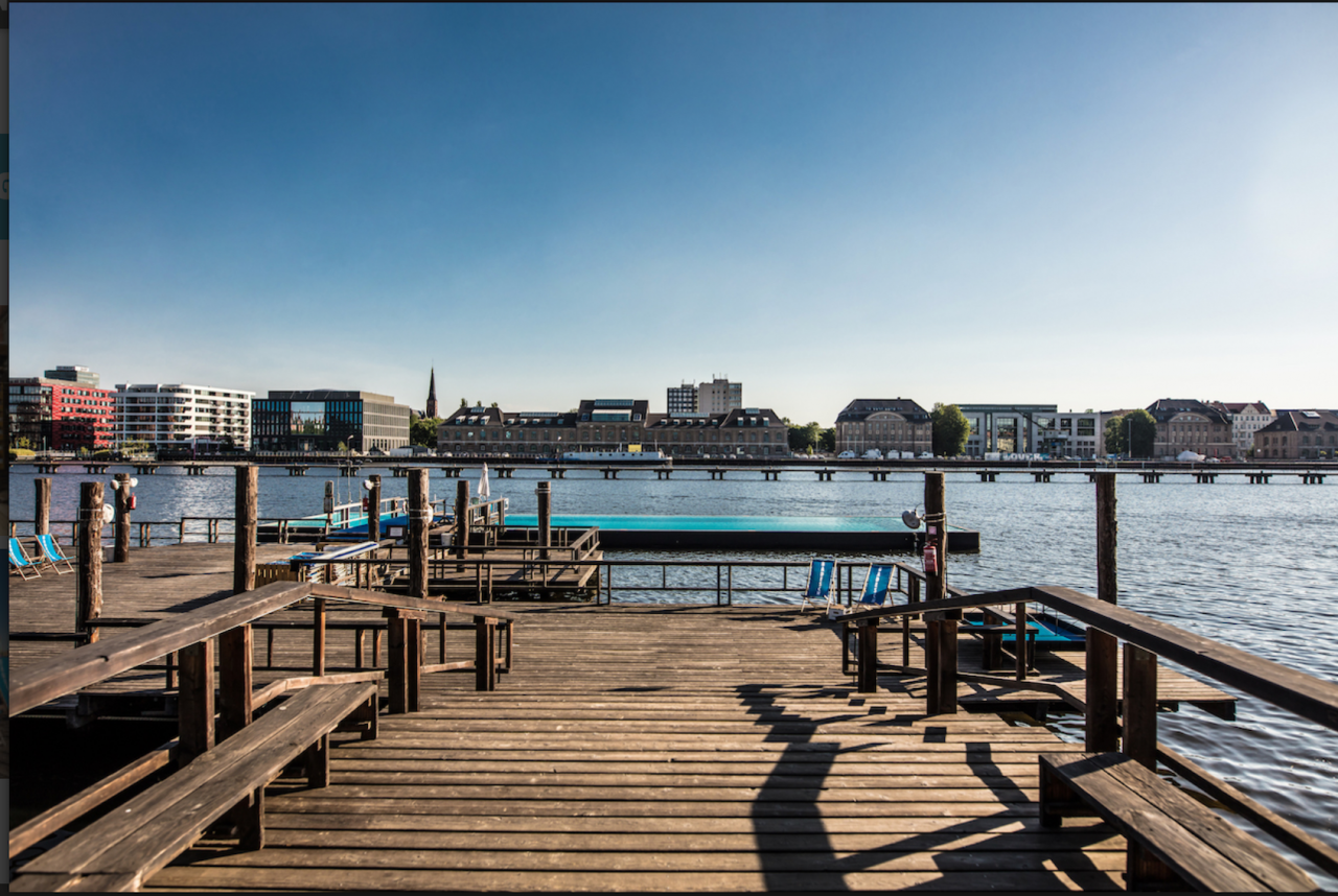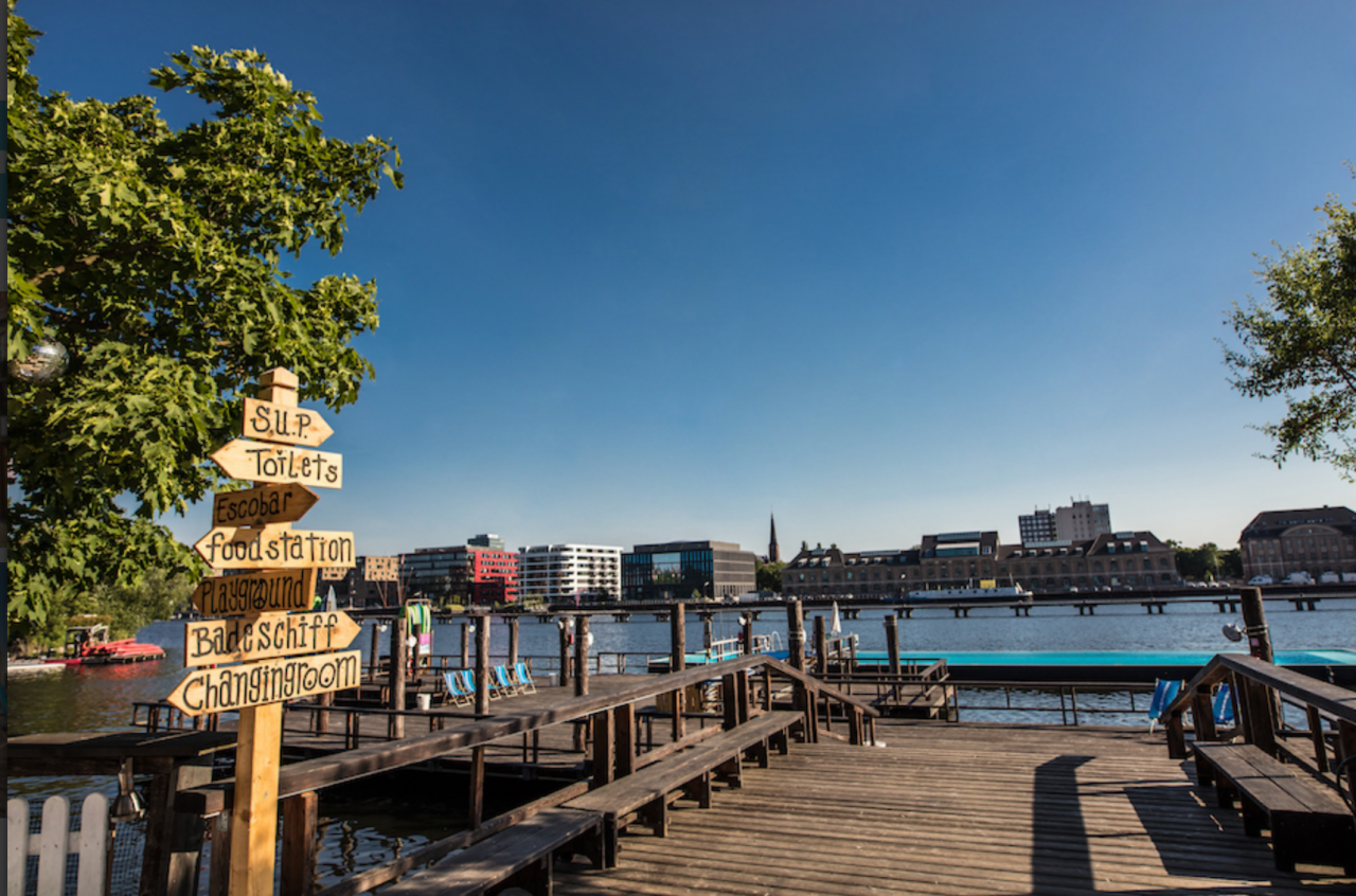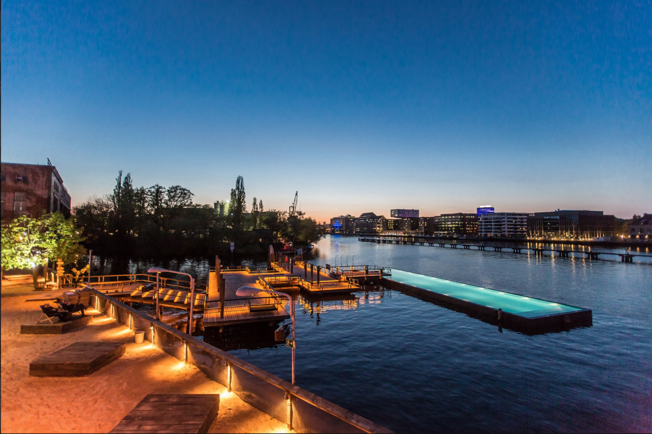In the tradition of old river swimming pools, the push barge anchored in Alt-Treptow functions as a floating bathing establishment. From here, a unique panoramic view of the Spree, the Oberbaum Bridge and the TV Tower opens up. In addition to bathing, the beach area around the bathing ship has become an urban recreation area. The supporting program is versatile and offers the visitor diversion as well as recreation. For many Berliners, the Location has become a place to go at any time of day. For corporate events, the location offers an extraordinary setting.