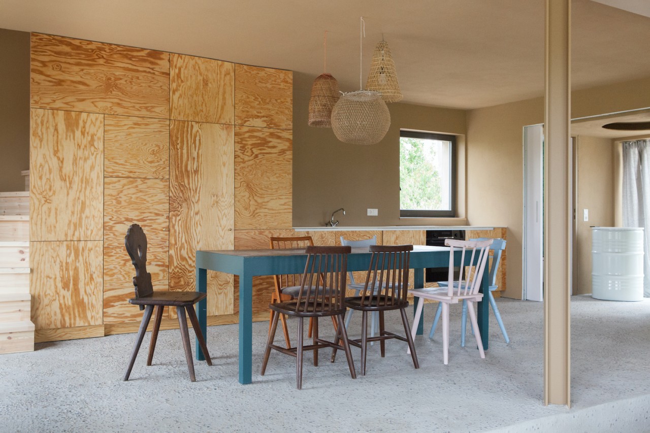 Surrounded by lakes, meadows and forests, it's characterised by the rather small volume of the usual settlement house from the 1950's but experiences it's surprise in the interior: