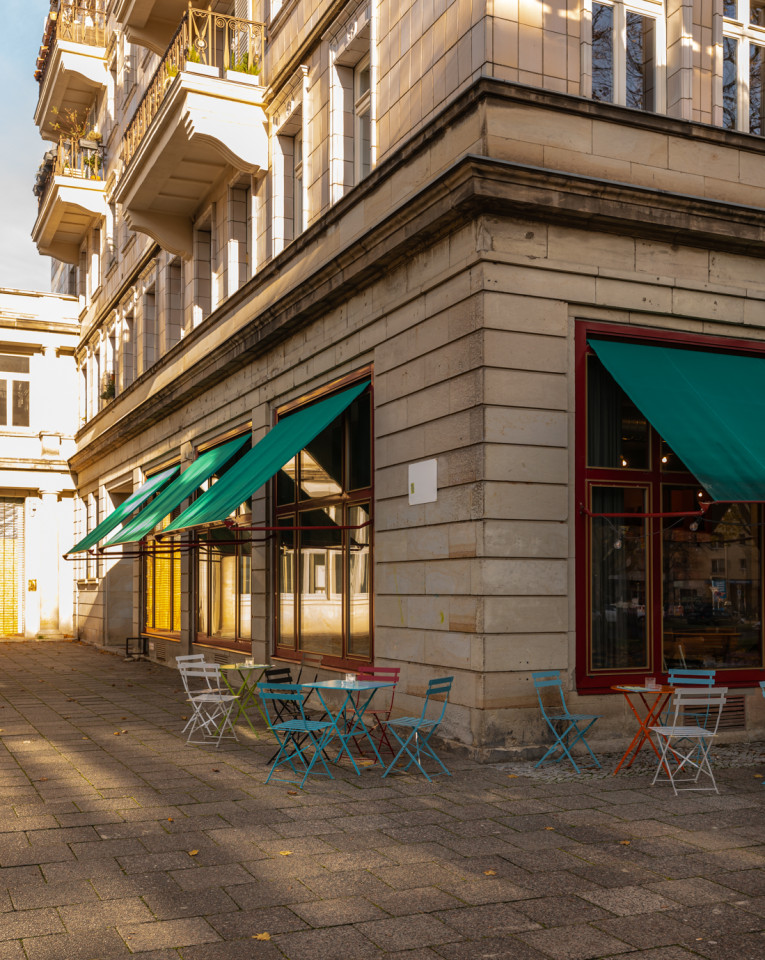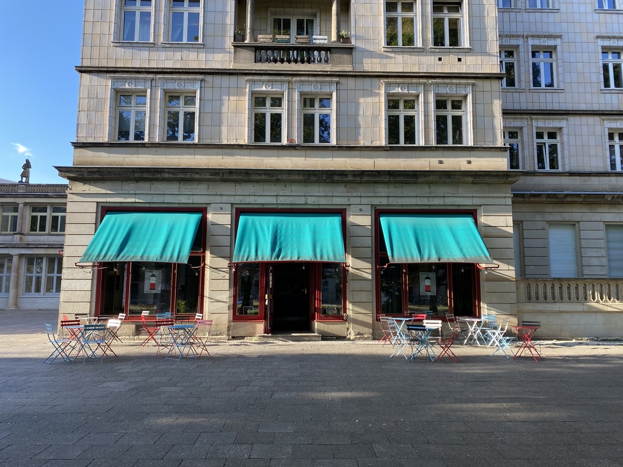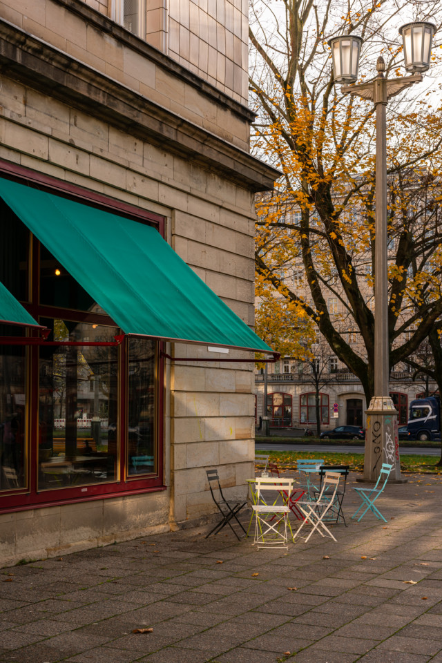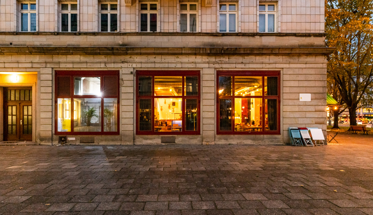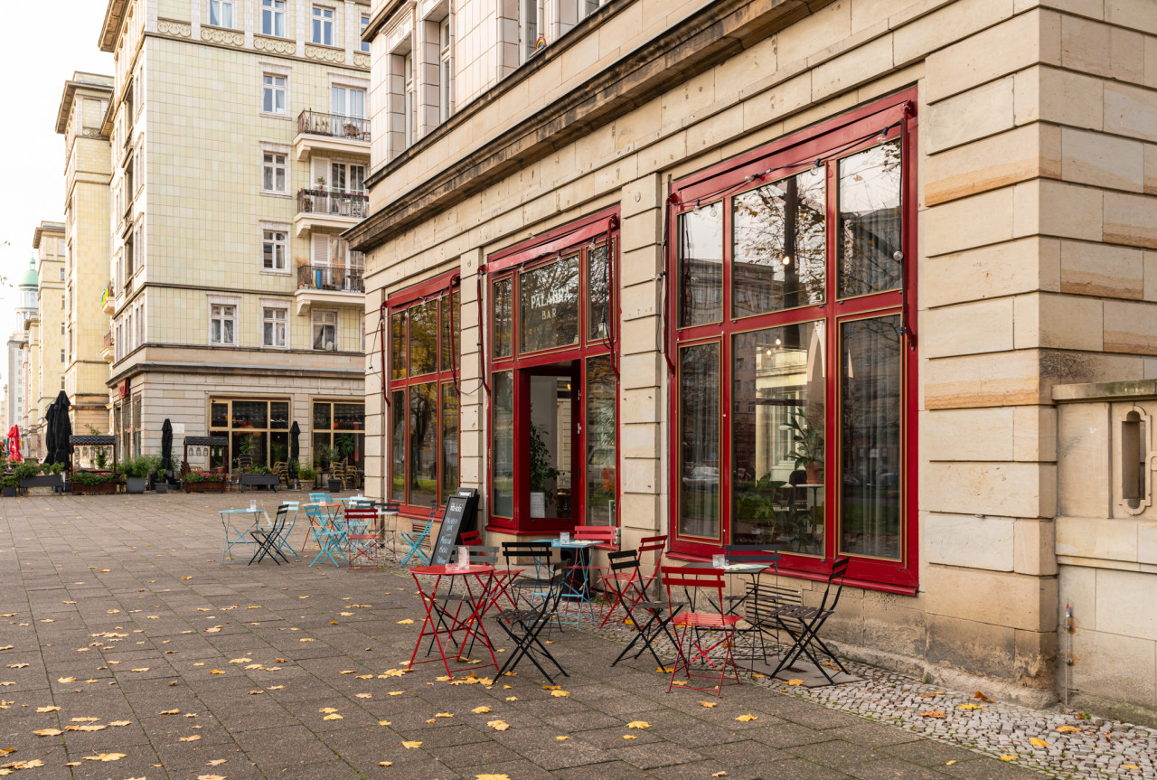 It is located in a striking building designed for the elite of the DDR and the high-quality architecture is visible due to the space’s four panoramic windows, high ceilings and generous indoor space. There is also an outdoor area on the Allee’s large pedestrian, protected from the street by a wide greenspace and with a view towards the iconic TV tower.