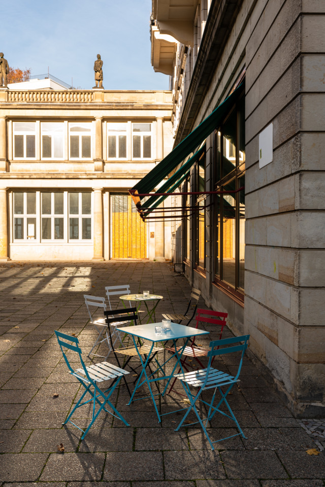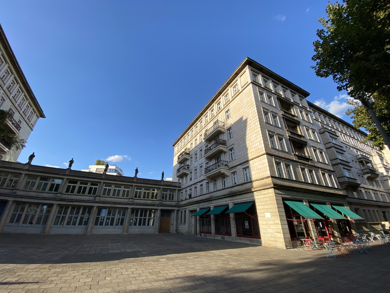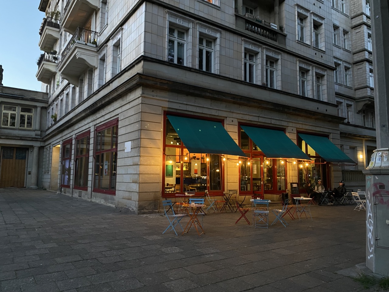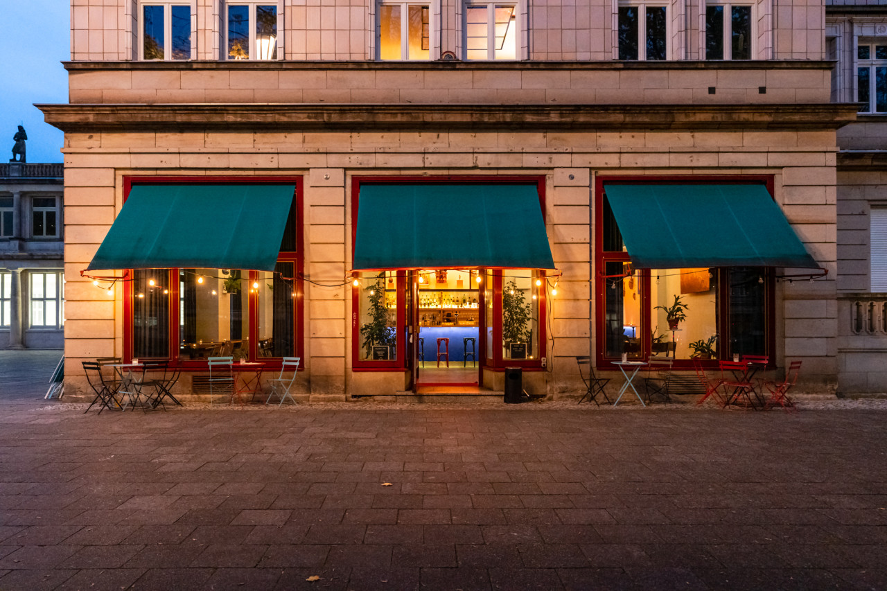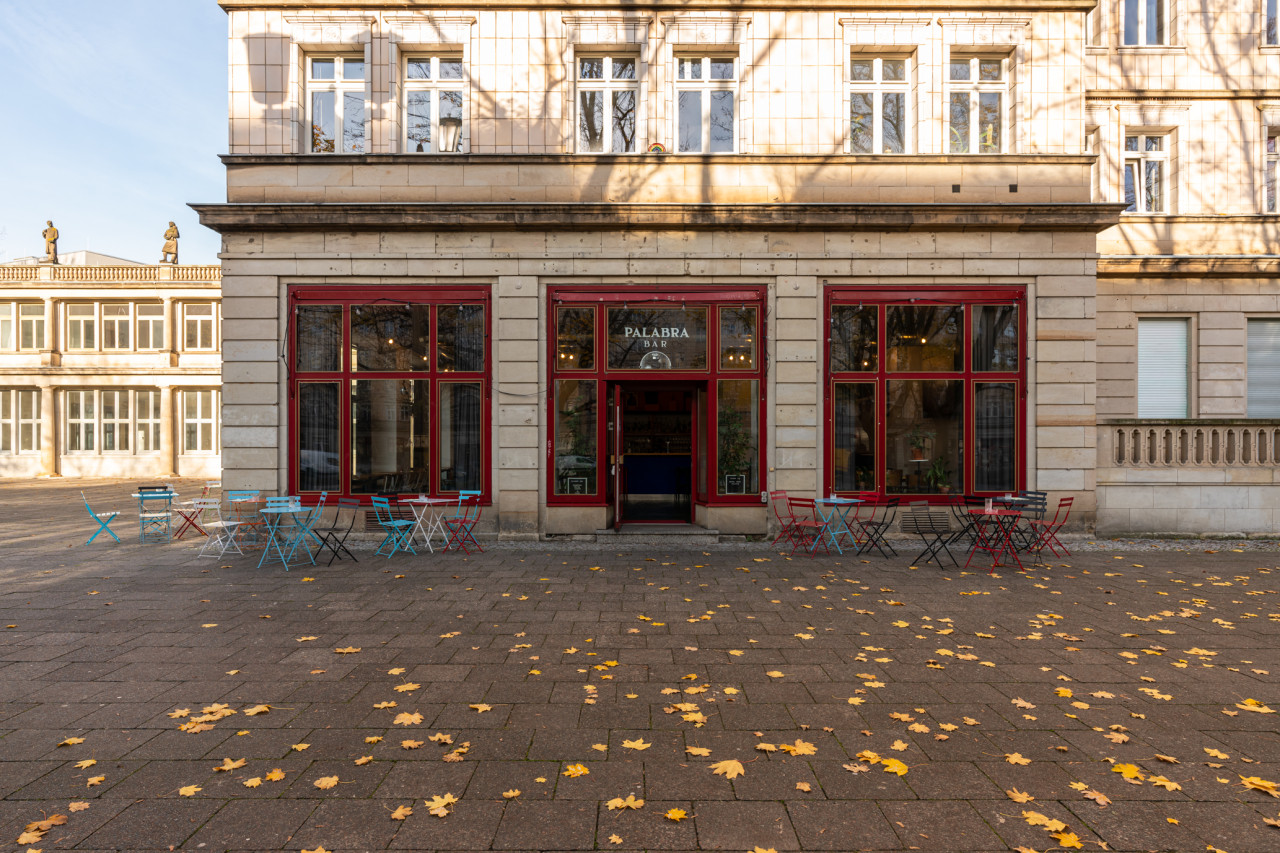 It is located in a striking building designed for the elite of the DDR and the high-quality architecture is visible due to the space’s four panoramic windows, high ceilings and generous indoor space. There is also an outdoor area on the Allee’s large pedestrian, protected from the street by a wide greenspace and with a view towards the iconic TV tower.