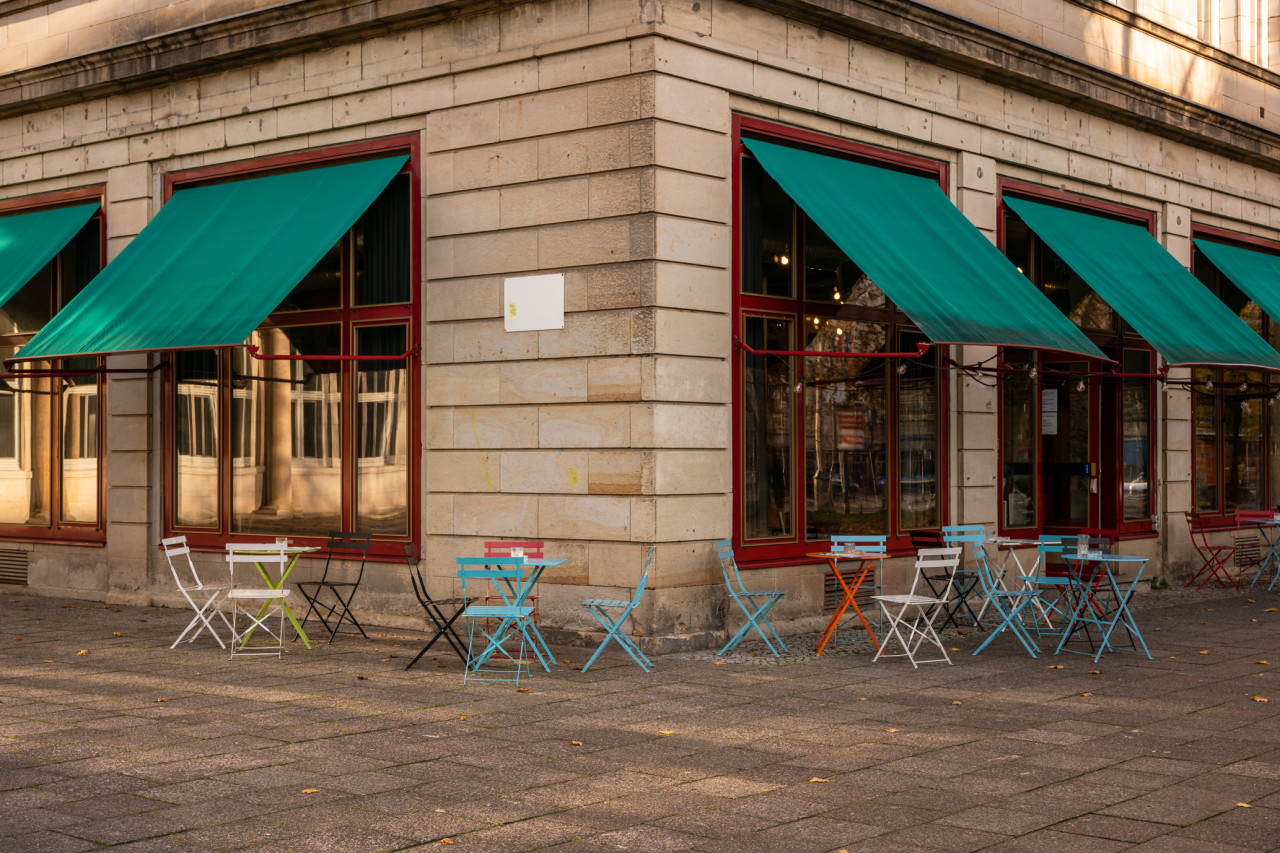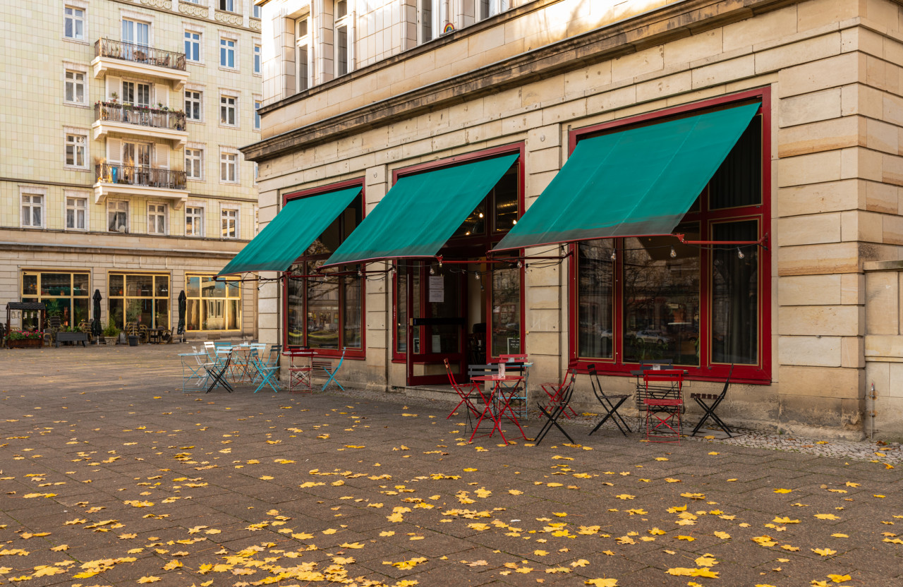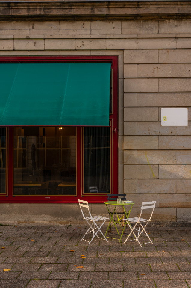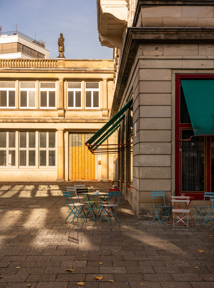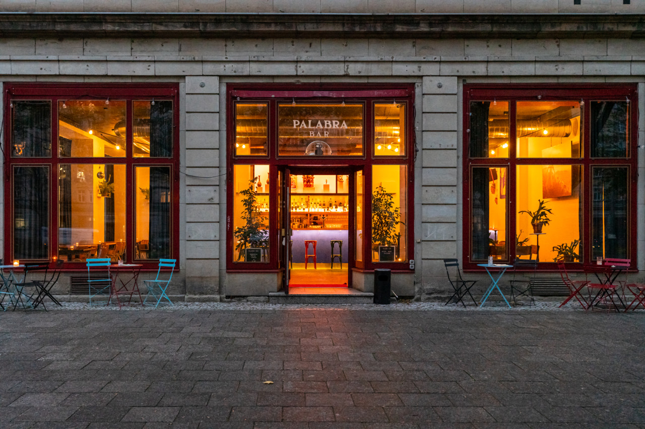 It is located in a striking building designed for the elite of the DDR and the high-quality architecture is visible due to the space’s four panoramic windows, high ceilings and generous indoor space. There is also an outdoor area on the Allee’s large pedestrian, protected from the street by a wide greenspace and with a view towards the iconic TV tower.
