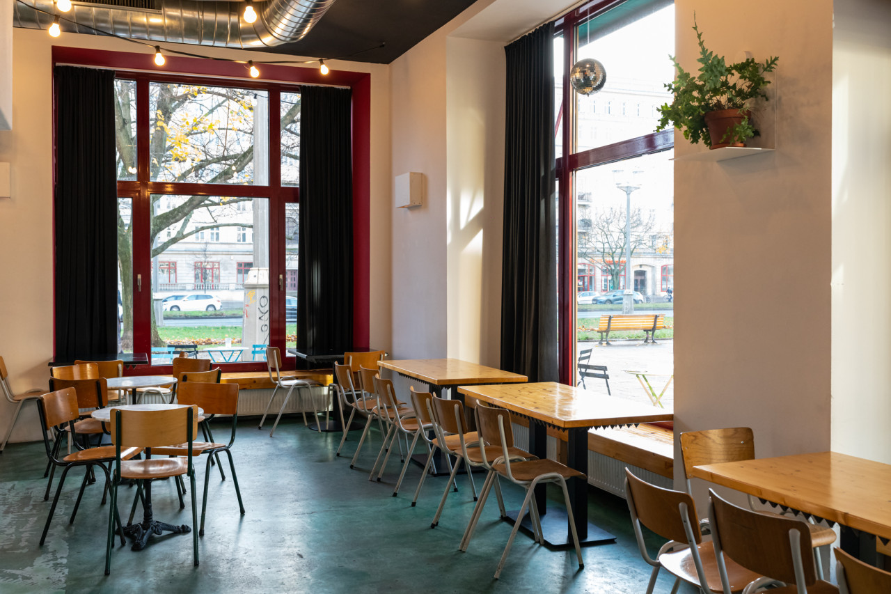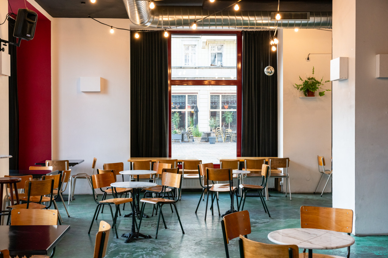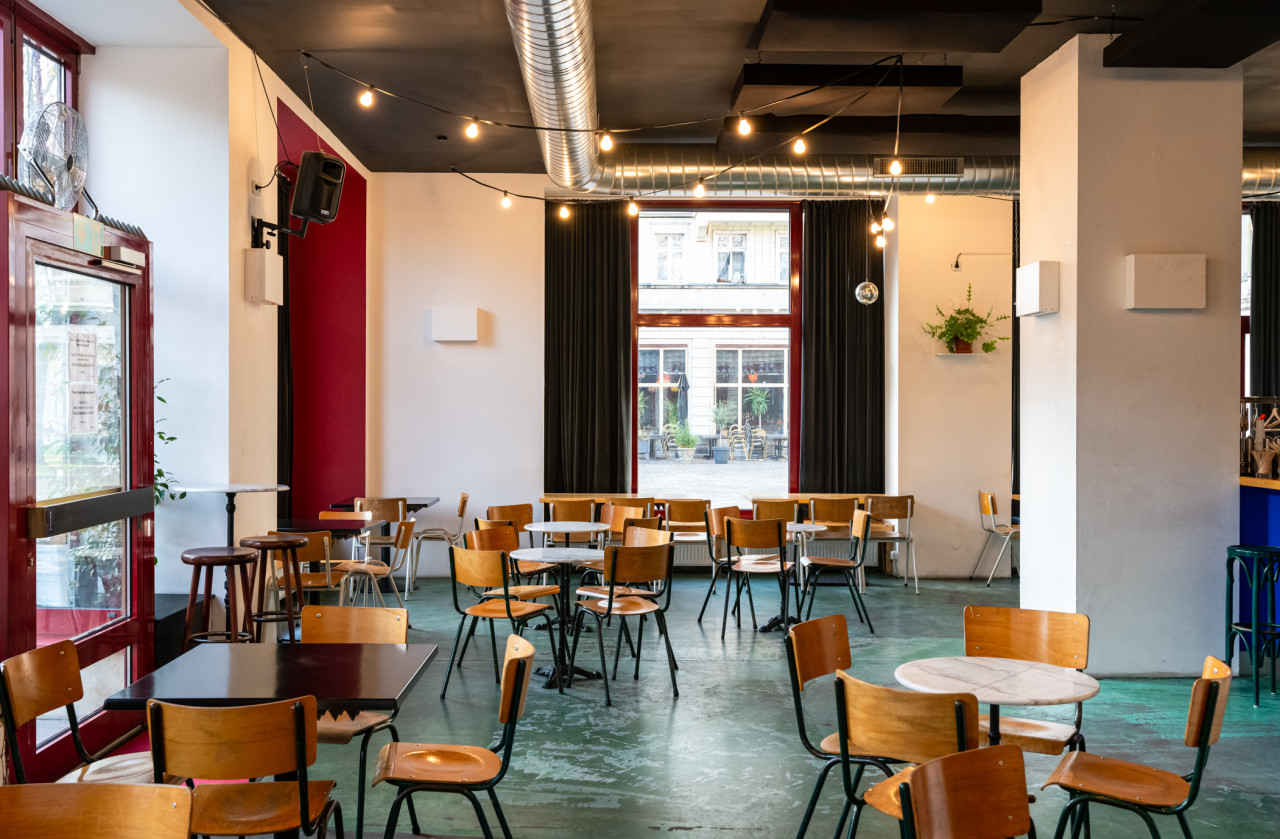 The venue is furnished with multiple large tables and customised wooden benches along the windows, marble café tables and a large bar area with stools bordering a dancefloor. It fit 80 seating and up to 100 inside incl. standing. Outside, up to 40 people can be seated.
