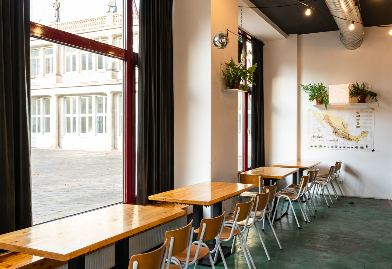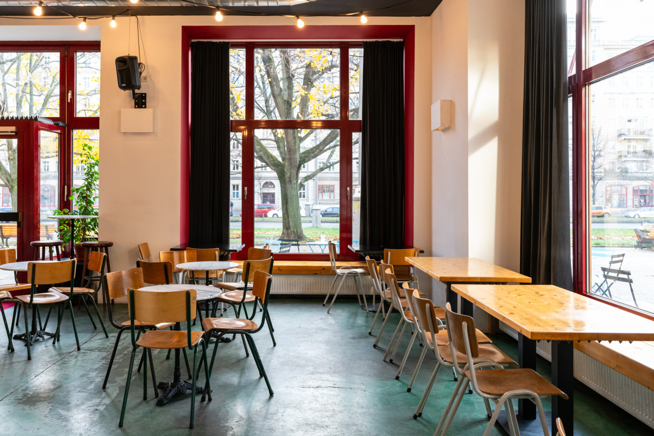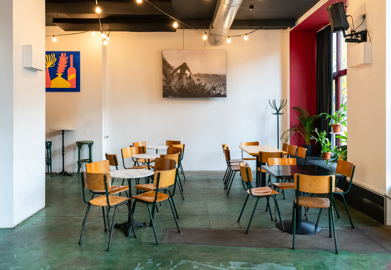 The venue is furnished with multiple large tables and customised wooden benches along the windows, marble café tables and a large bar area with stools bordering a dancefloor. It fit 80 seating and up to 100 inside incl. standing. Outside, up to 40 people can be seated.