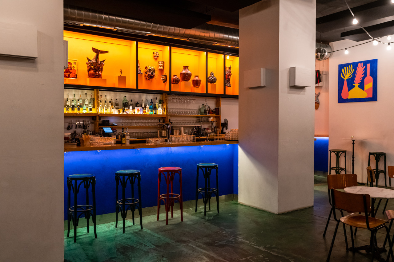 The furniture and decoration: Displaying an exquisite collection of Mexican handcrafts in a gallery-like style, the bar has an interior design resembling the modernism of a Luis Barragan house, combining wooden and marble elements with straight lines, rough surfaces and vivid colours.