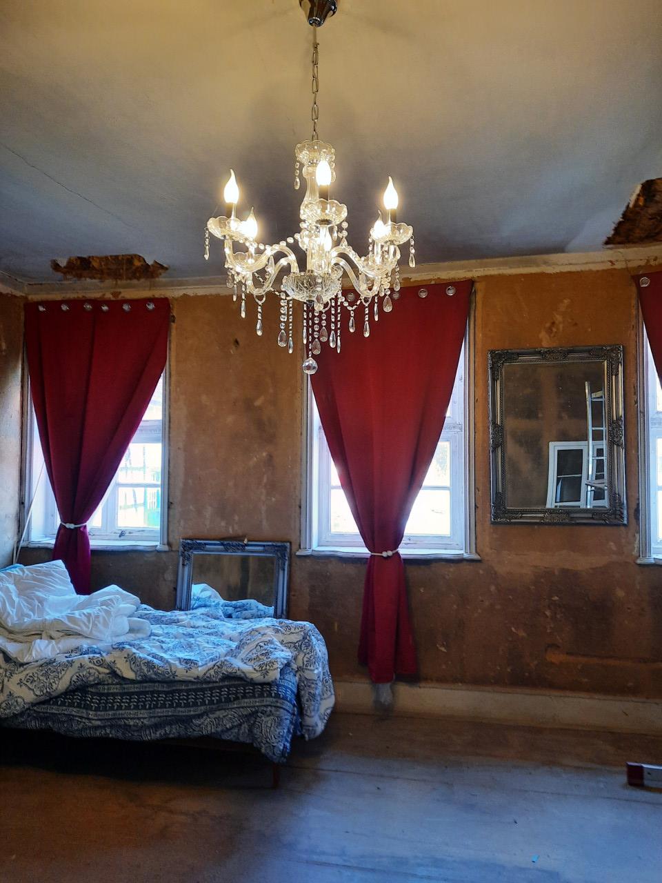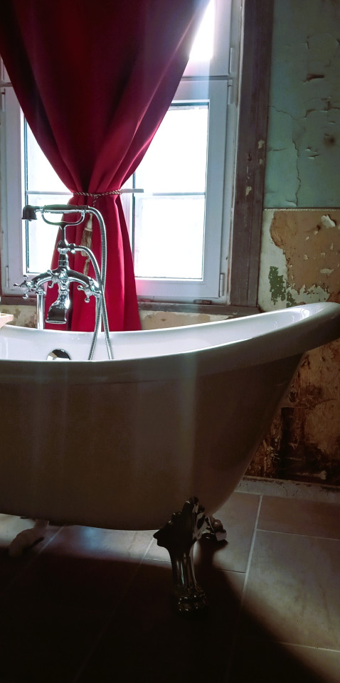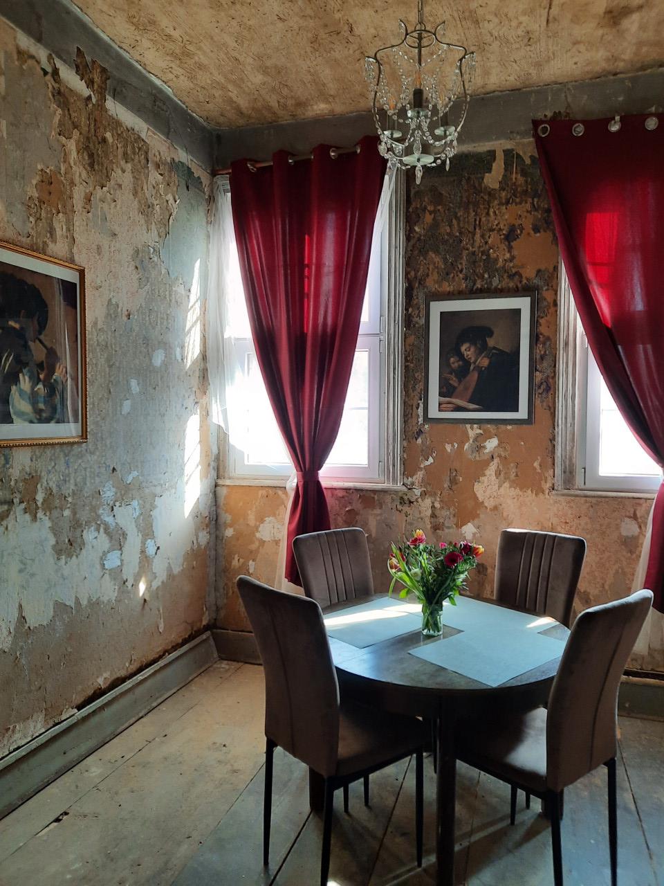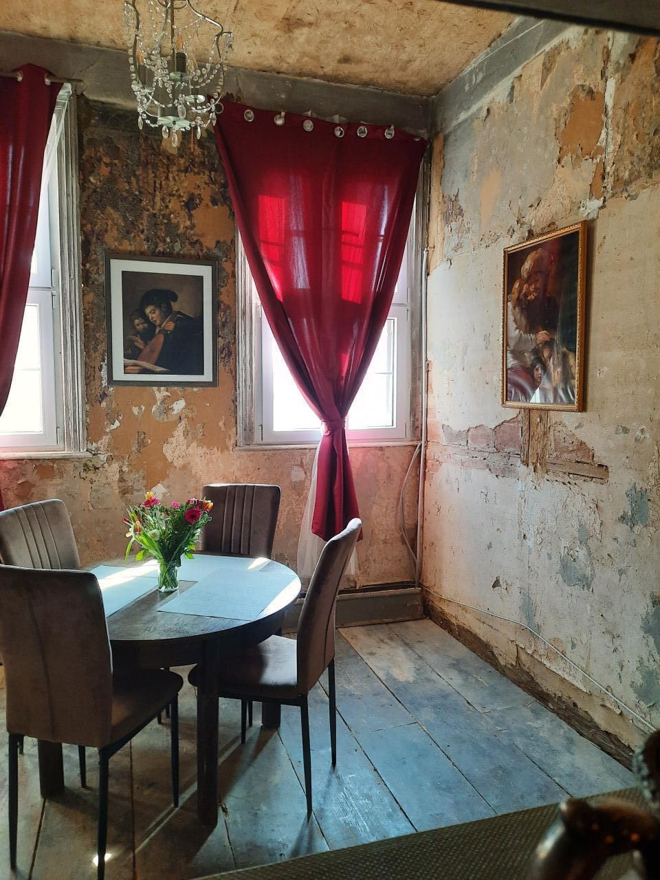 This beautifully preserved estate is rich in atmosphere and history. The exterior showcases traditional half-timbered German architecture in a peaceful rural setting, complete with cobblestone paths and scenic views. Inside, the mansion brims with character—aged walls with exposed plaster, antique fixtures, ornate woodwork, and red velvet drapery evoke a romantic, slightly faded grandeur. Details like chandeliers, clawfoot bathtubs, and vintage furniture hint at the elegance of a bygone era. Some rooms reveal the patina of time, adding to the authentic historical ambiance. A blend of archival art and present-day photographs tells a compelling visual story of the property’s transformation. She's a big beauty alright—full of charm, history, and cinematic potential.