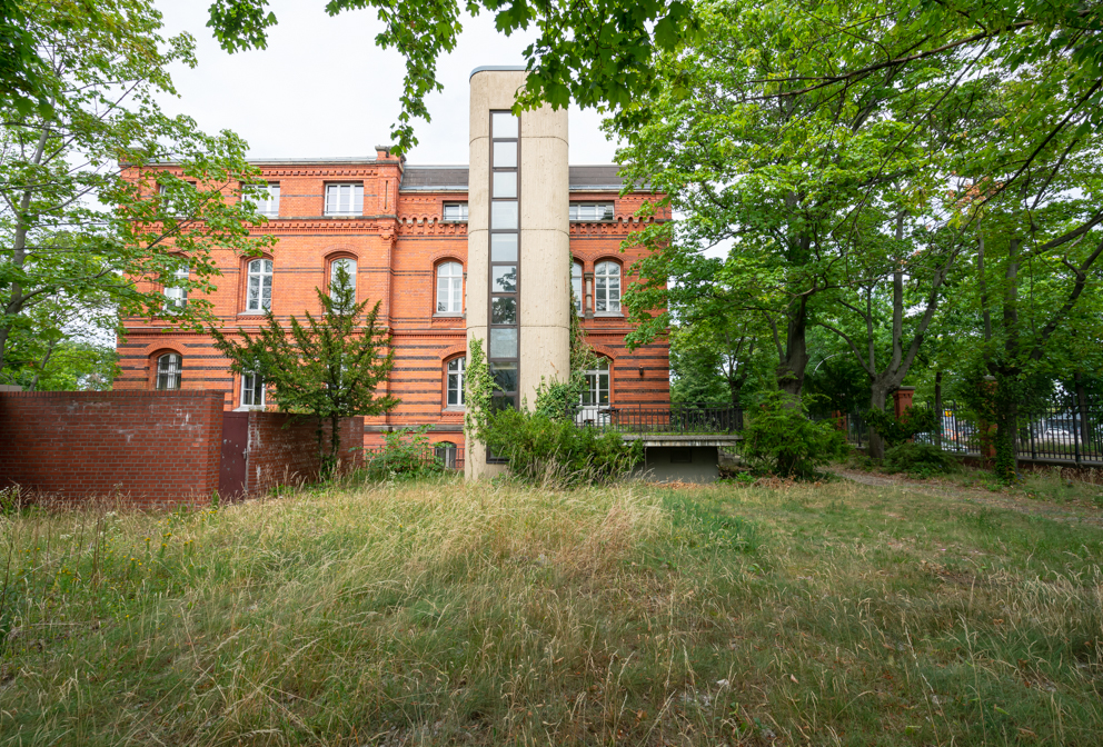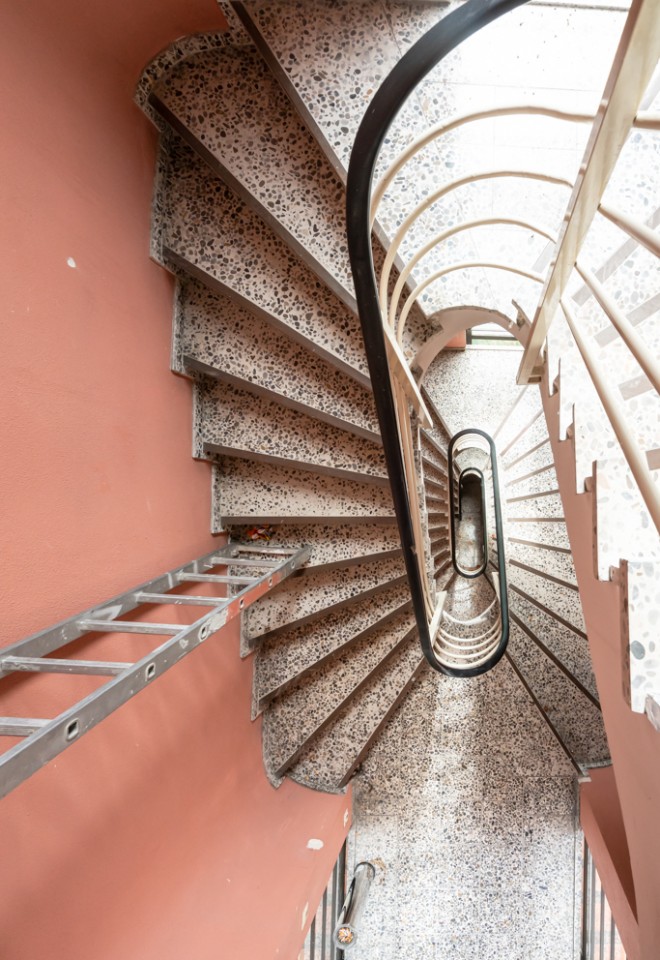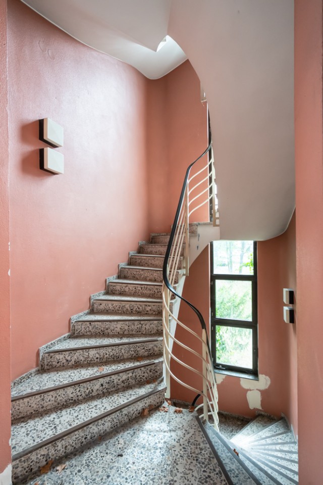 The residence also boasts unique architectural features including an elegant spiraling staircase with terrazzo flooring and speckled steps, combining classic and modern aesthetics. The dining area is particularly striking, furnished with a large wooden table, plush brown leather chairs beneath ambient pendant lighting, perfect for hosting gatherings or enjoying quiet family meals. An intriguing addition is the abandoned red-brick exterior, evocatively encircled by lush, overgrown greenery, adding a layer of historic charm and potential for creative restoration or picturesque landscaping.