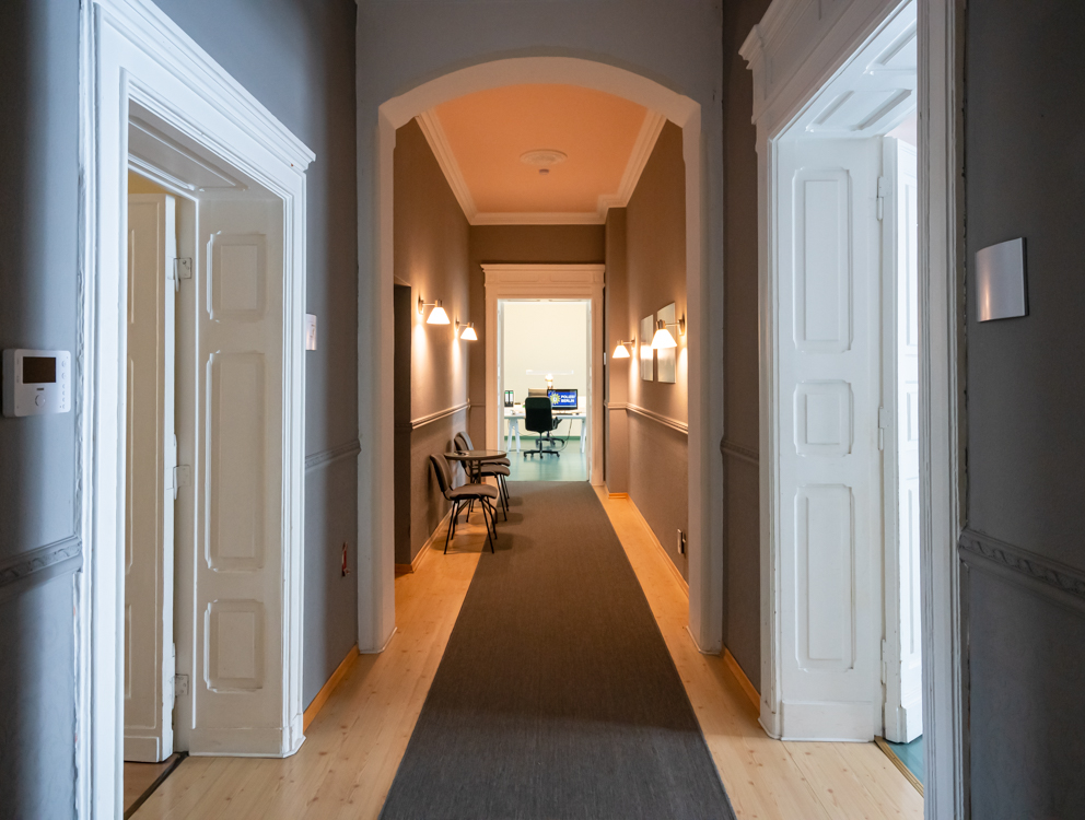 This refined property blends minimalist elegance and functional design across its various spaces, delivering an ideal environment for both living and working. The interiors showcase a series of minimalist rooms featuring smooth grey and soft pink walls complemented by wooden, leather, and glossy materials, creating spaces filled with serenity and thoughtful design. Noteworthy are the spacious office areas bathed in natural light, offering tranquil views of the surrounding greenery and furnished with updated desks, computers, and modern office chairs, facilitating a perfect work environment that encourages productivity and calm.
