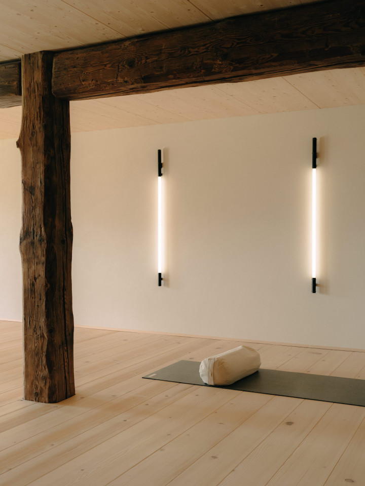 RITUAL ROOM (60 m² / 645 ft²) - The Ritual Room is a separate, light-filled room facing south. It is clad in white fir (floor, walls) and natural clay plaster (walls) and is suitable for yoga or meditation, for example. Equipped with Yoga Mats, Pillows, NOHRD fitness equipment and a B&O Sound System.