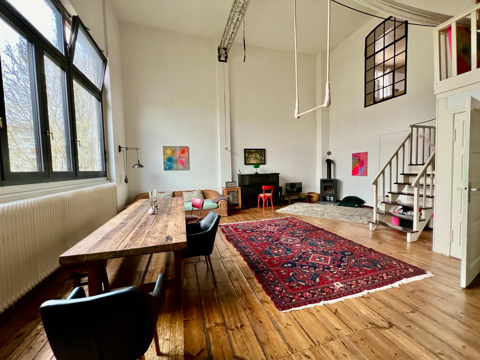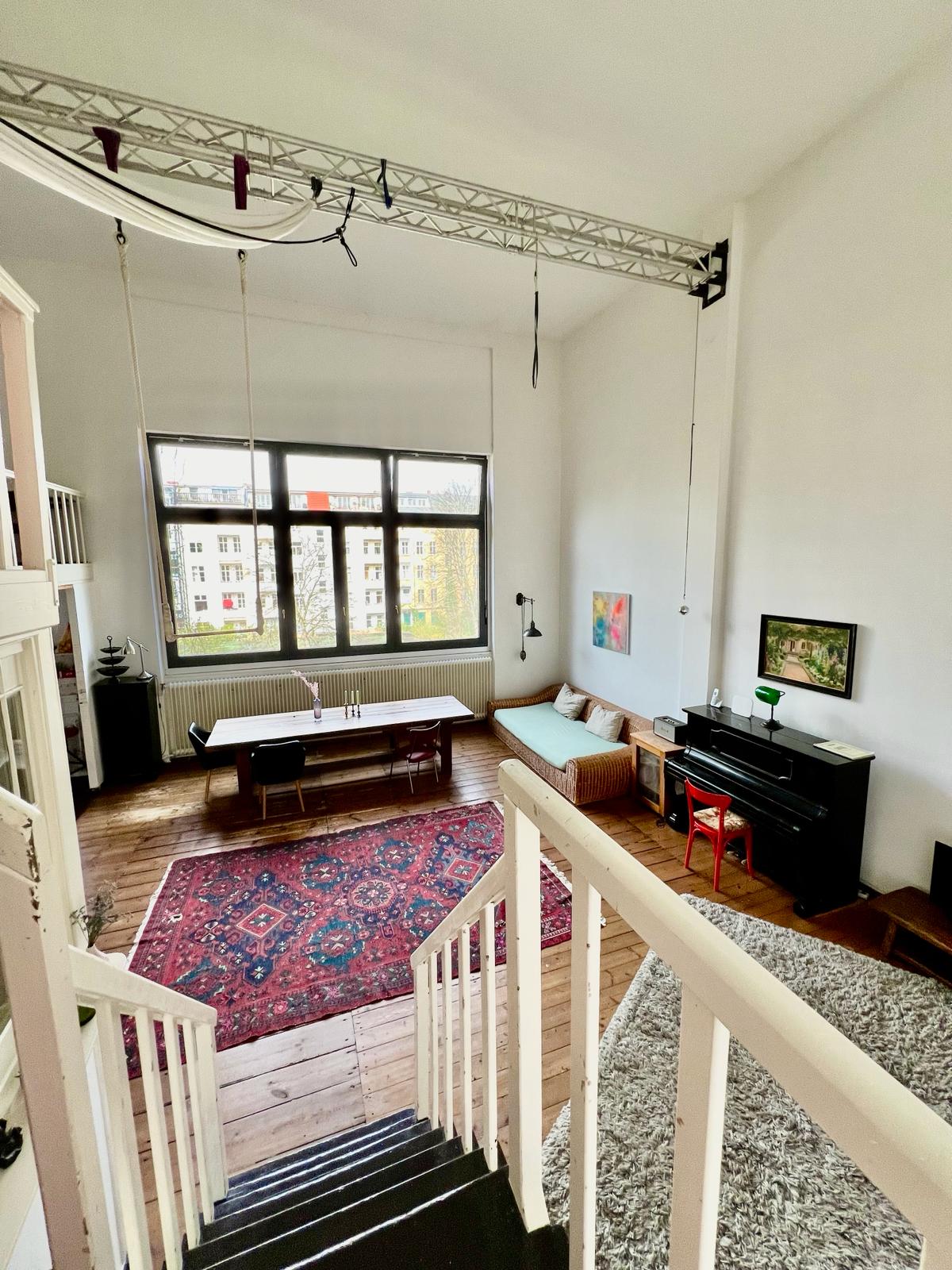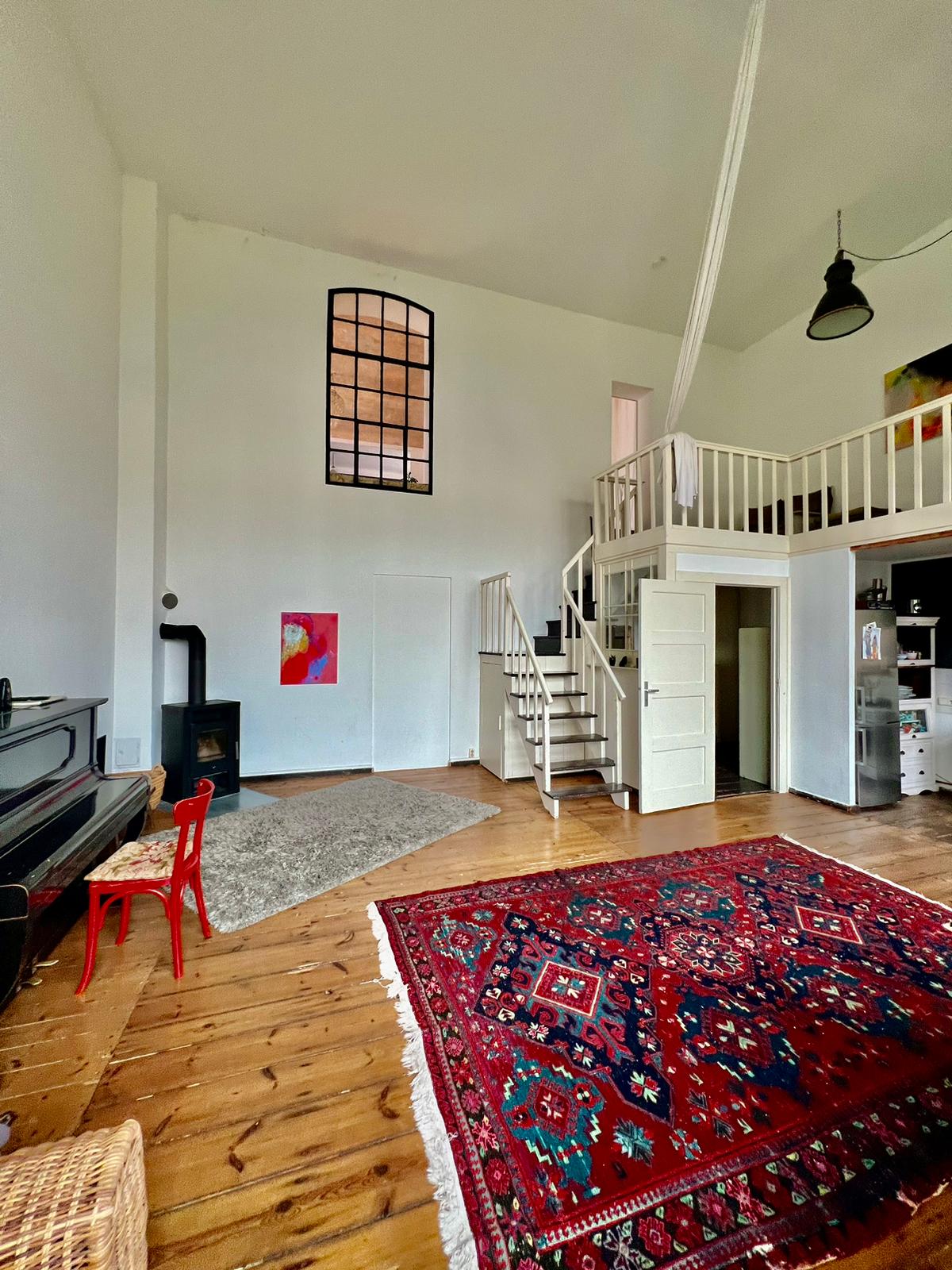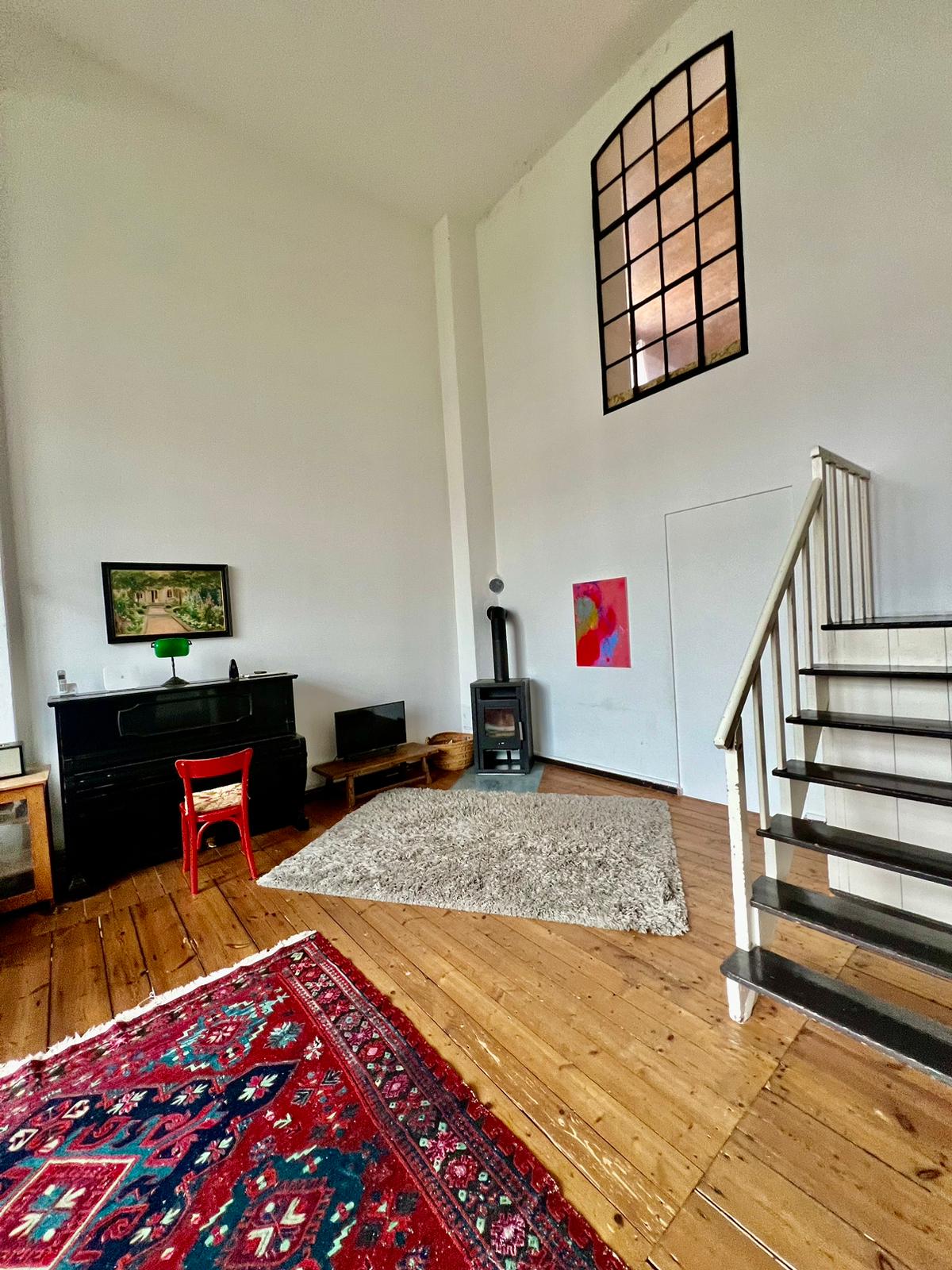 Experience a vibrant blend of modern comfort and artistic style in this spacious loft. The heart of the apartment features wooden flooring and large windows which bathe the space in natural light, emphasizing the eclectic decor that includes a striking yellow sofa, a grand piano, and a lush, red carpet. Ideal for entertaining and relaxing, the living room merges seamlessly into a minimalist kitchen equipped with sleek appliances and rustic elements, creating a perfect urban retreat.