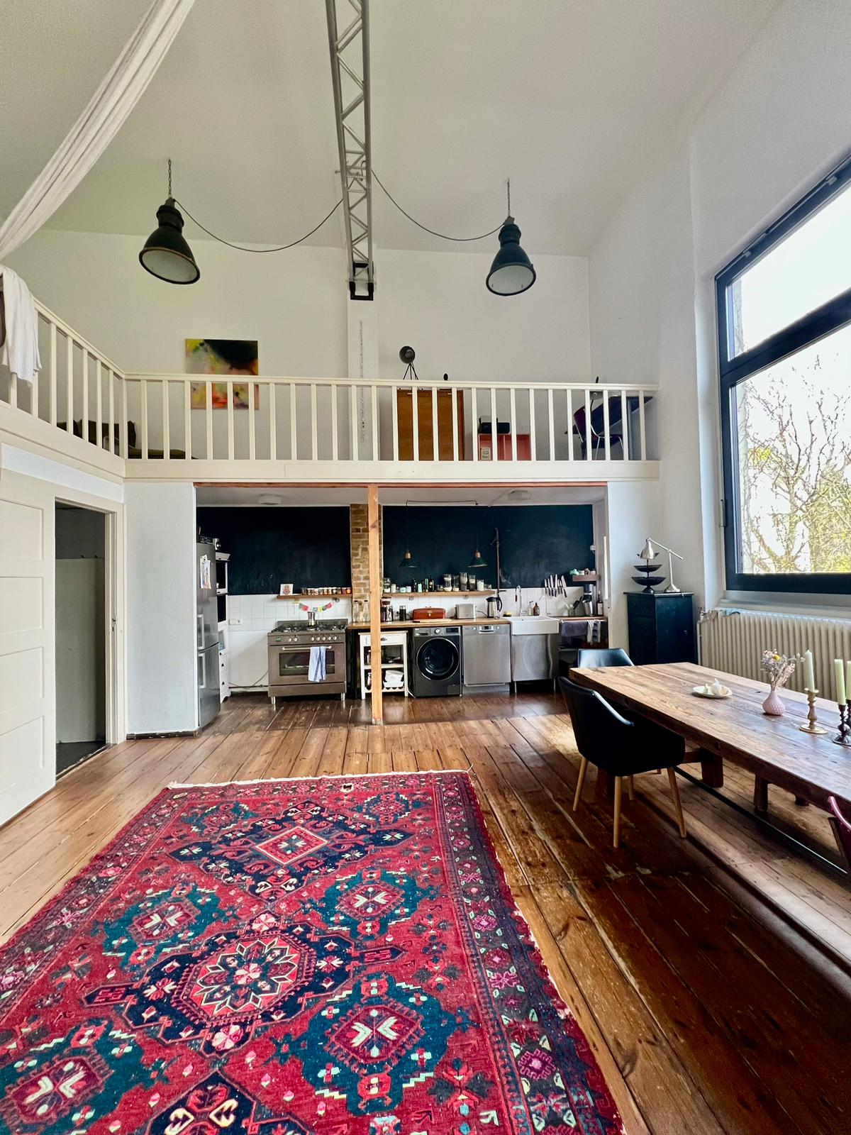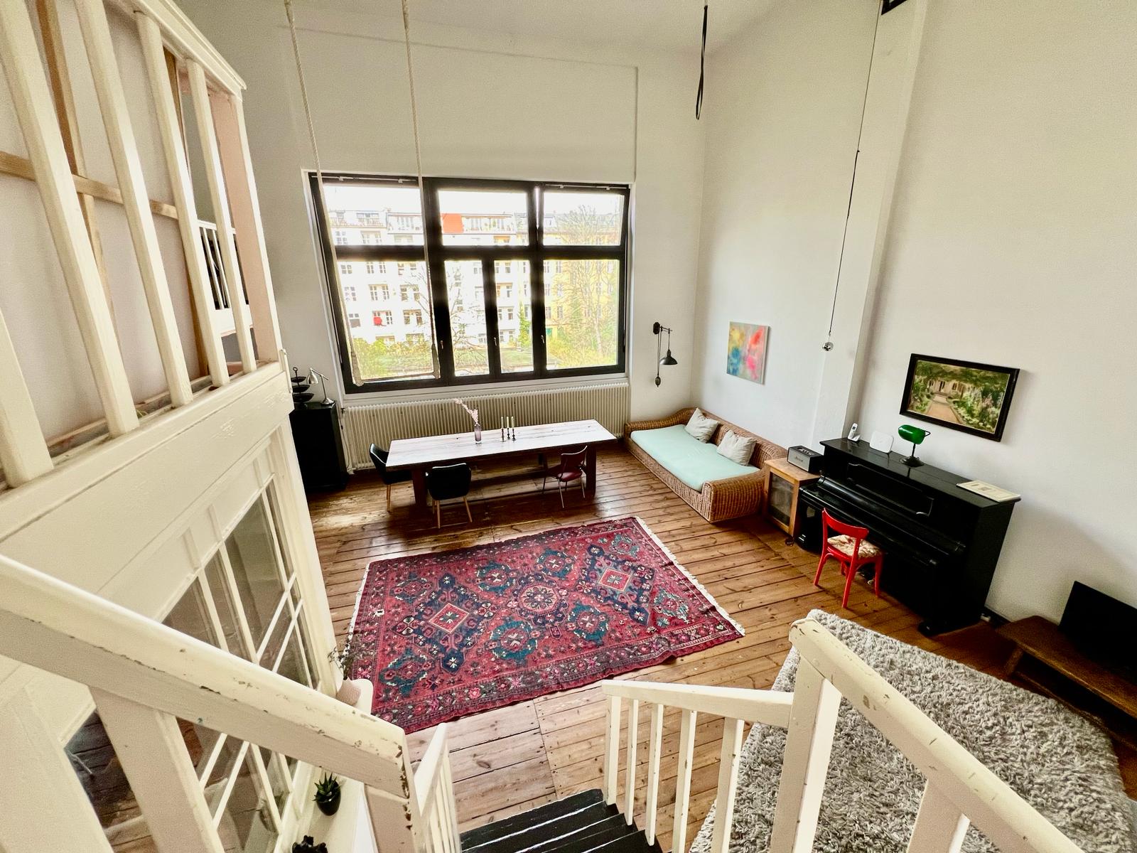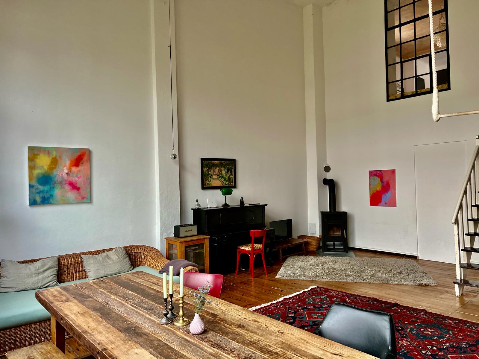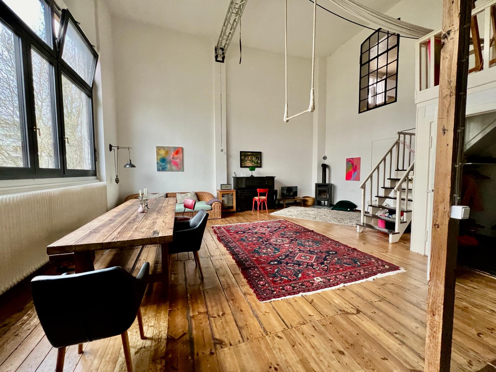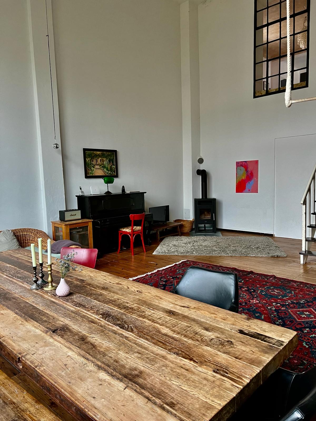 Experience a vibrant blend of modern comfort and artistic style in this spacious loft. The heart of the apartment features wooden flooring and large windows which bathe the space in natural light, emphasizing the eclectic decor that includes a striking yellow sofa, a grand piano, and a lush, red carpet. Ideal for entertaining and relaxing, the living room merges seamlessly into a minimalist kitchen equipped with sleek appliances and rustic elements, creating a perfect urban retreat.