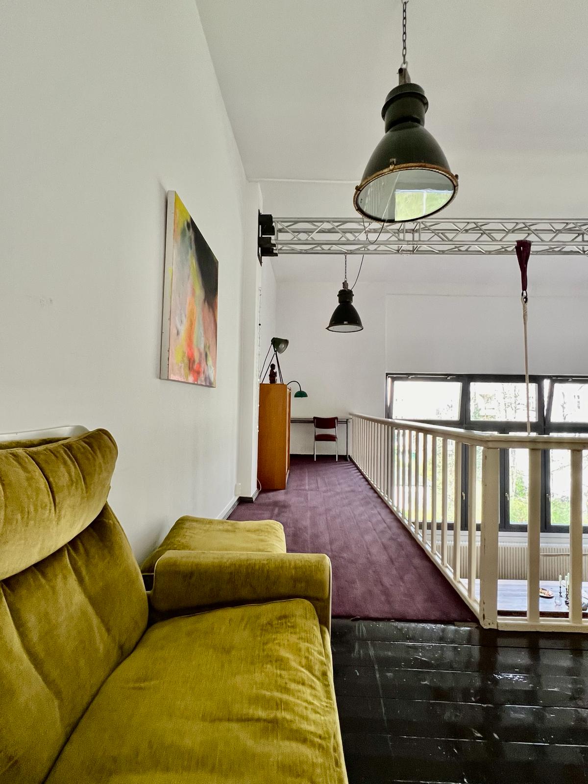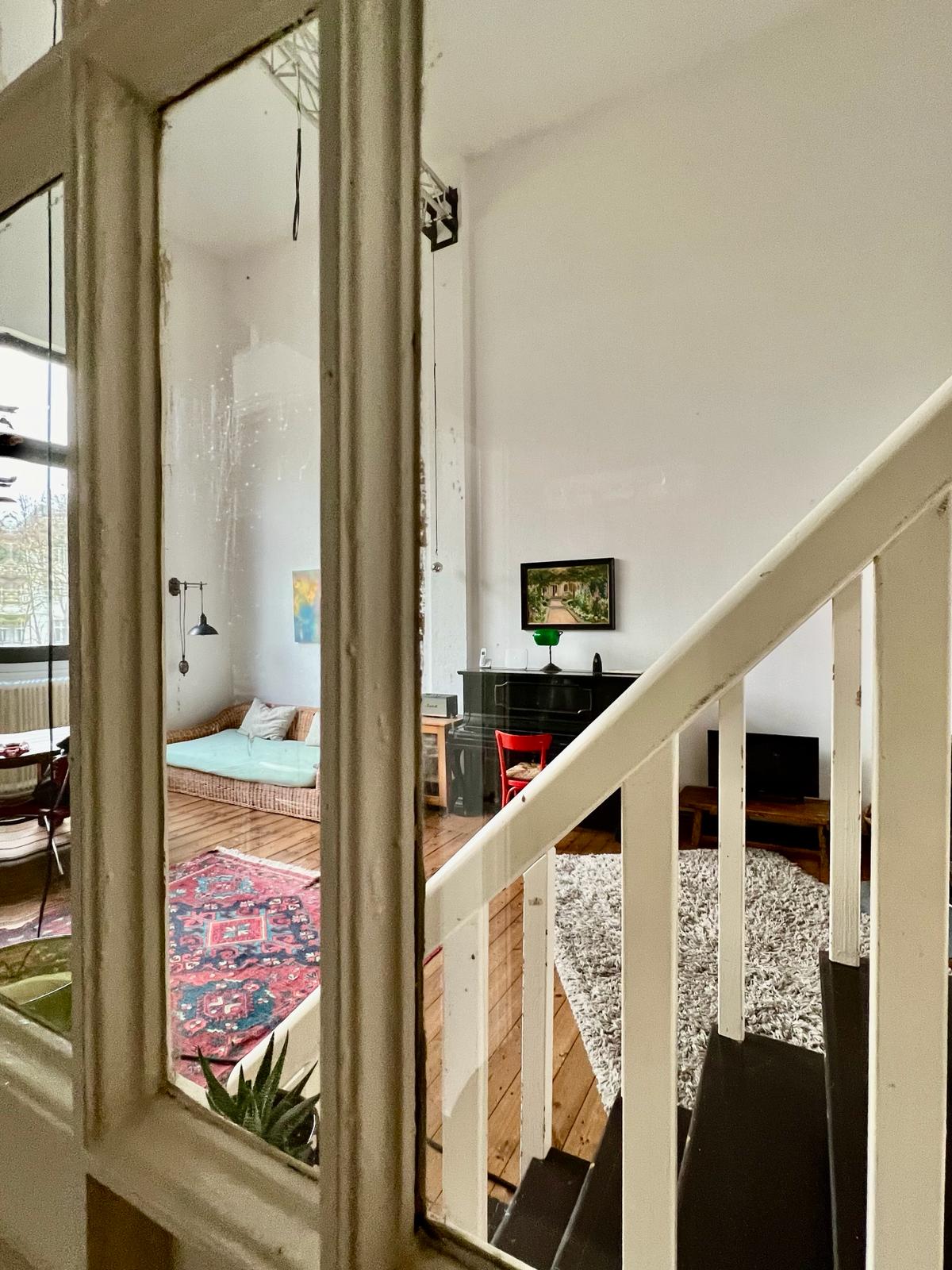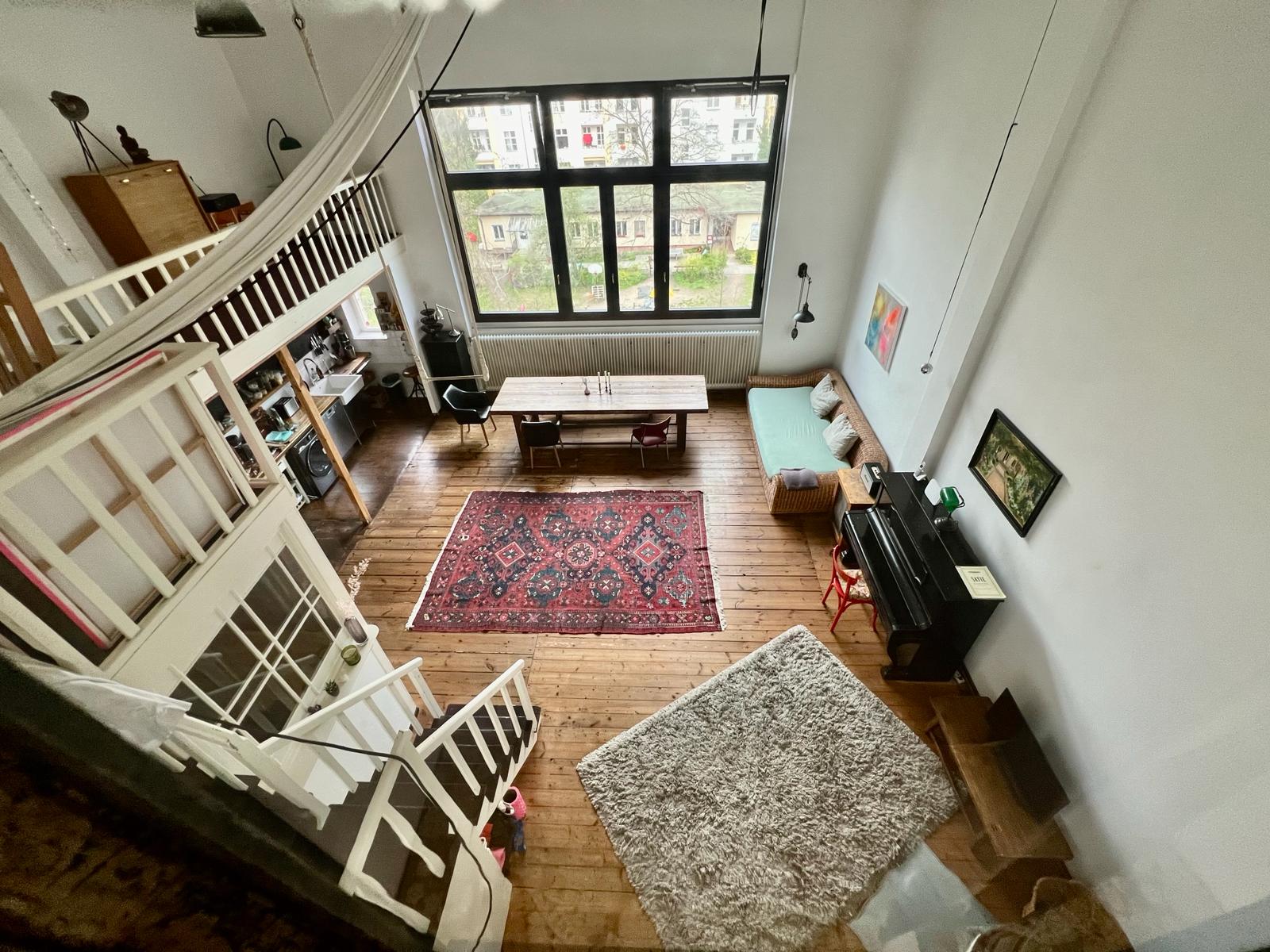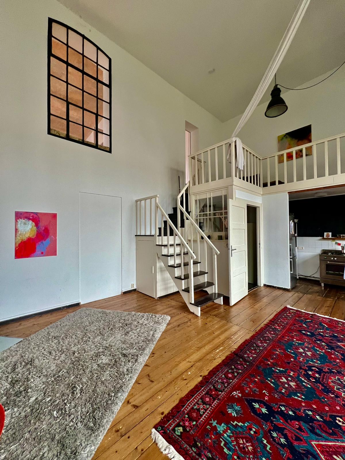 Experience a vibrant blend of modern comfort and artistic style in this spacious loft. The heart of the apartment features wooden flooring and large windows which bathe the space in natural light, emphasizing the eclectic decor that includes a striking yellow sofa, a grand piano, and a lush, red carpet. Ideal for entertaining and relaxing, the living room merges seamlessly into a minimalist kitchen equipped with sleek appliances and rustic elements, creating a perfect urban retreat.