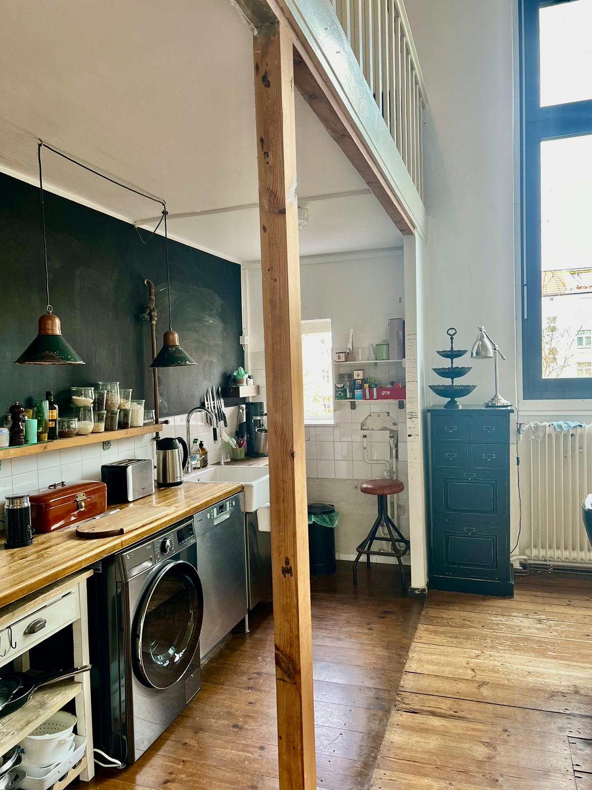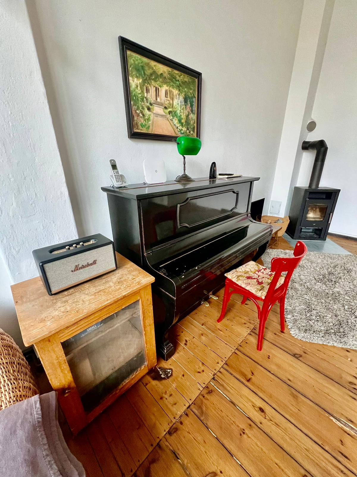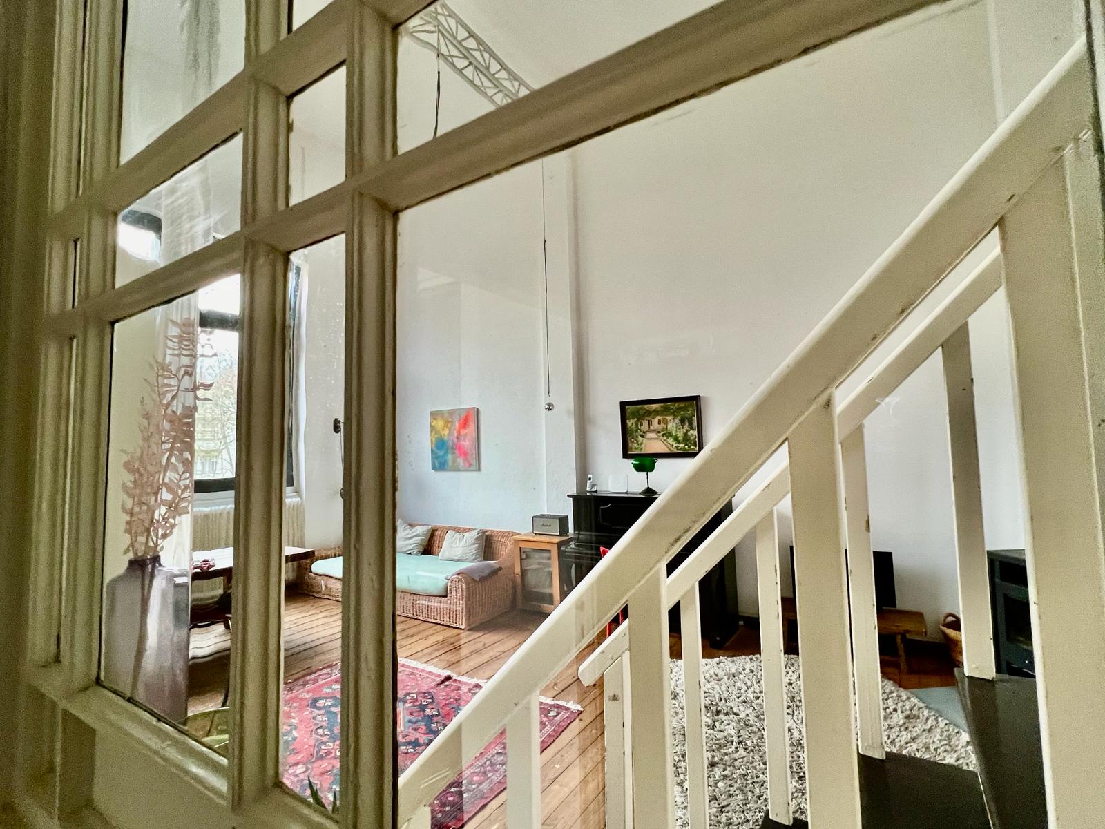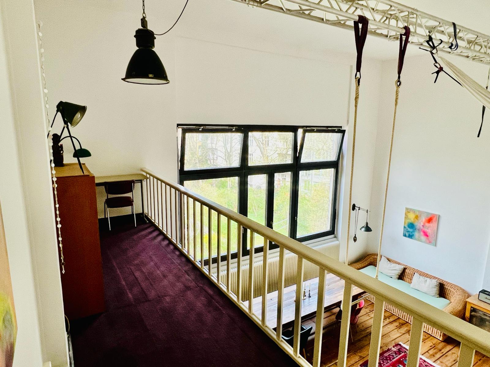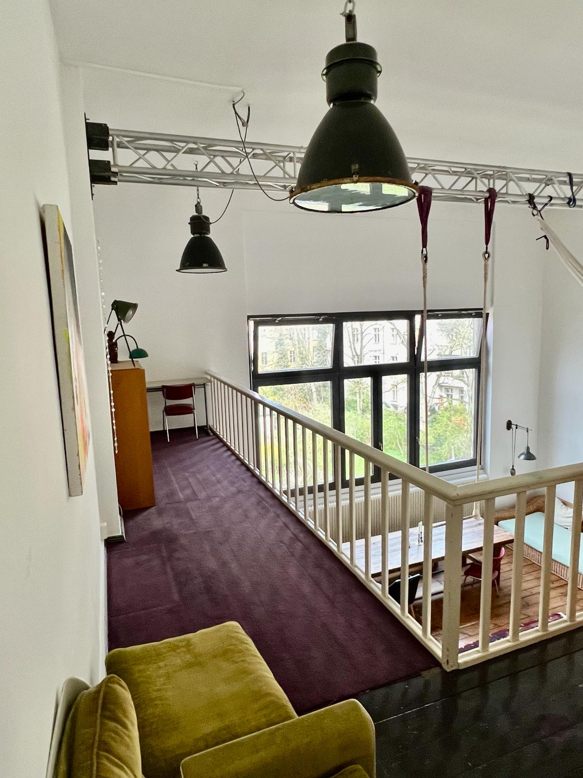Experience a vibrant blend of modern comfort and artistic style in this spacious loft. The heart of the apartment features wooden flooring and large windows which bathe the space in natural light, emphasizing the eclectic decor that includes a striking yellow sofa, a grand piano, and a lush, red carpet. Ideal for entertaining and relaxing, the living room merges seamlessly into a minimalist kitchen equipped with sleek appliances and rustic elements, creating a perfect urban retreat.
