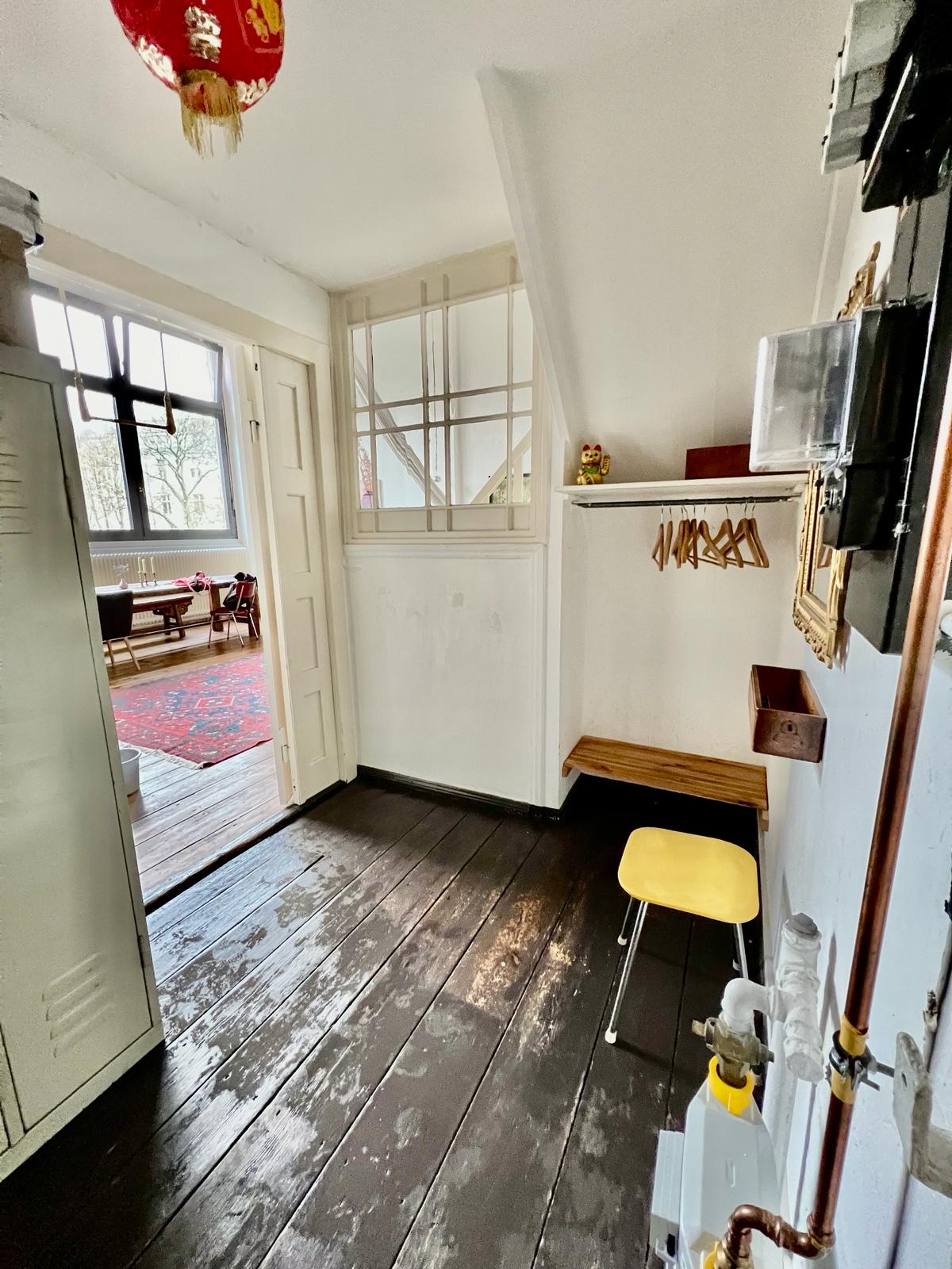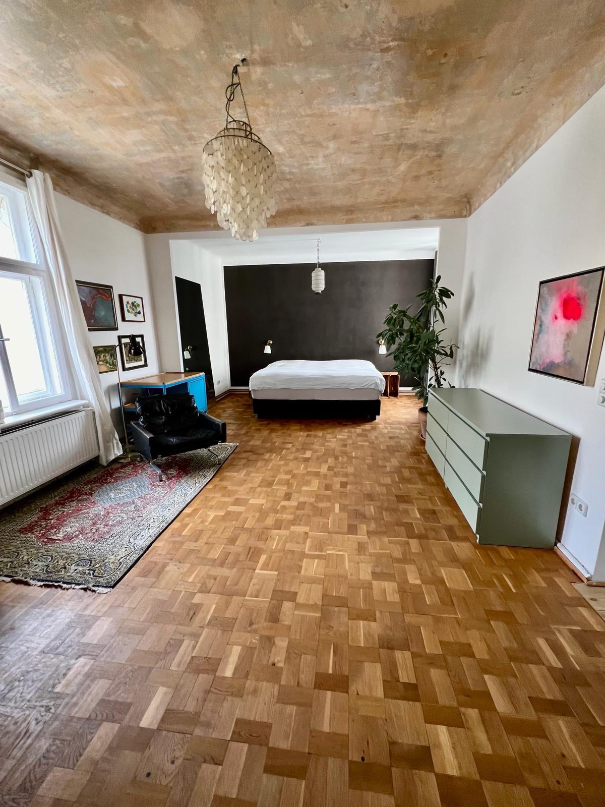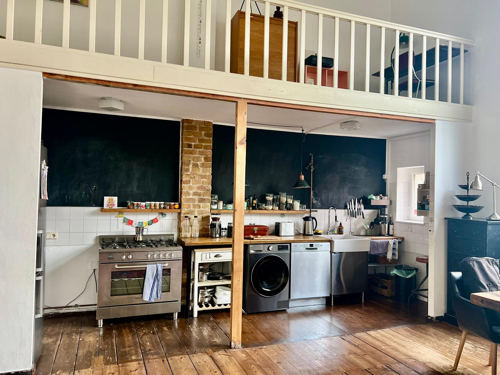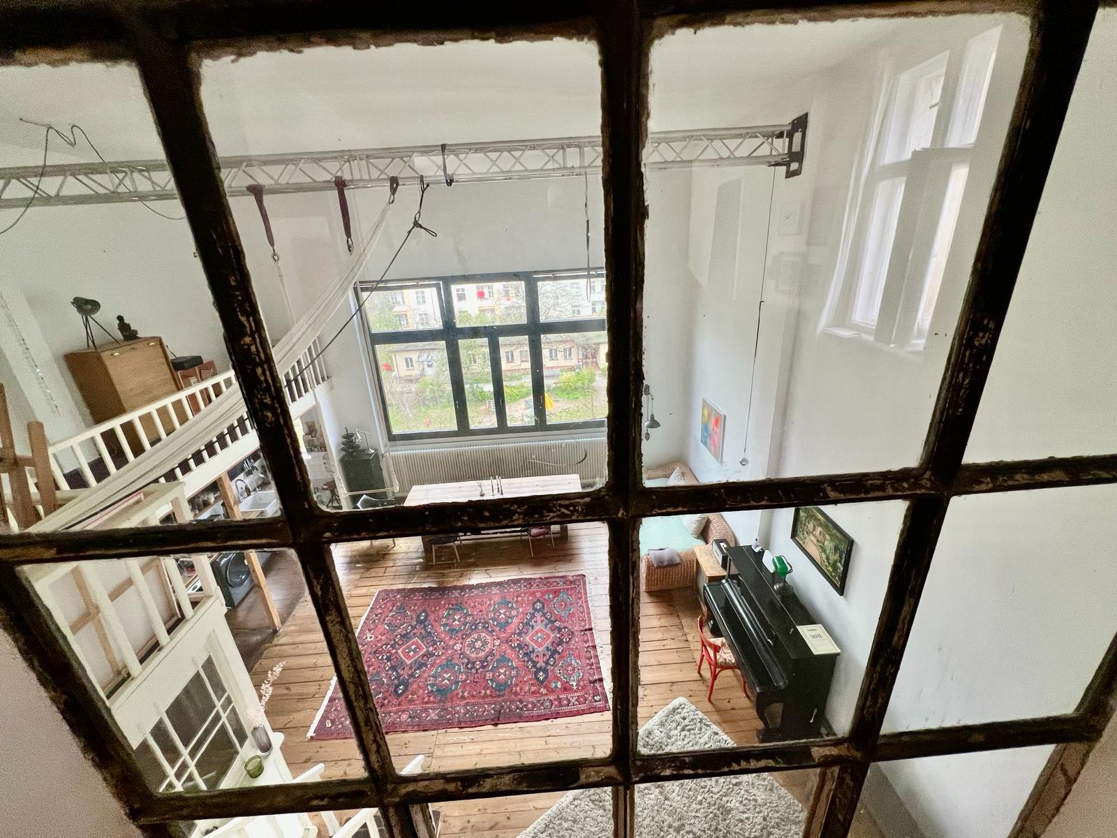 Experience a vibrant blend of modern comfort and artistic style in this spacious loft. The heart of the apartment features wooden flooring and large windows which bathe the space in natural light, emphasizing the eclectic decor that includes a striking yellow sofa, a grand piano, and a lush, red carpet. Ideal for entertaining and relaxing, the living room merges seamlessly into a minimalist kitchen equipped with sleek appliances and rustic elements, creating a perfect urban retreat.