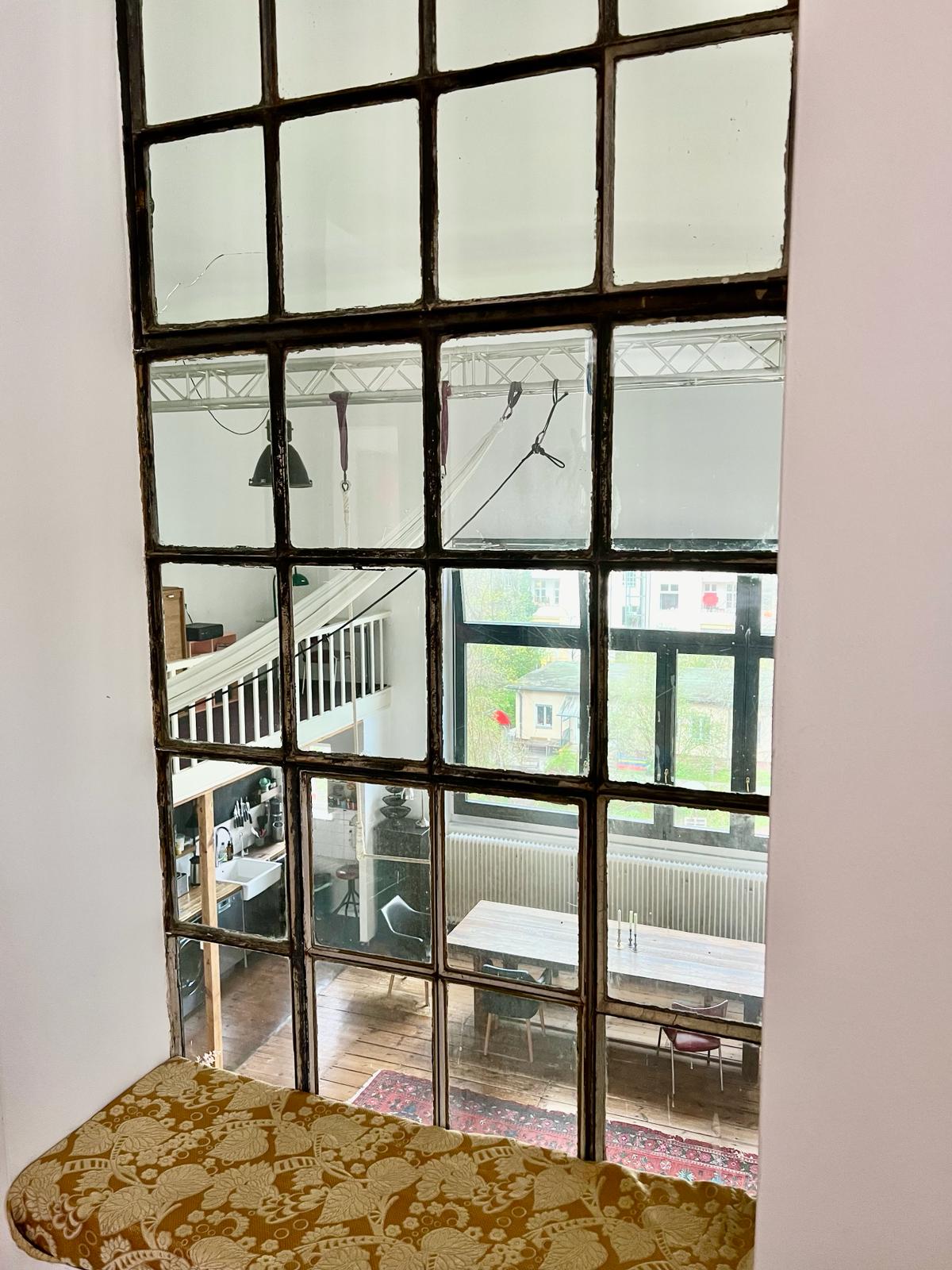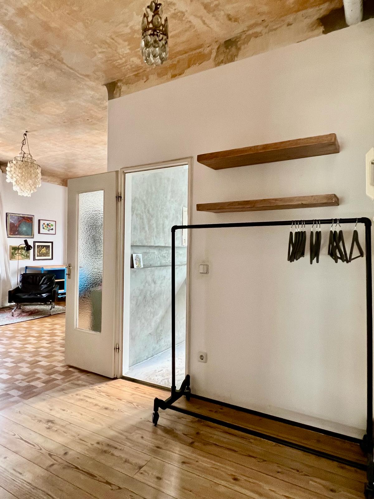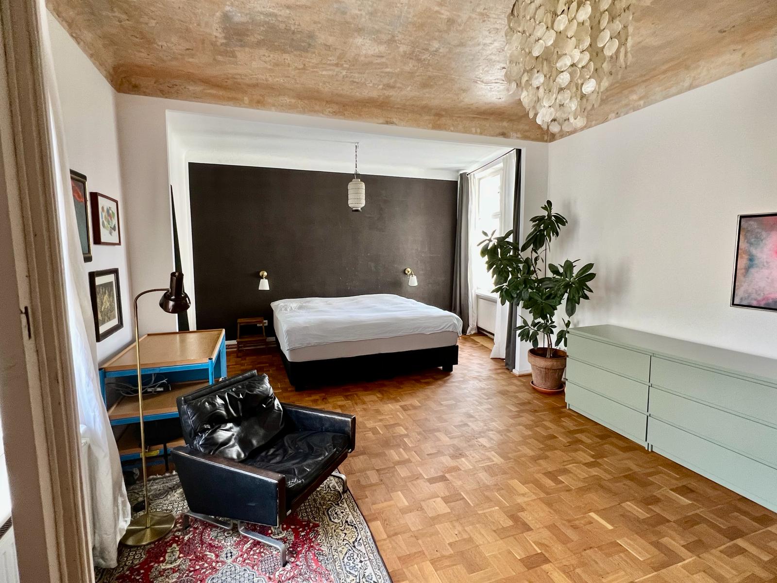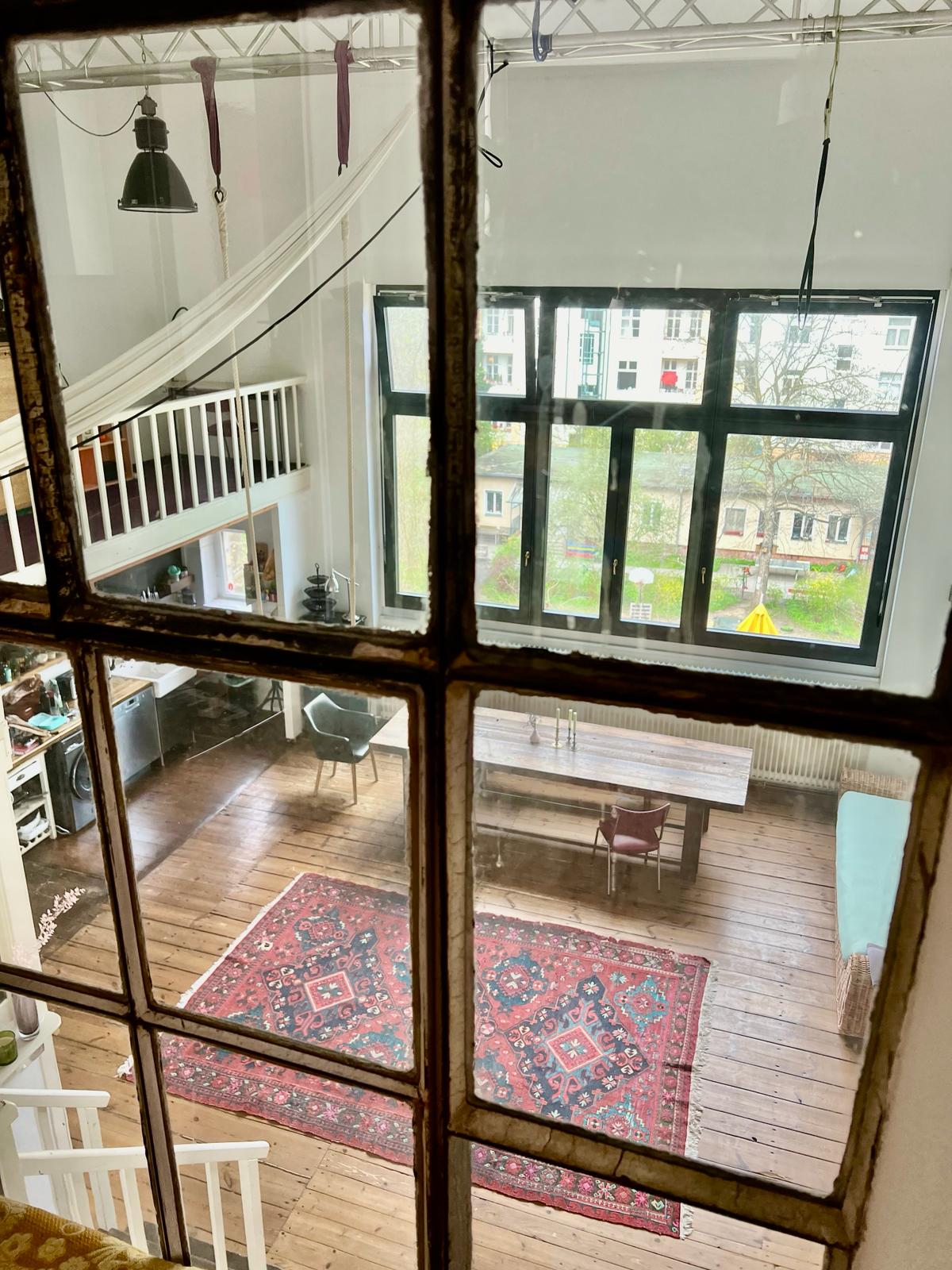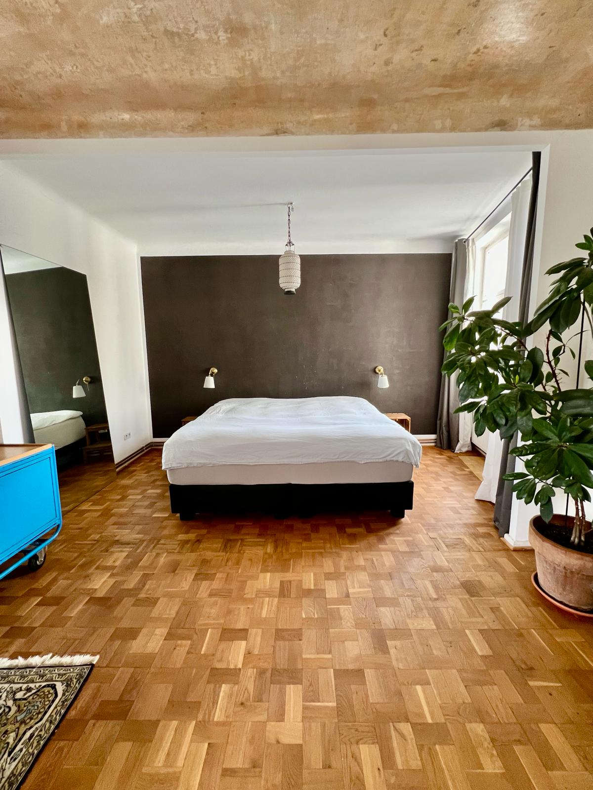 Experience a vibrant blend of modern comfort and artistic style in this spacious loft. The heart of the apartment features wooden flooring and large windows which bathe the space in natural light, emphasizing the eclectic decor that includes a striking yellow sofa, a grand piano, and a lush, red carpet. Ideal for entertaining and relaxing, the living room merges seamlessly into a minimalist kitchen equipped with sleek appliances and rustic elements, creating a perfect urban retreat.