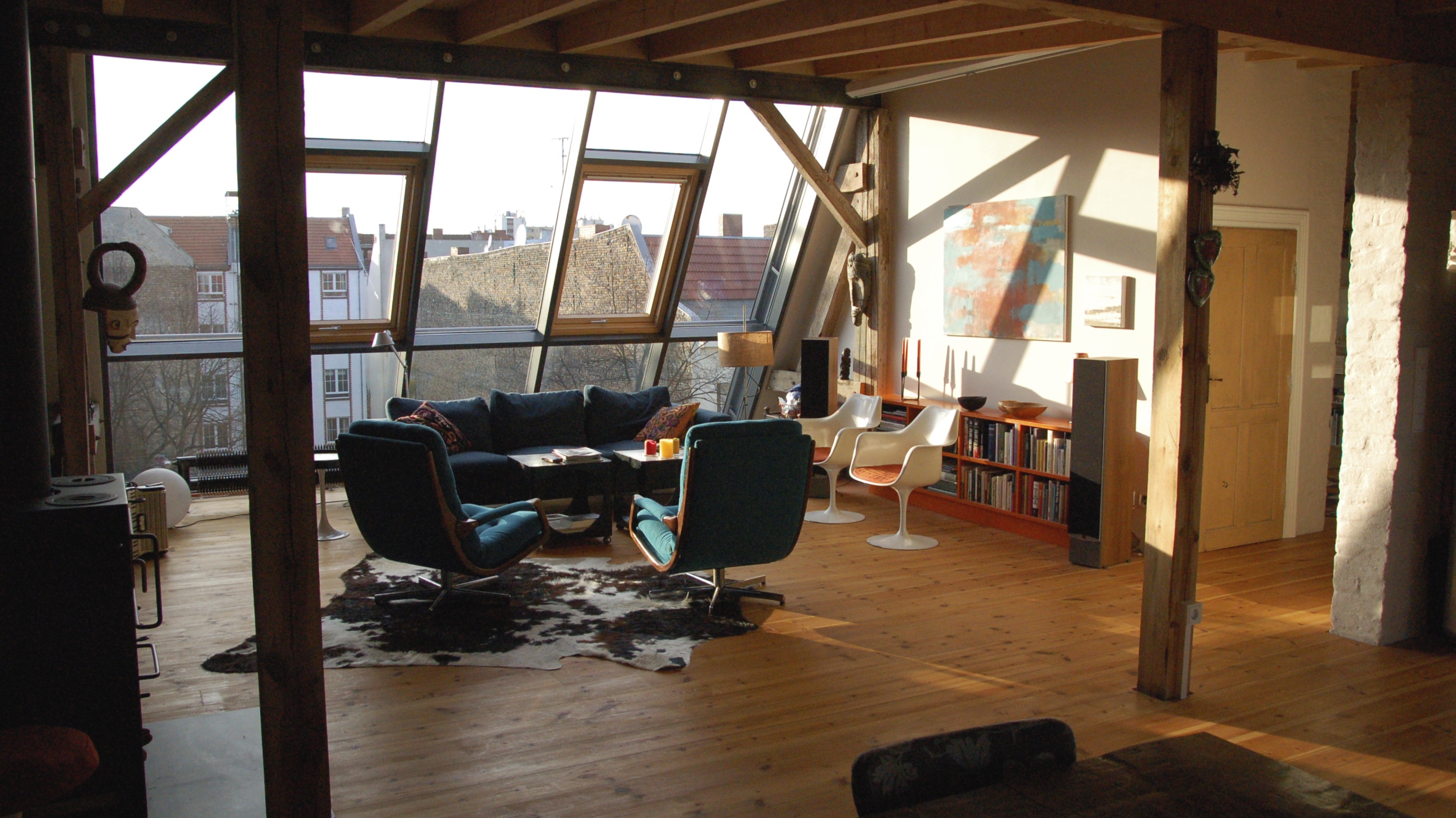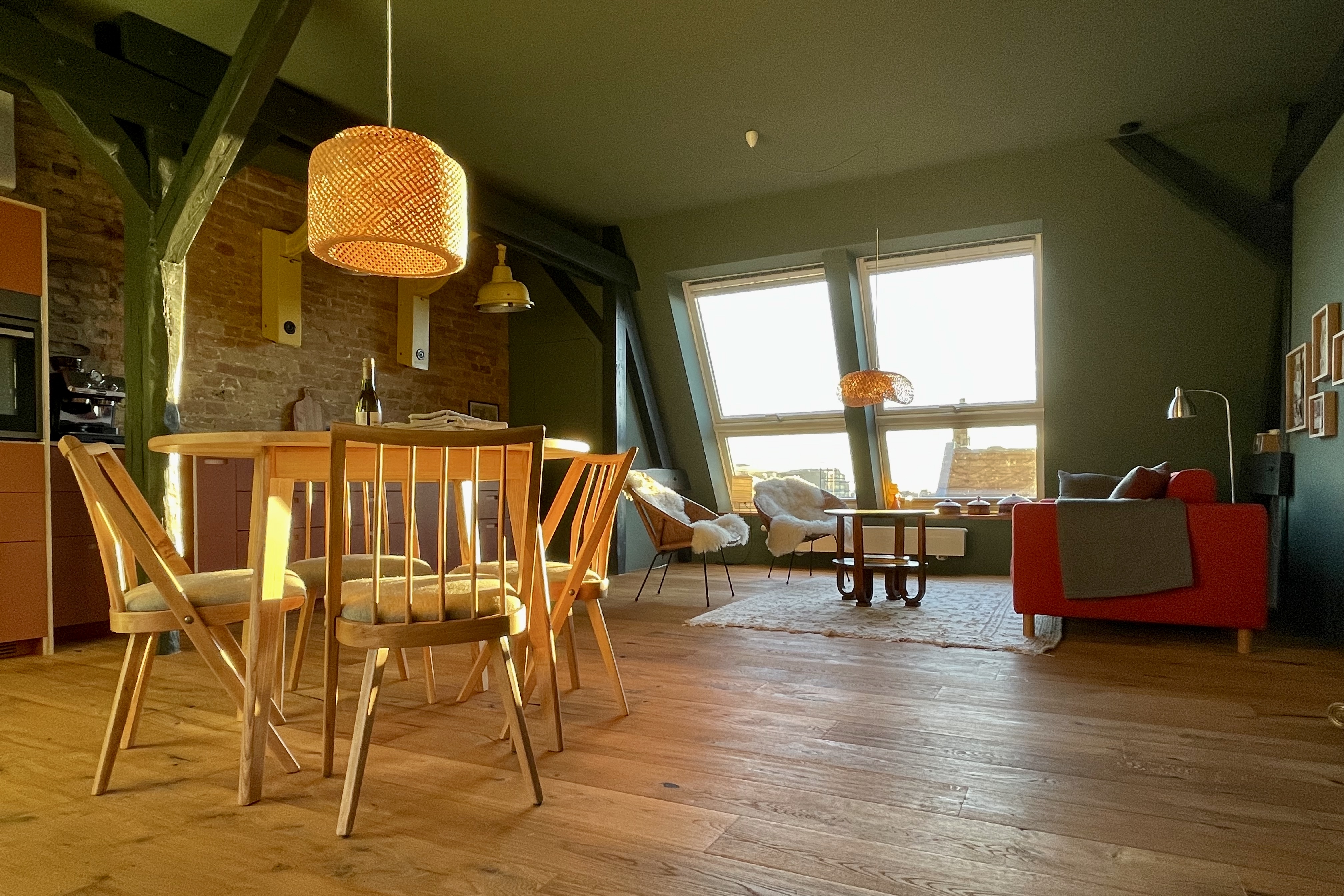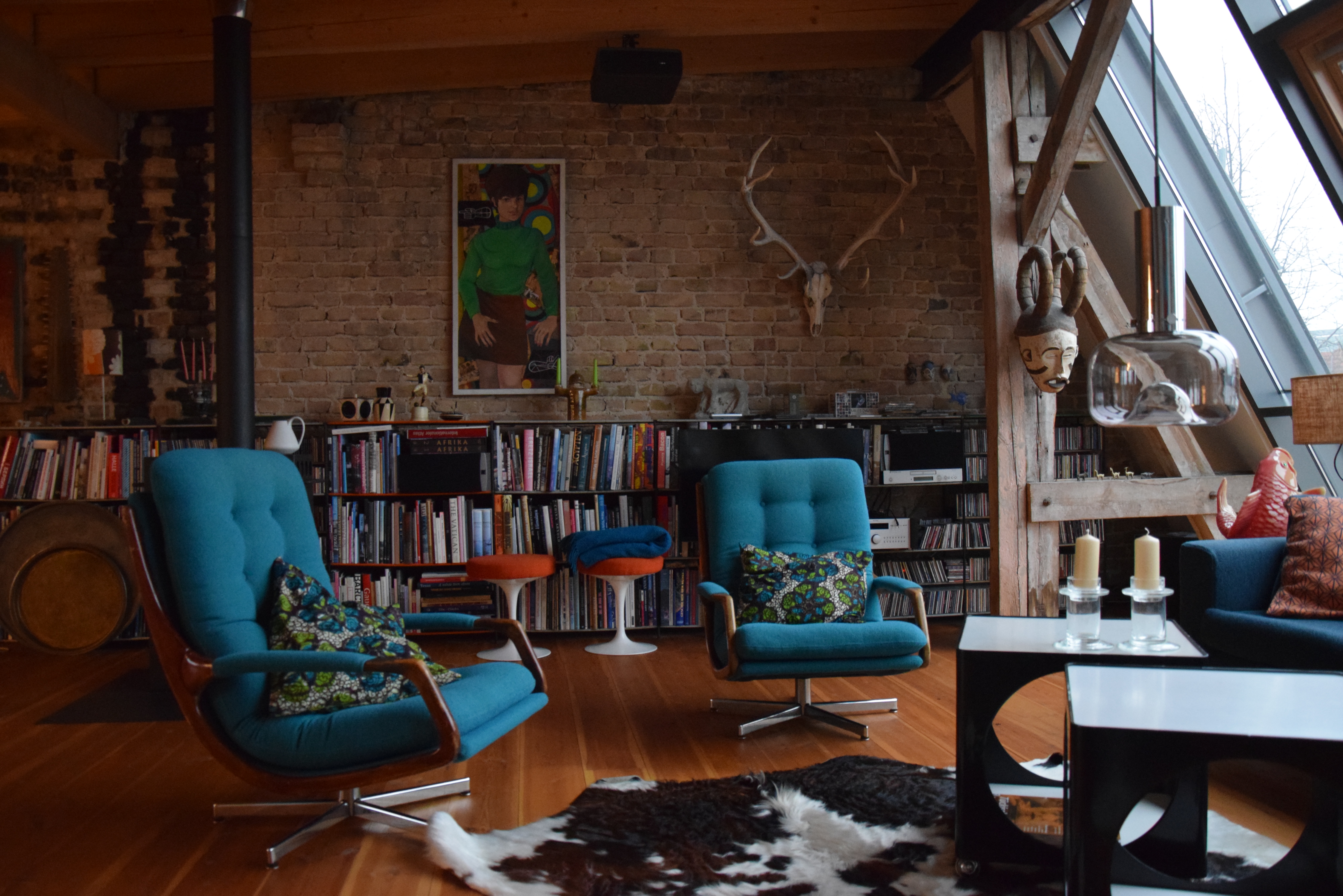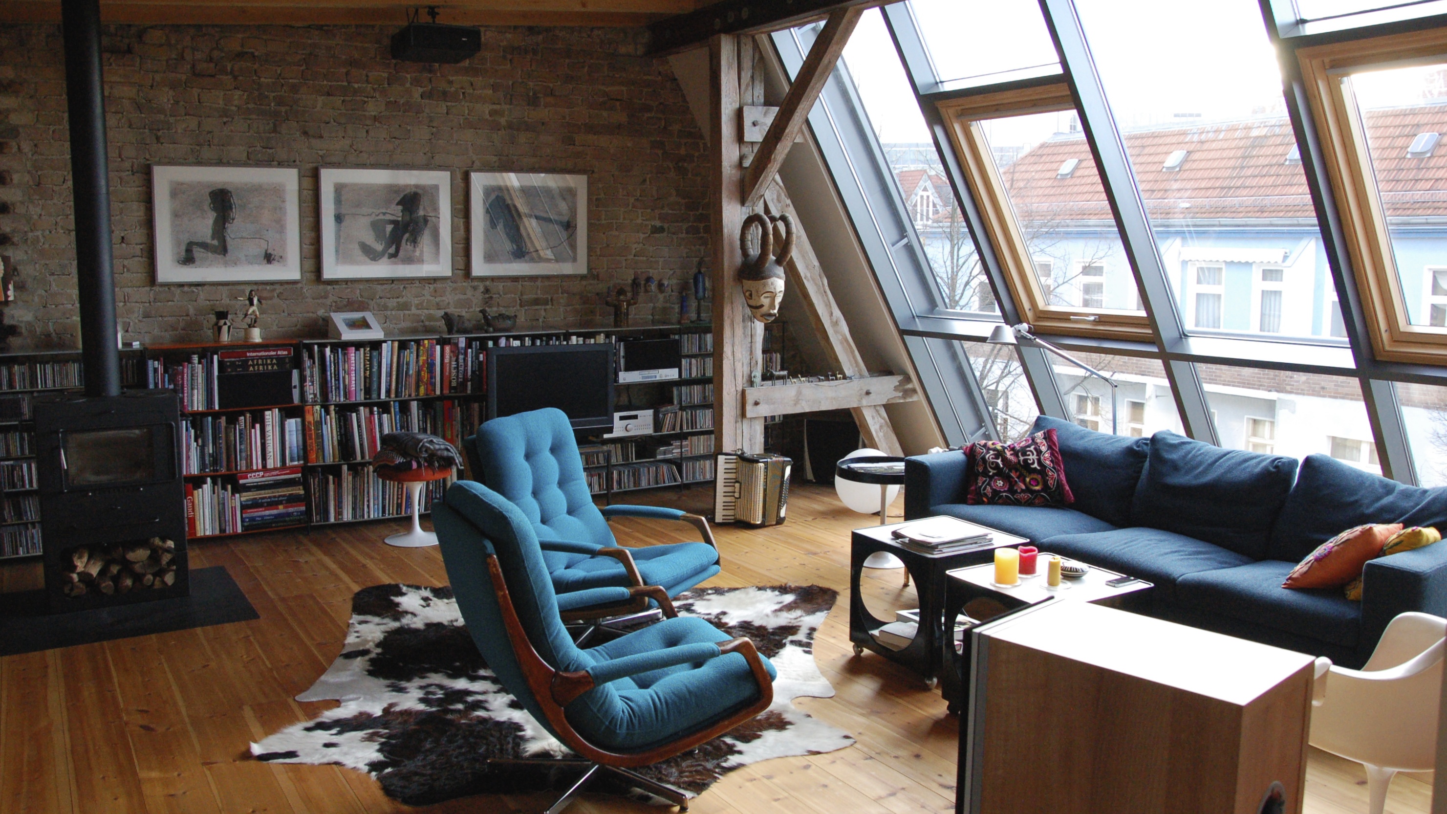 Experience the epitome of urban living in this exquisite loft, combining the allure of rustic modern interiors with the vibrant energy of city life. This loft features a stylish living room adorned with blue furniture, eclectic decor, and expansive windows that flood the space with natural light, creating a warm and inviting atmosphere. The space is versatile, perfect for both relaxation with its cozy armchairs and cowhide rug, and entertainment, highlighted by a striking fireplace and a well-stocked bookshelf.