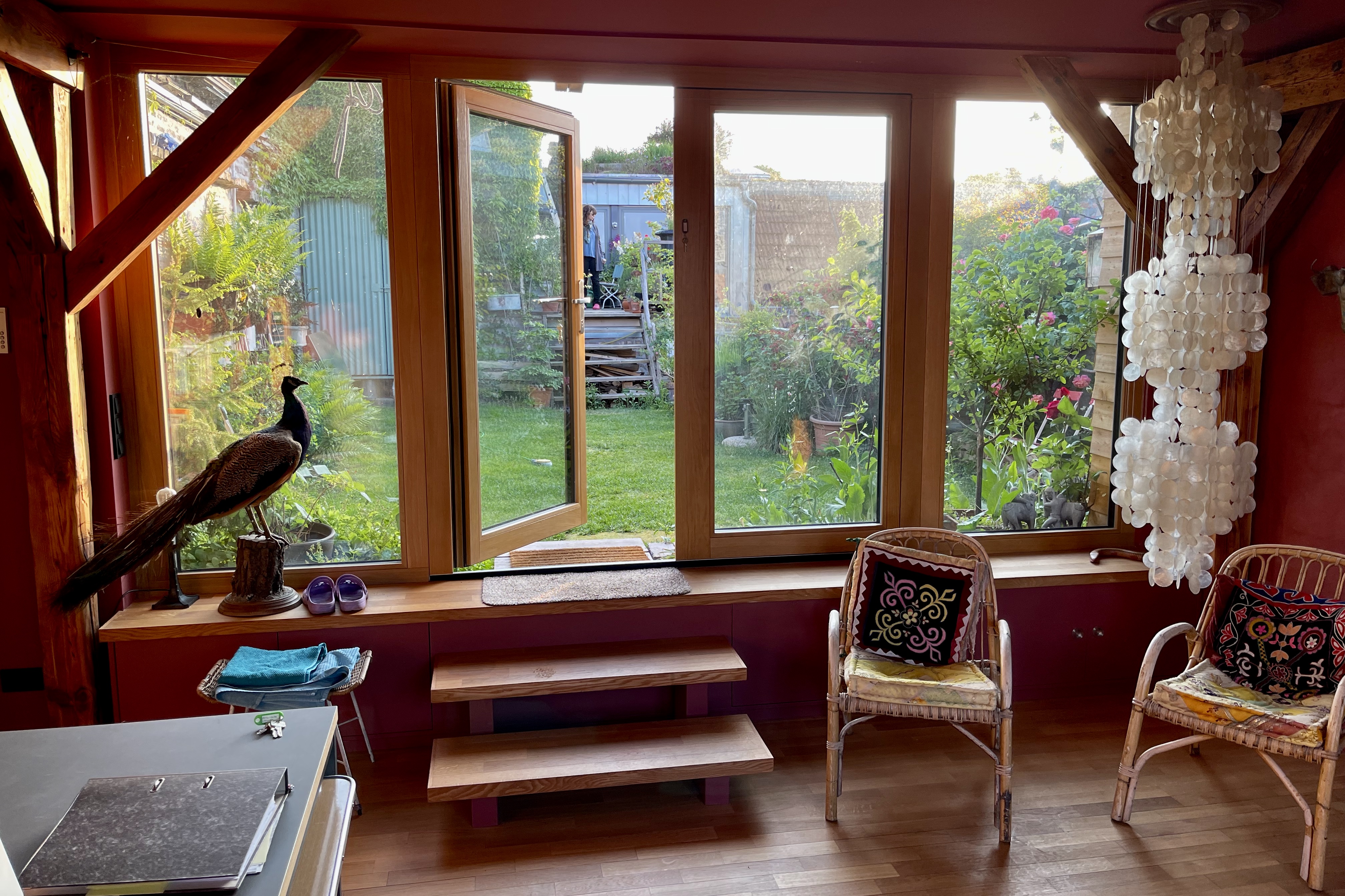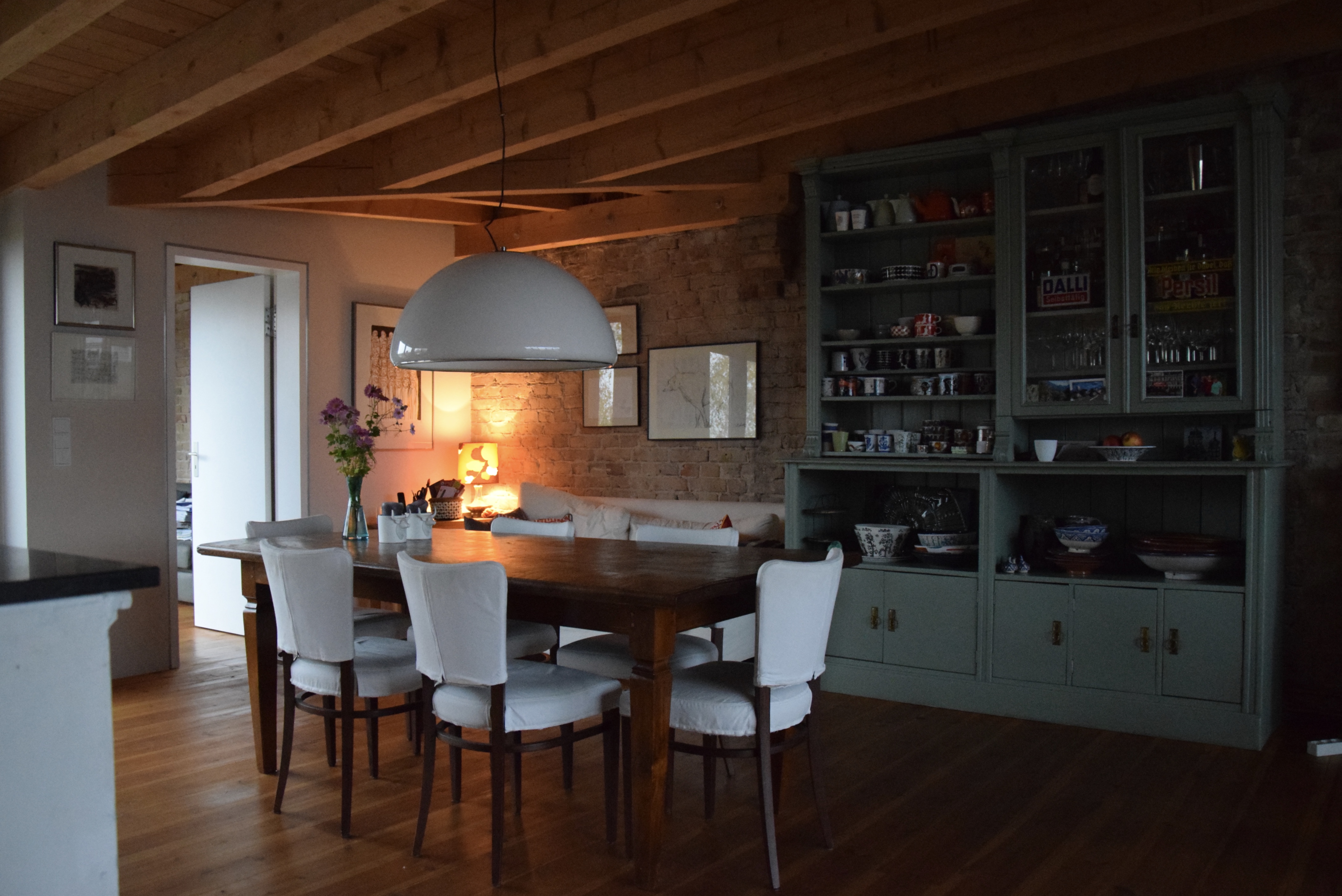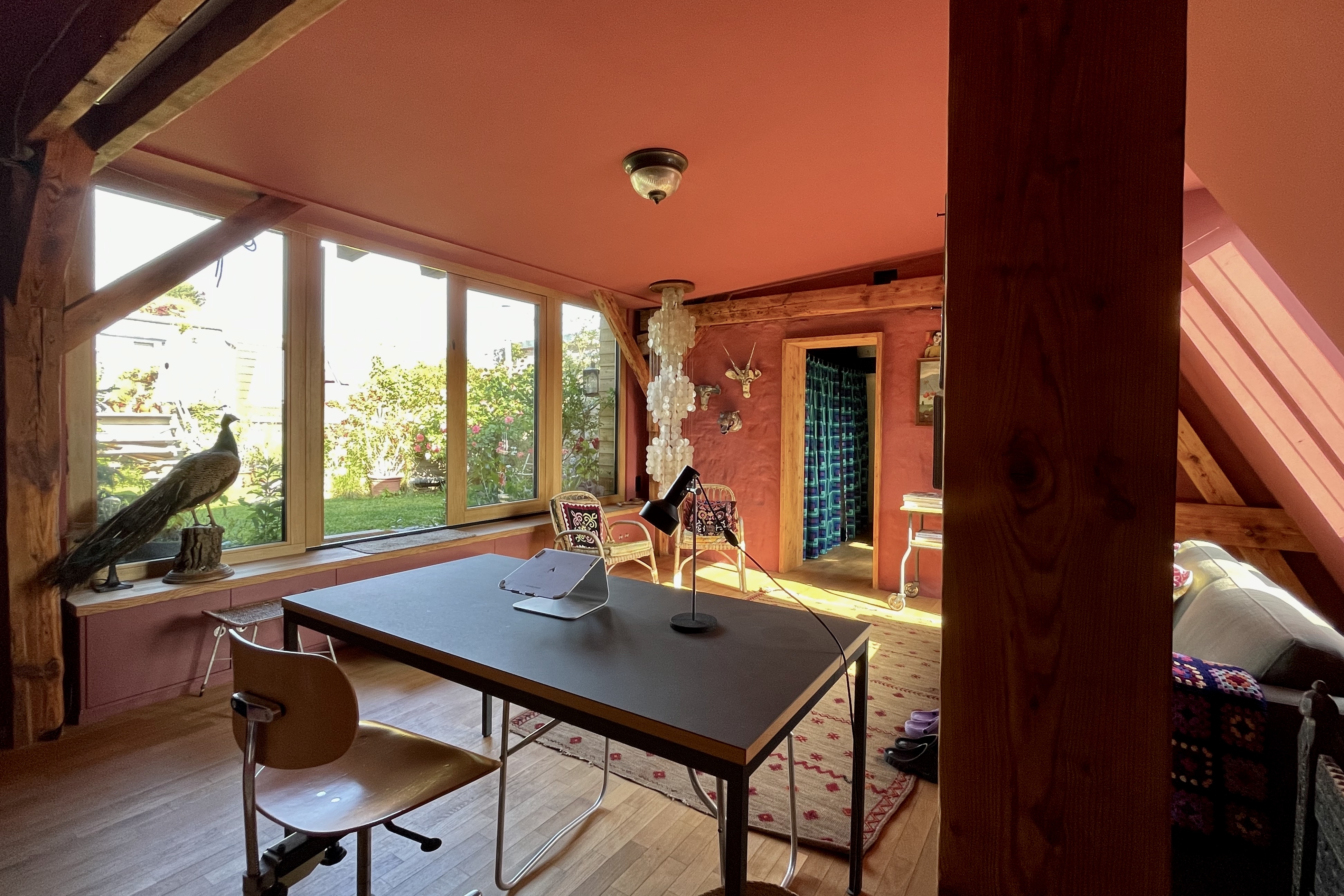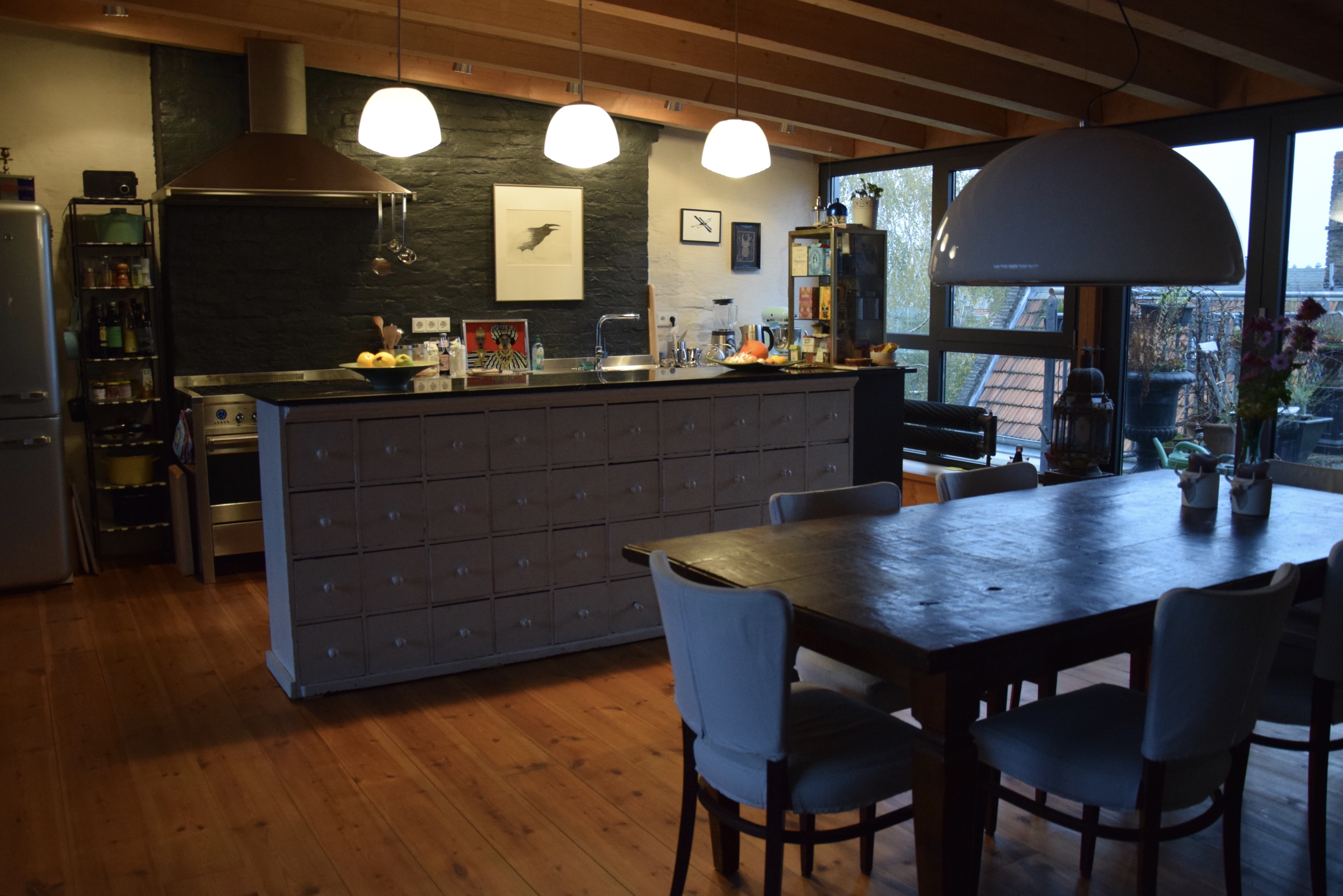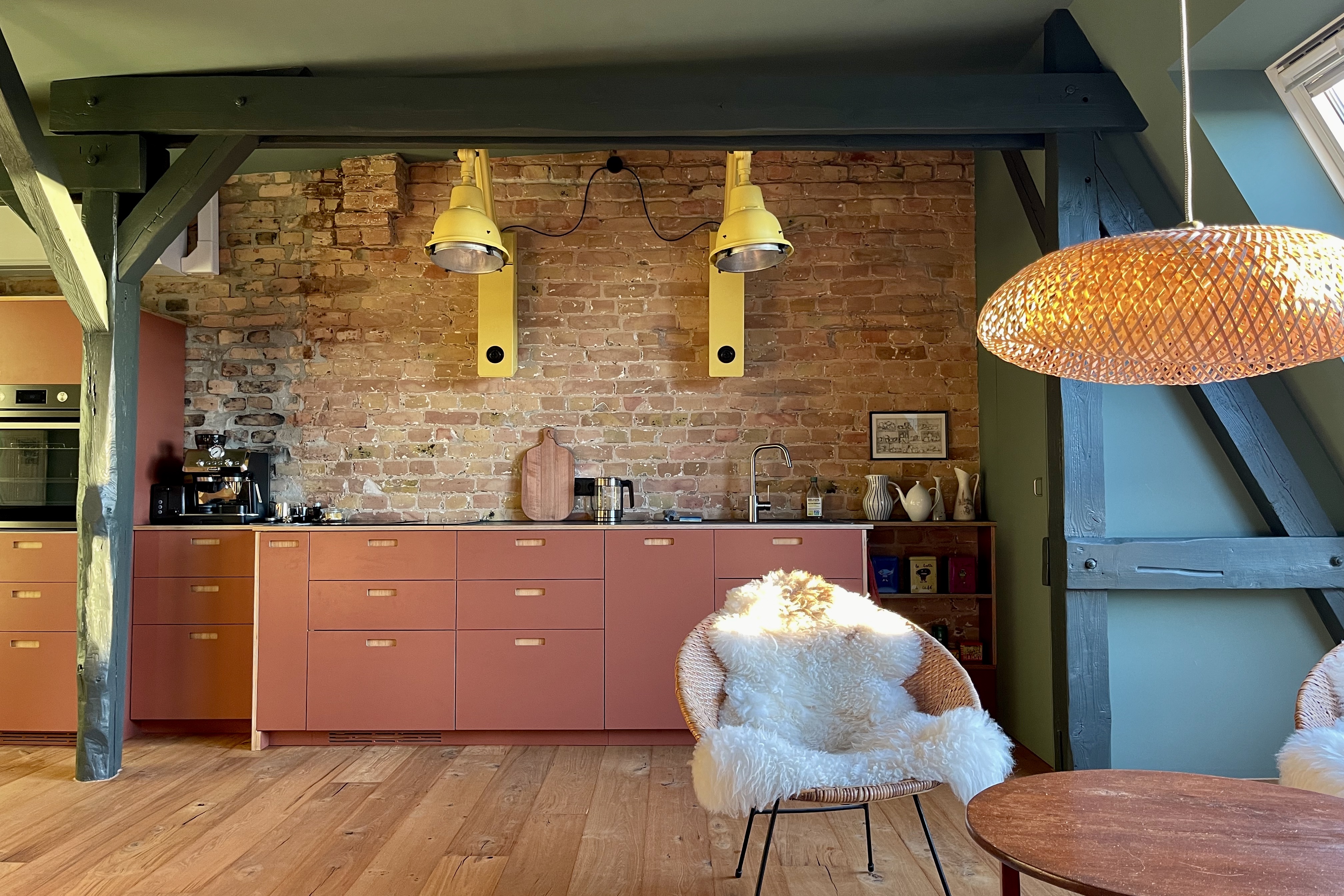 Experience the epitome of urban living in this exquisite loft, combining the allure of rustic modern interiors with the vibrant energy of city life. This loft features a stylish living room adorned with blue furniture, eclectic decor, and expansive windows that flood the space with natural light, creating a warm and inviting atmosphere. The space is versatile, perfect for both relaxation with its cozy armchairs and cowhide rug, and entertainment, highlighted by a striking fireplace and a well-stocked bookshelf.