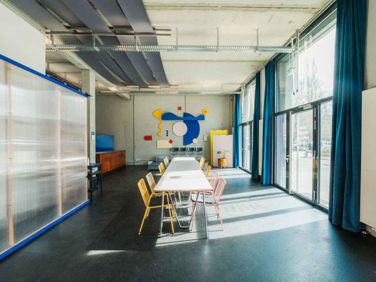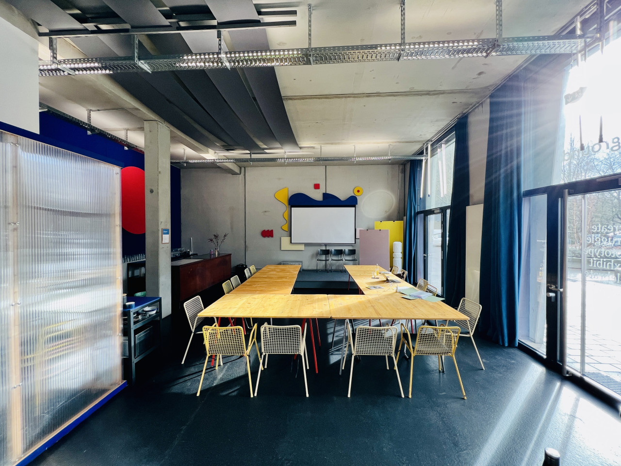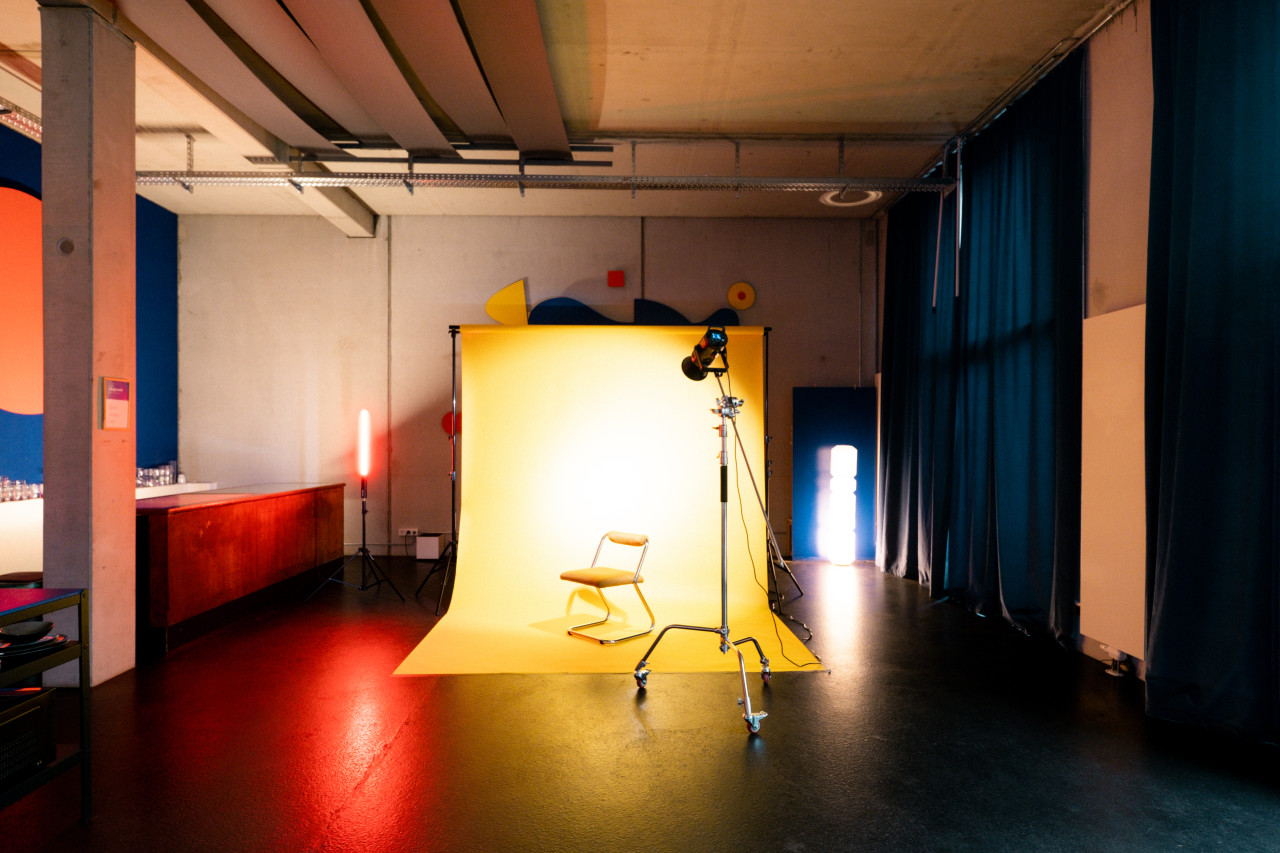 This dynamic and light-filled creative studio is designed to break routine and spark imagination. With its open layout, industrial-chic design, and colorful accents, the space is perfectly suited for film productions, photo shoots, team workshops, and memorable events.