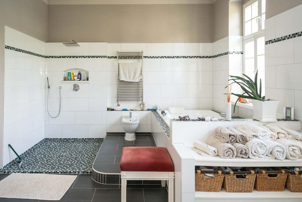 In the past, Villa Achenbach was used by the Police during GDR and after as an artists studio before being extensively renovated by the actual owners. Today it holds 4 floors, a large terrace and an underground garage. As many of the houses built in the 1900, the main entrance is in the mezzanine and there is a specific room for every encounter or event you can think of: A kitchen & kitchen anteroom, a dining room, tv room, a master bedroom with a 26m2 bathroom, an office and 2 guest rooms, one with a private bathroom and an attic.