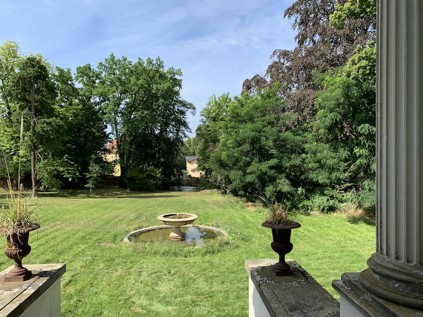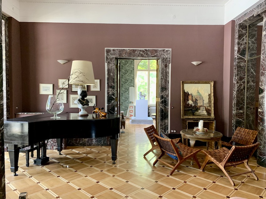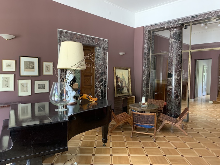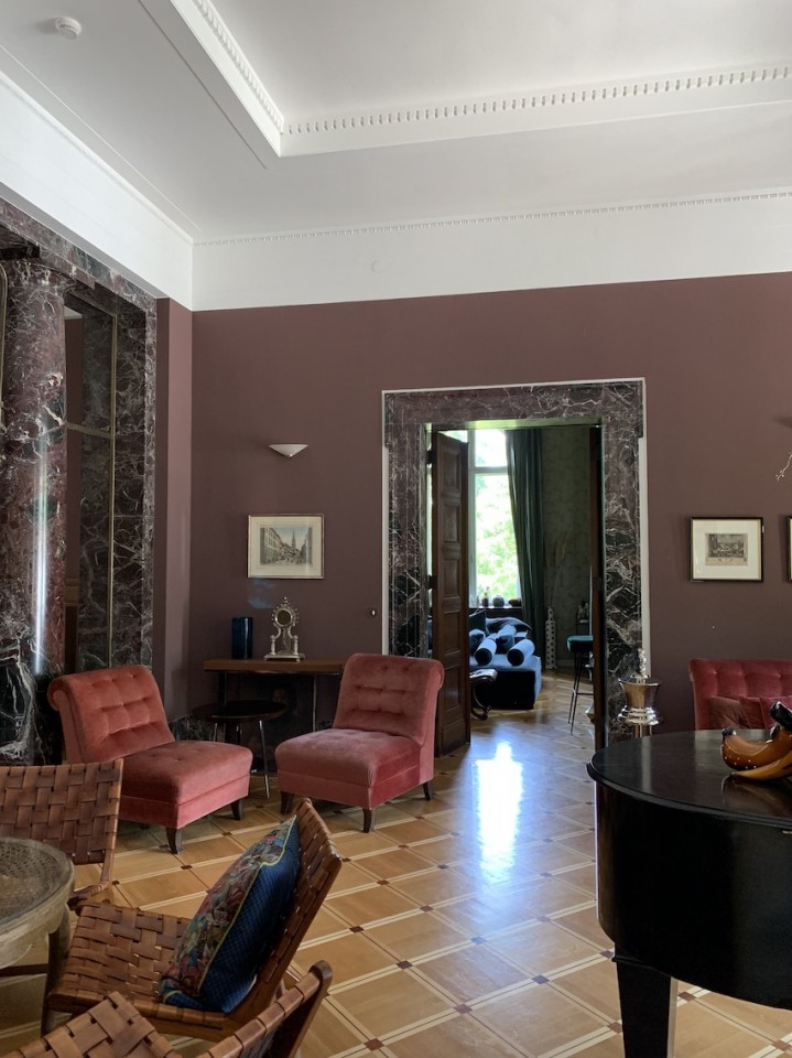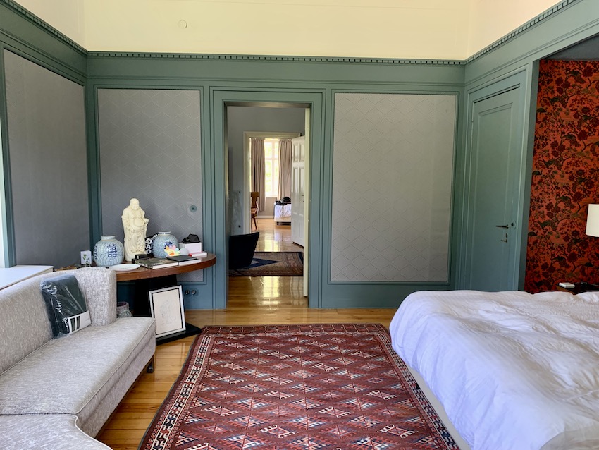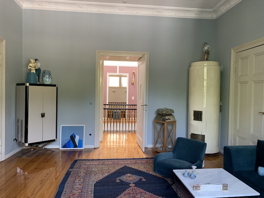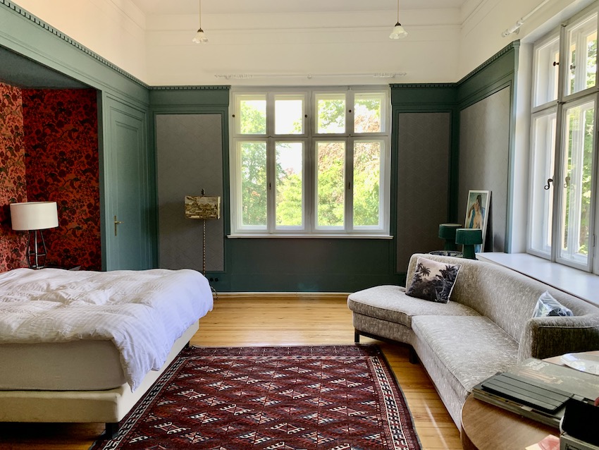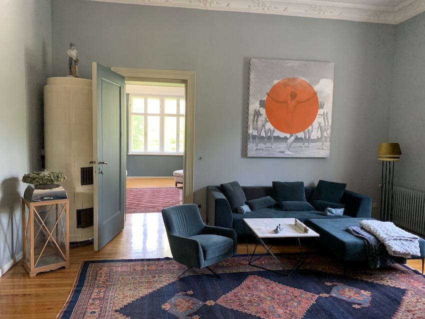 Less than an hours drive from Berlin this beautiful villa stands out at first glance, the greek pillars make a spectacular entree, altbau ceilings and mármol frames embellish the house while the interior design is distinguished for the colour combinations in each room, calm pastel colours like pink and green and a soulful brown. The leather and velvet sofas in each room are plush and inviting. And the pair of legs in the garden will leave in you in total awe.