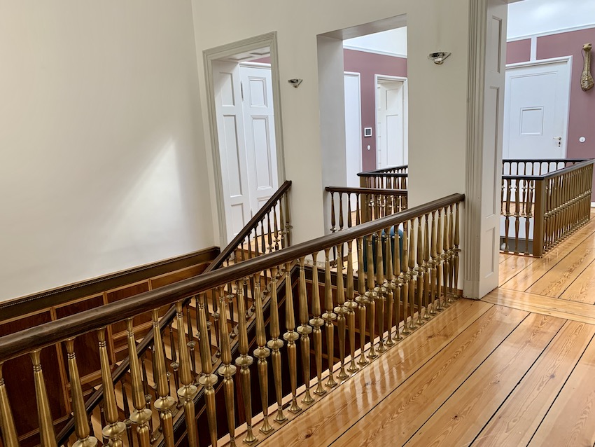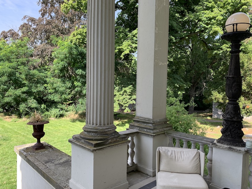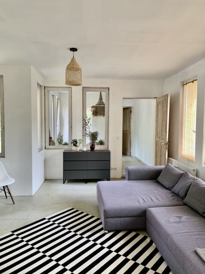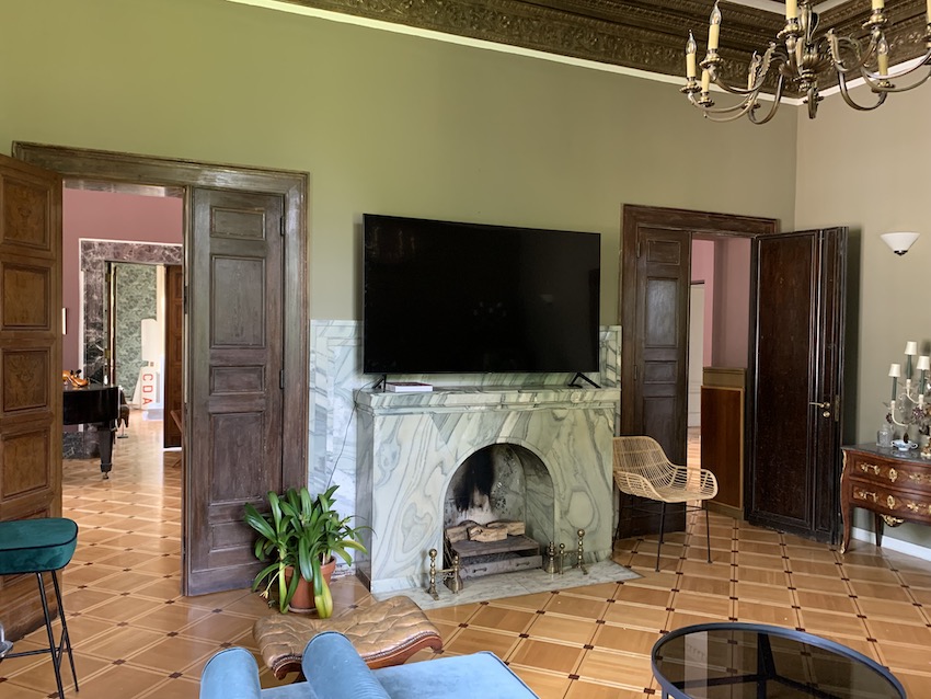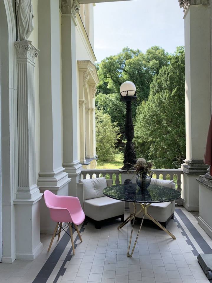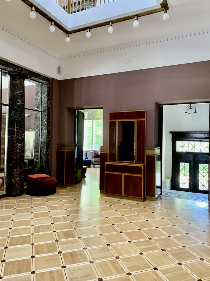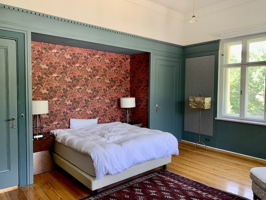 Less than an hours drive from Berlin this beautiful villa stands out at first glance, the greek pillars make a spectacular entree, altbau ceilings and mármol frames embellish the house while the interior design is distinguished for the colour combinations in each room, calm pastel colours like pink and green and a soulful brown. The leather and velvet sofas in each room are plush and inviting. And the pair of legs in the garden will leave in you in total awe.
