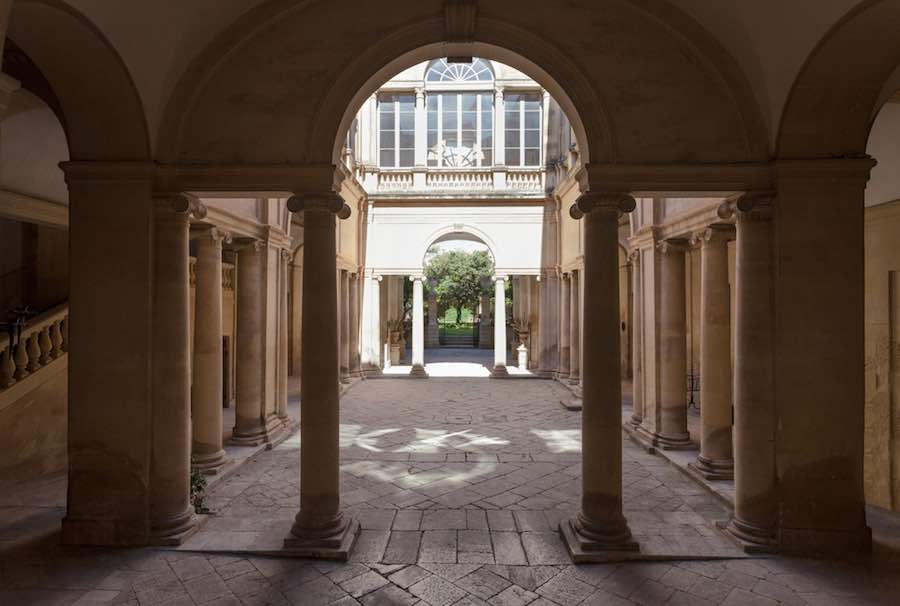 The villa features a majestic courtyard with arched colonnades, stone columns, and noble proportions—perfect for cinematic wide shots, fashion campaigns, and scenes requiring historic elegance. The architecture is classical and grand, evoking Southern Italian heritage and offering symmetrical depth, texture, and shadow for both video and stills.