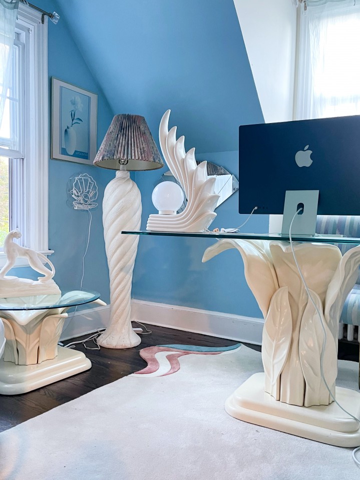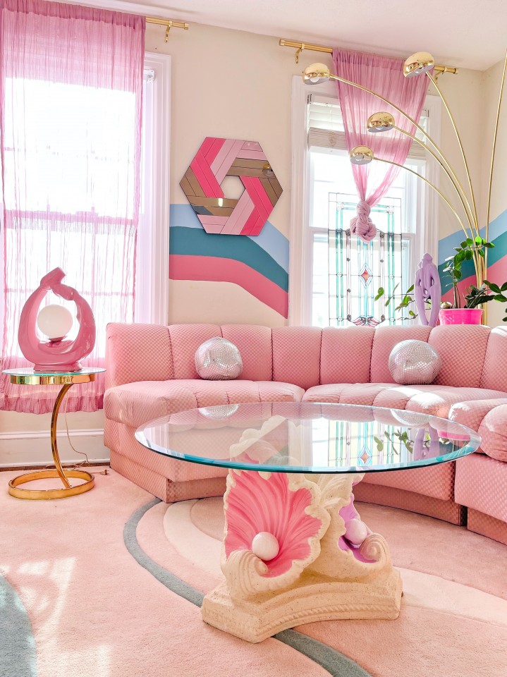 An old farmhouse built in 1890 and converted in 2020 into an 80s time capsule. A pastel paradise using pink, blue, and purple paints by shopping at estate sales and vintage dealers.