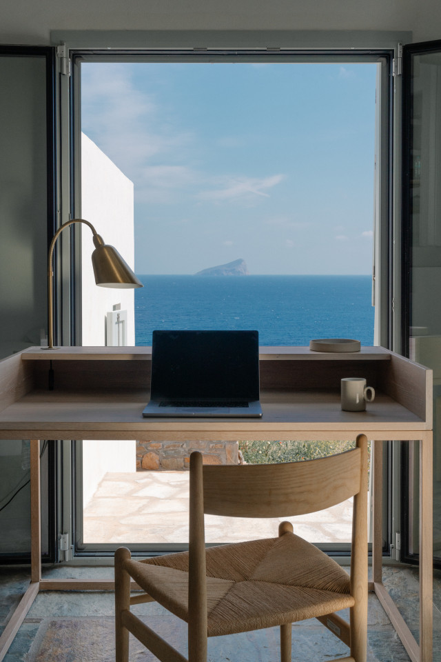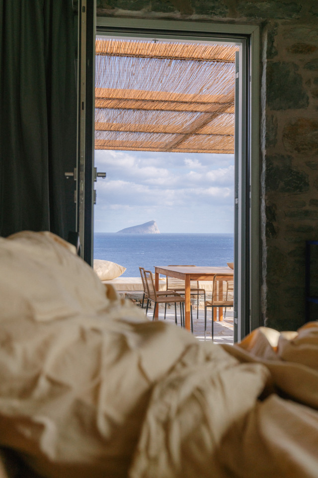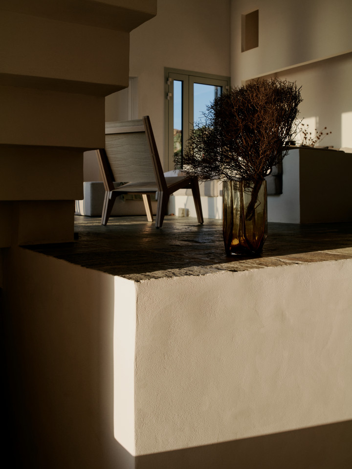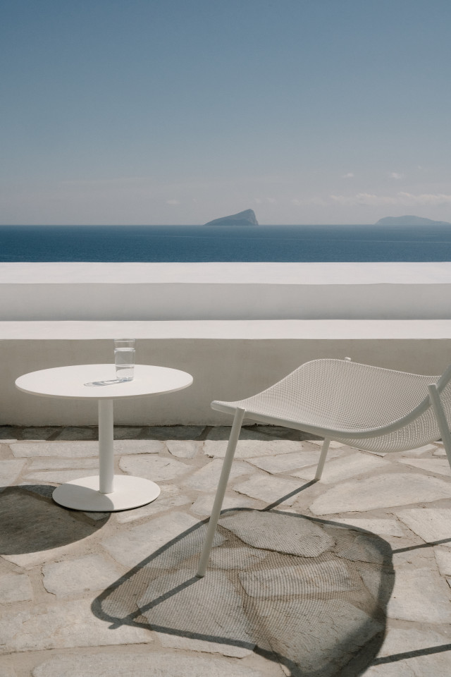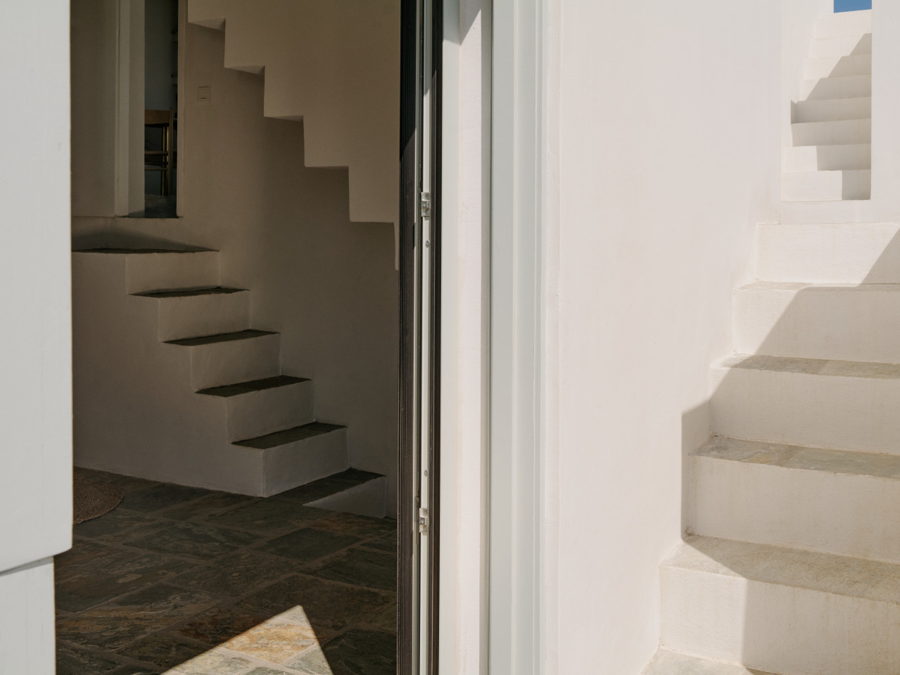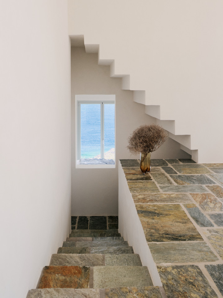Inside and out, the white staircases playfully create a circular flow through the various levels of the house. Drawing inspiration from the work of M.C. Escher, one can move above, below, and through the space in an almost infinite loop of steps. The cluster of four white cubes is nestled into the hillside at varying elevations, offering multiple panoramic views of the surrounding islands. The presence of the Cycladic archipelago and the ever-changing hues of sea and sky can be experienced from every corner of the home. From within, the small, uninhabited Piperi Island is perfectly framed from all three beds, the bathtub, the dining table, and the sofa. The terraces not only connect the different spaces but also emphasize the Mediterranean landscape. Outside, the roofs of the white cubes can be accessed as elevated plateaus above the rocky terrain.