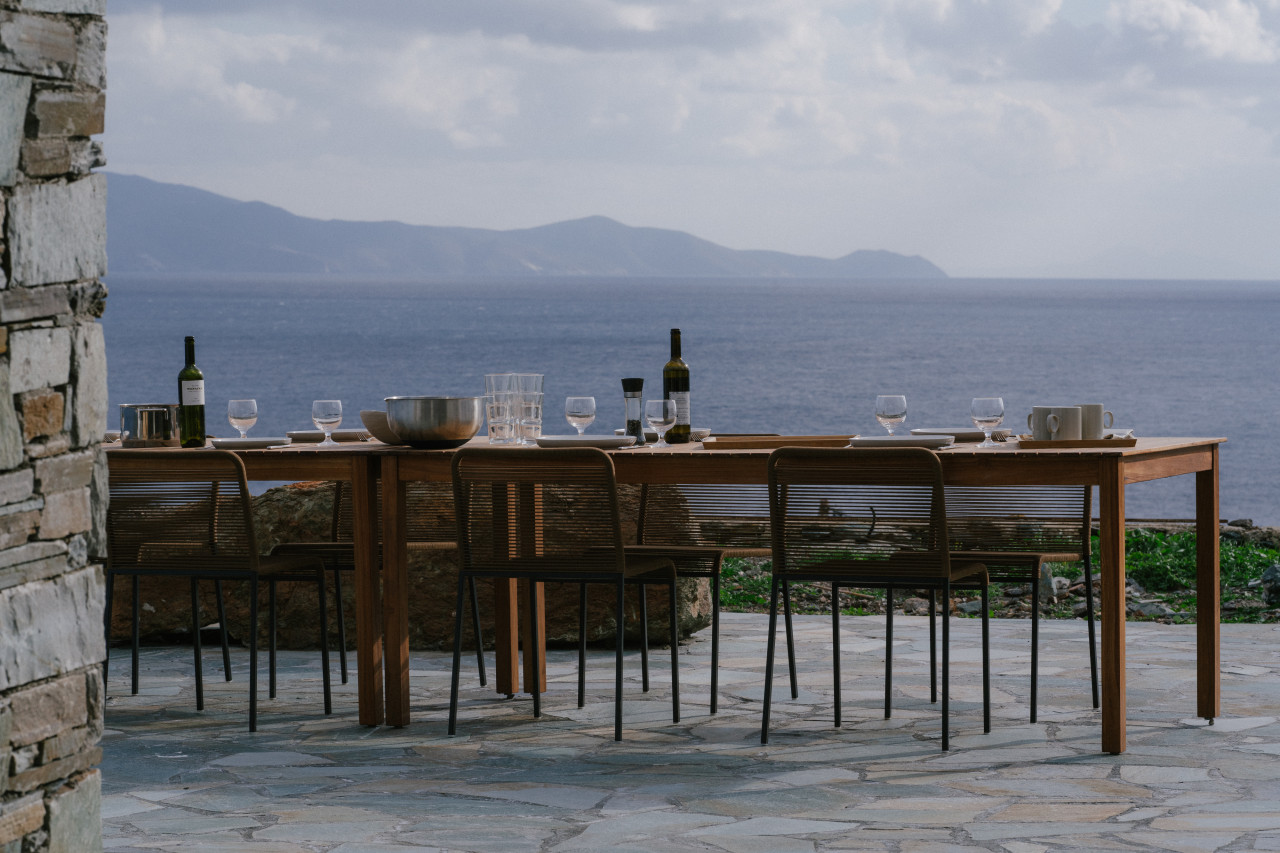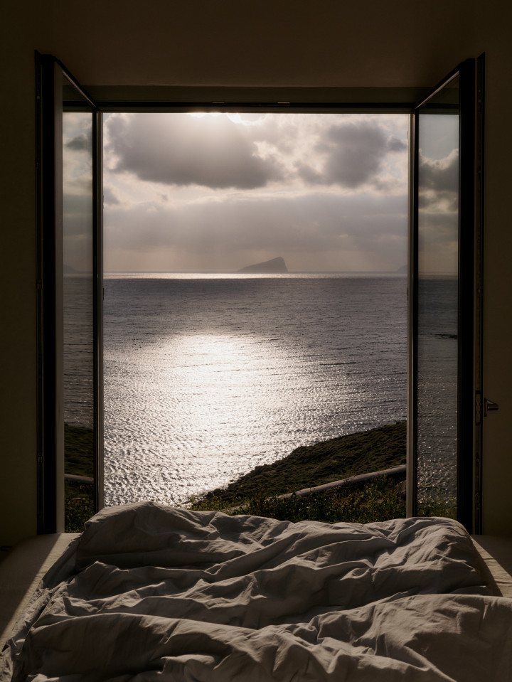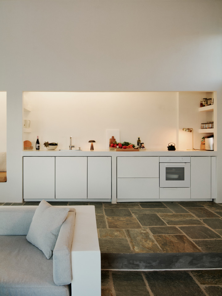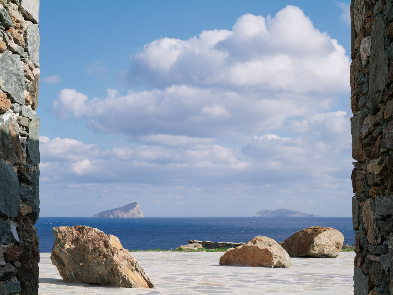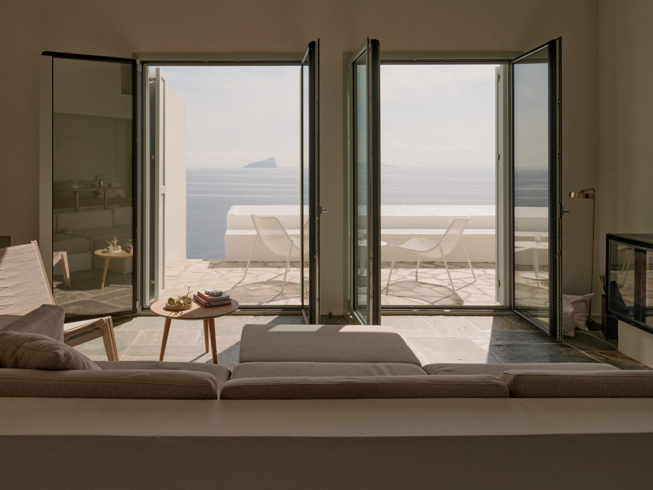 Inside and out, the white staircases playfully create a circular flow through the various levels of the house. Drawing inspiration from the work of M.C. Escher, one can move above, below, and through the space in an almost infinite loop of steps. The cluster of four white cubes is nestled into the hillside at varying elevations, offering multiple panoramic views of the surrounding islands. The presence of the Cycladic archipelago and the ever-changing hues of sea and sky can be experienced from every corner of the home. From within, the small, uninhabited Piperi Island is perfectly framed from all three beds, the bathtub, the dining table, and the sofa. The terraces not only connect the different spaces but also emphasize the Mediterranean landscape. Outside, the roofs of the white cubes can be accessed as elevated plateaus above the rocky terrain.