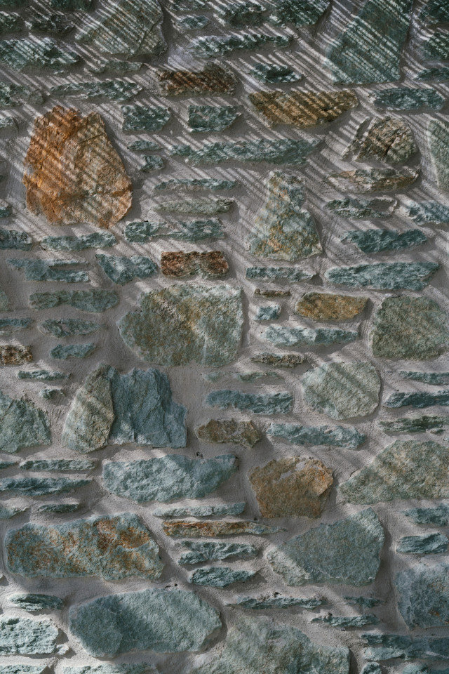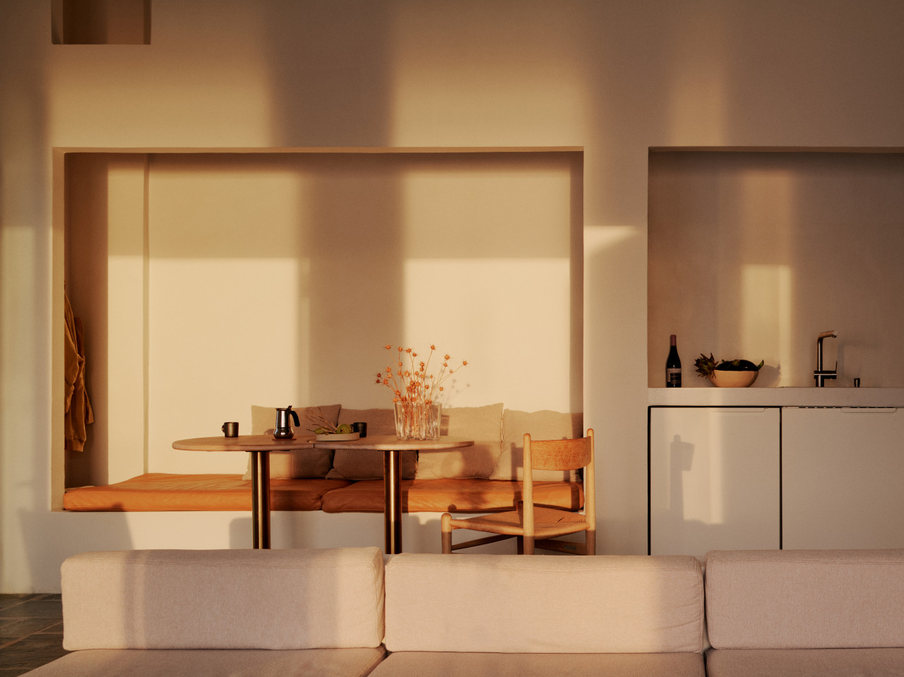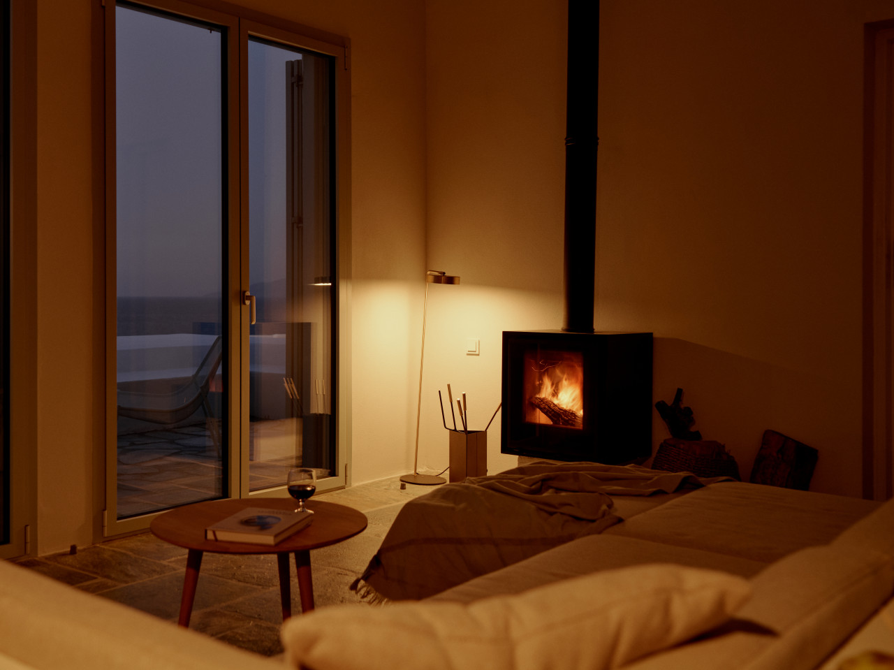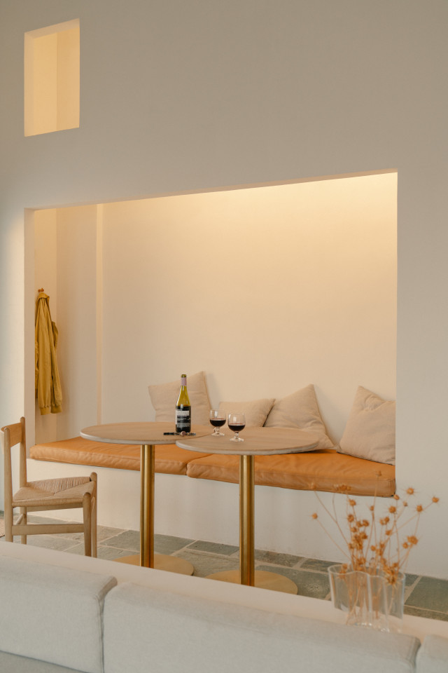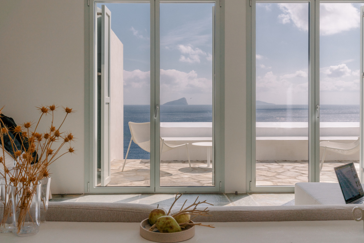 Inside and out, the white staircases playfully create a circular flow through the various levels of the house. Drawing inspiration from the work of M.C. Escher, one can move above, below, and through the space in an almost infinite loop of steps. The cluster of four white cubes is nestled into the hillside at varying elevations, offering multiple panoramic views of the surrounding islands. The presence of the Cycladic archipelago and the ever-changing hues of sea and sky can be experienced from every corner of the home. From within, the small, uninhabited Piperi Island is perfectly framed from all three beds, the bathtub, the dining table, and the sofa. The terraces not only connect the different spaces but also emphasize the Mediterranean landscape. Outside, the roofs of the white cubes can be accessed as elevated plateaus above the rocky terrain.