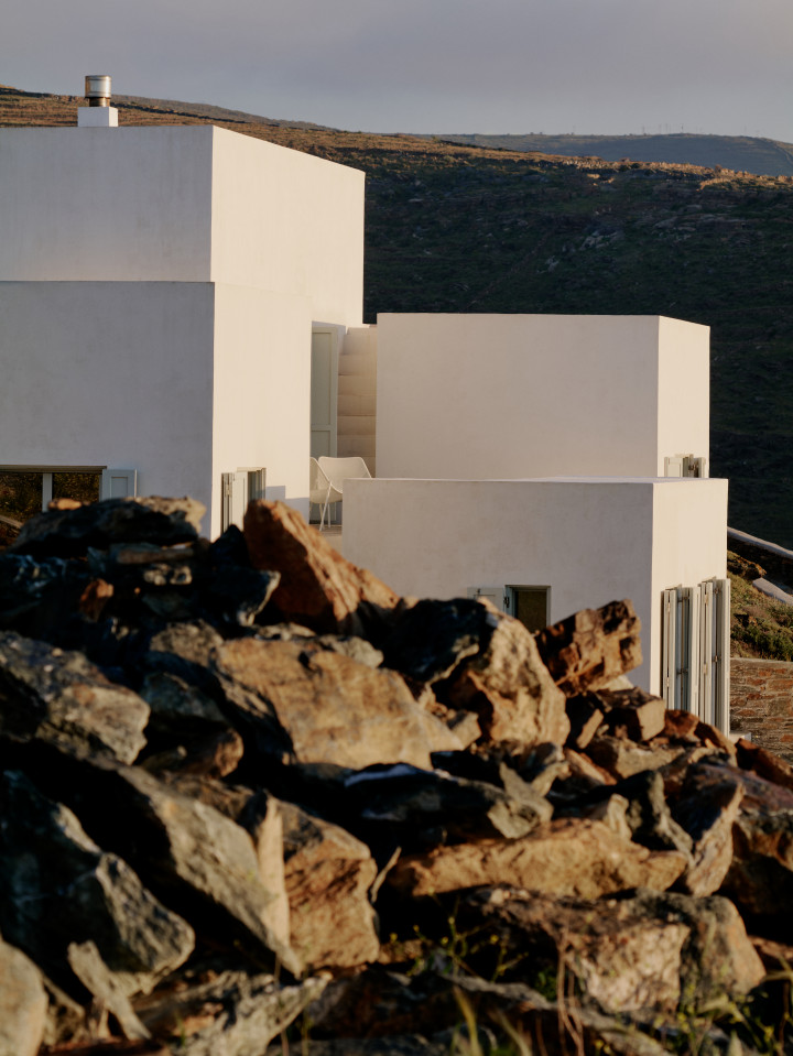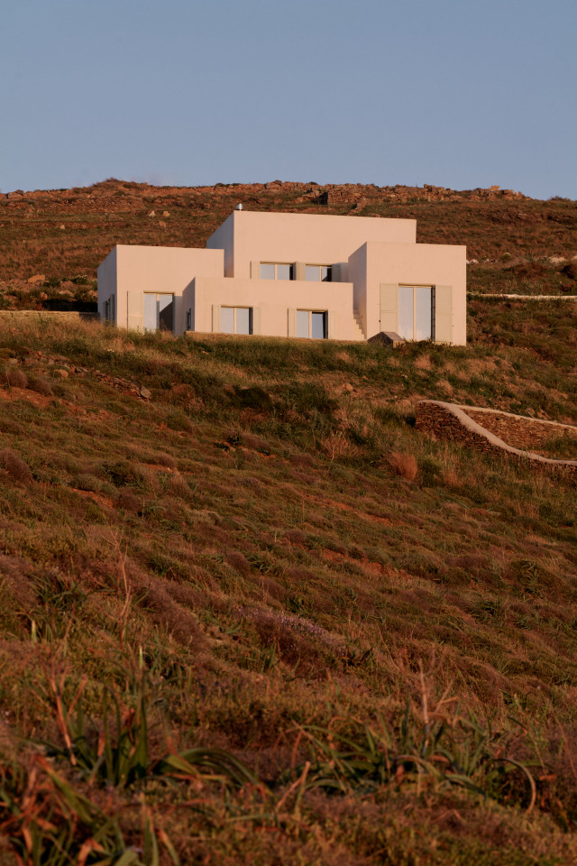 This wonderful hillside house is located on a small peninsula that extends from Kythnos Island into the Aegean Sea, overlooking the Cycladic archipelago. Inspired by traditional Cycladic villages, the house is composed of vernacular white cubes connected by stepped white alleys. Like a crystalline sculpture carved from a single piece of white stone, its monolithic volumes stand in striking contrast to the dry landscape of burnt browns and muted greens.