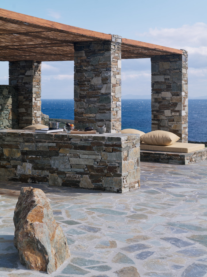 The property continues over the ridge of the hill, where a small guest house is built into a restored stone barn, complete with an outdoor kitchen and pergola. Throughout the day, one can migrate from sunrise at the main house on the eastern cliffs to sunset at the outdoor kitchen overlooking the beach to the southwest.
