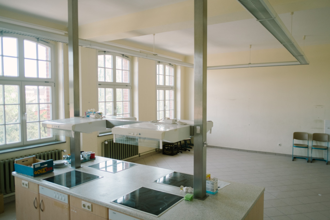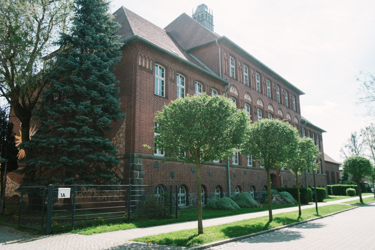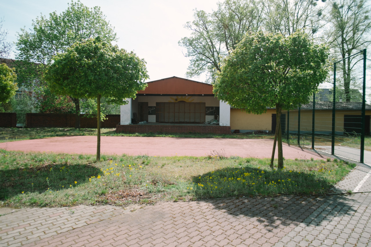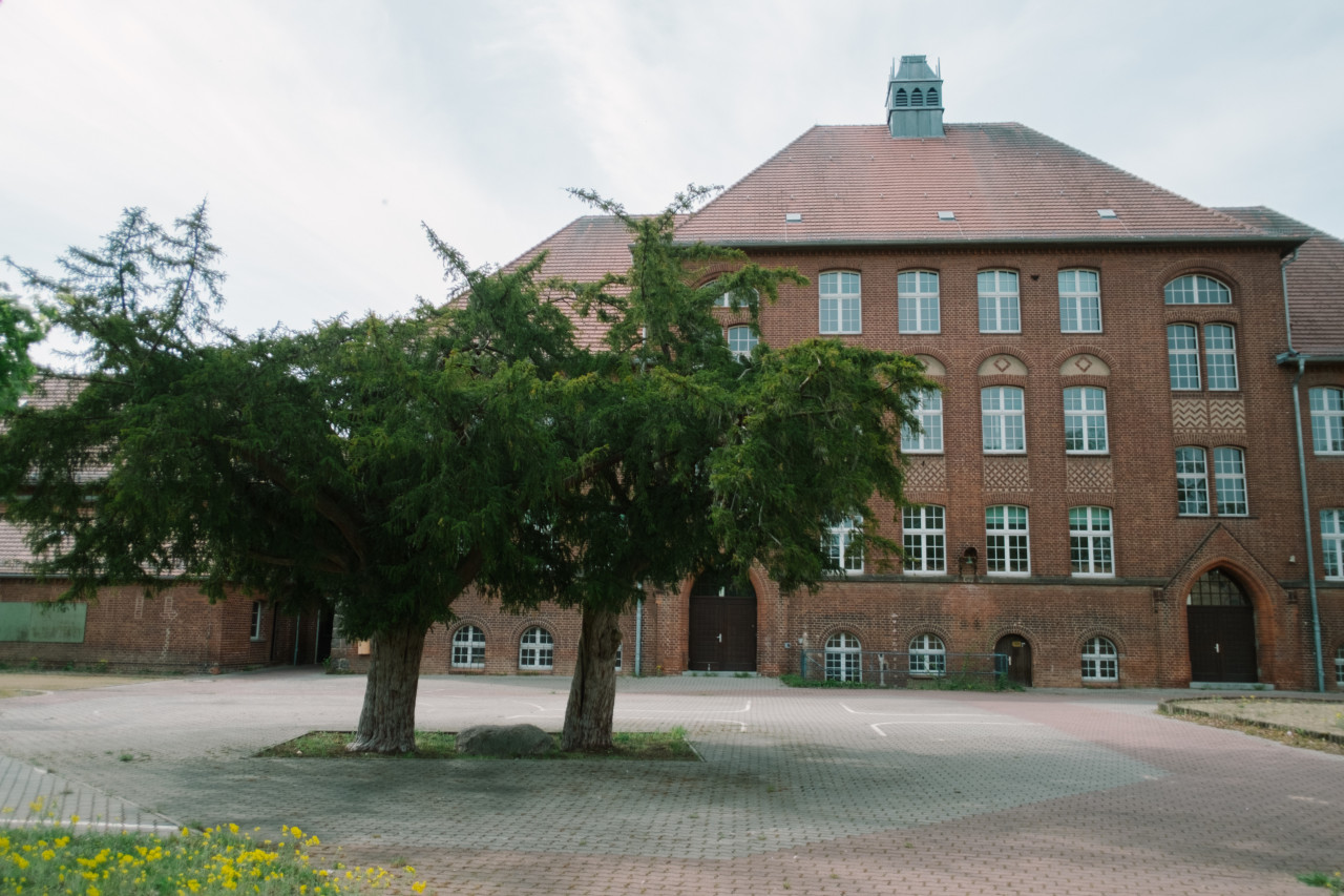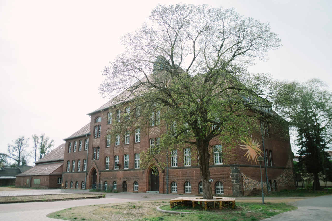This historic school designed by Georg Dinklage in 1909 has transitioned from educational use to a space for cultural events, coworking, and living. The building features a brick facade, four floors with 29 rooms, and an extension housing a sports hall with a green-painted gabled roof. The grounds include a spacious yard with a stage and a garden area. Available for events and shoots, it will undergo construction starting in 2025.