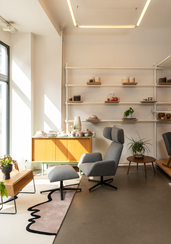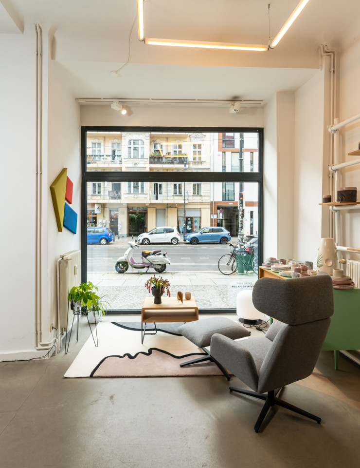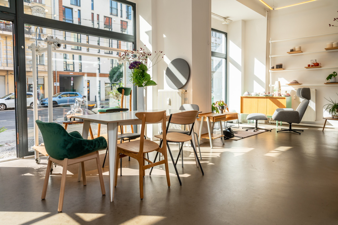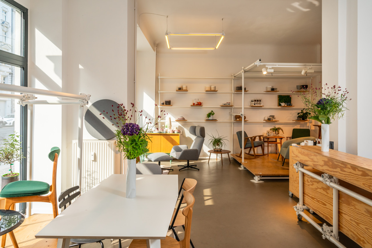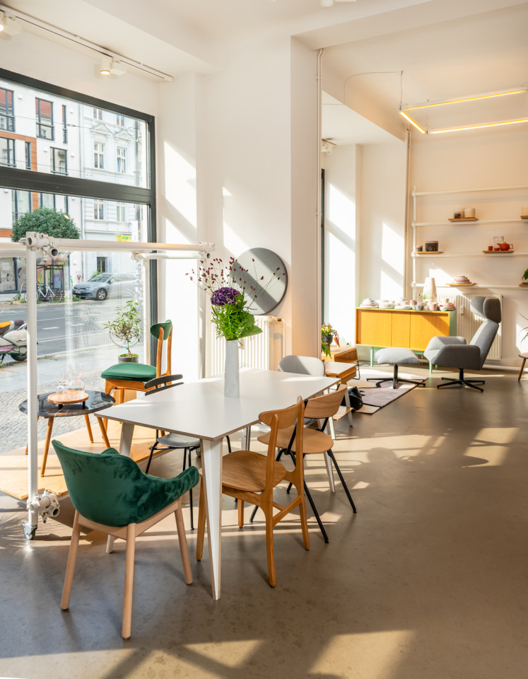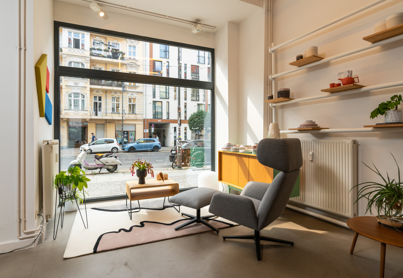 With its orderly shelving, elegant arrangement of ceramics and books, and seamless blend of polished, fabric, and velvety textures, the setting evokes a modern design studio or boutique café, perfectly attuned to creative industry demands. The marriage of urban street views with an atmosphere of calm openness renders the space highly photogenic, offering versatile backdrops for still and moving image work. This environment, both inviting and quietly dramatic, is ideally suited for artistic collaborations, product launches, styled shoots, and brand-driven events seeking an elevated, design-conscious setting.