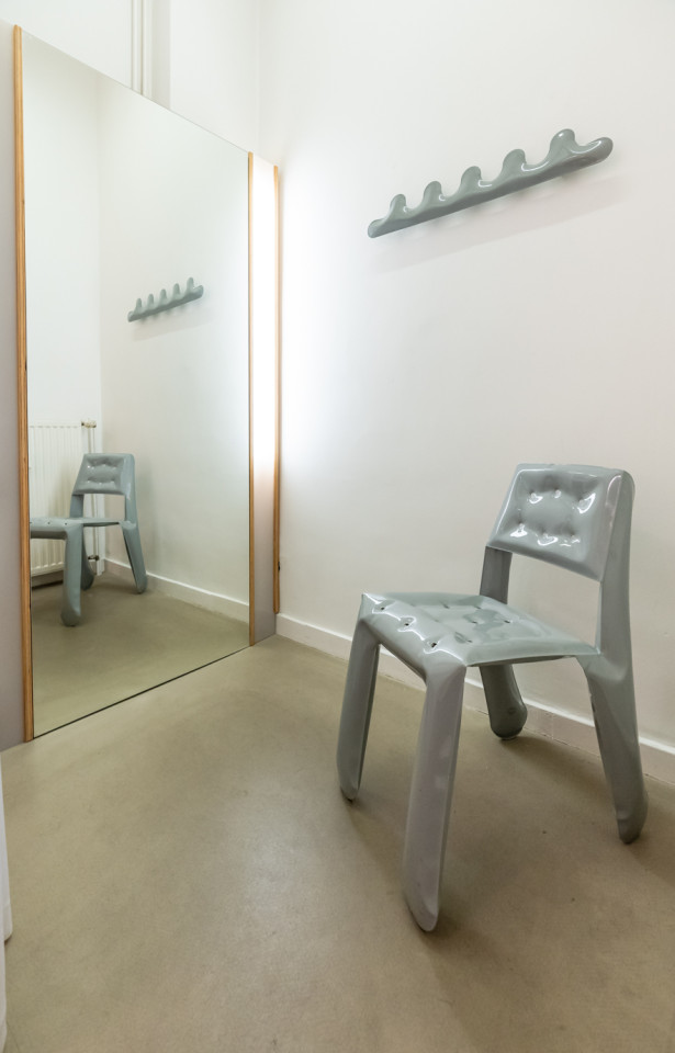 A study in modern minimalism and thoughtful curation, this refined urban space unfolds across a meticulously composed interior of matte ceramics, sculptural wooden furniture, and expansive glass. Sunlight streams through generous windows, illuminating curated vignettes of colorful designer chairs, textured rugs, and lush greenery set against a palette of soft gray, crisp white, and natural wood grain. The interplay of reflective and matte surfaces, punctuated by geometric wall art and sculptural mirrors, creates a sense of depth and subtle drama—inviting the eye to linger on every detail.